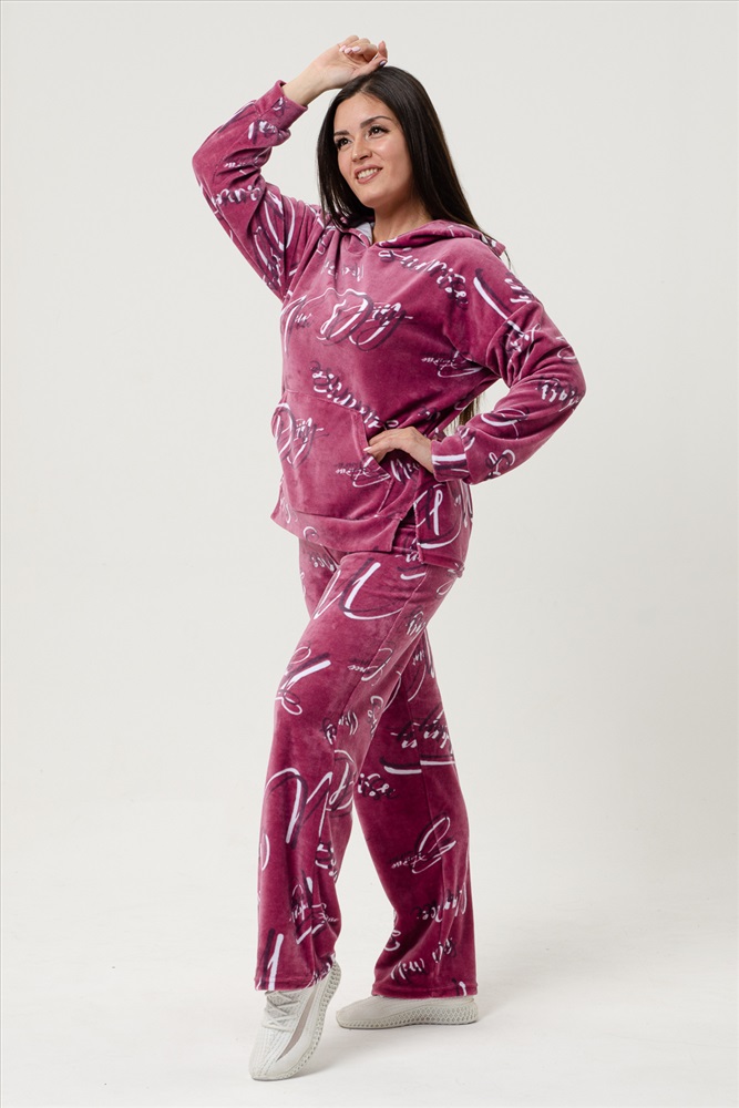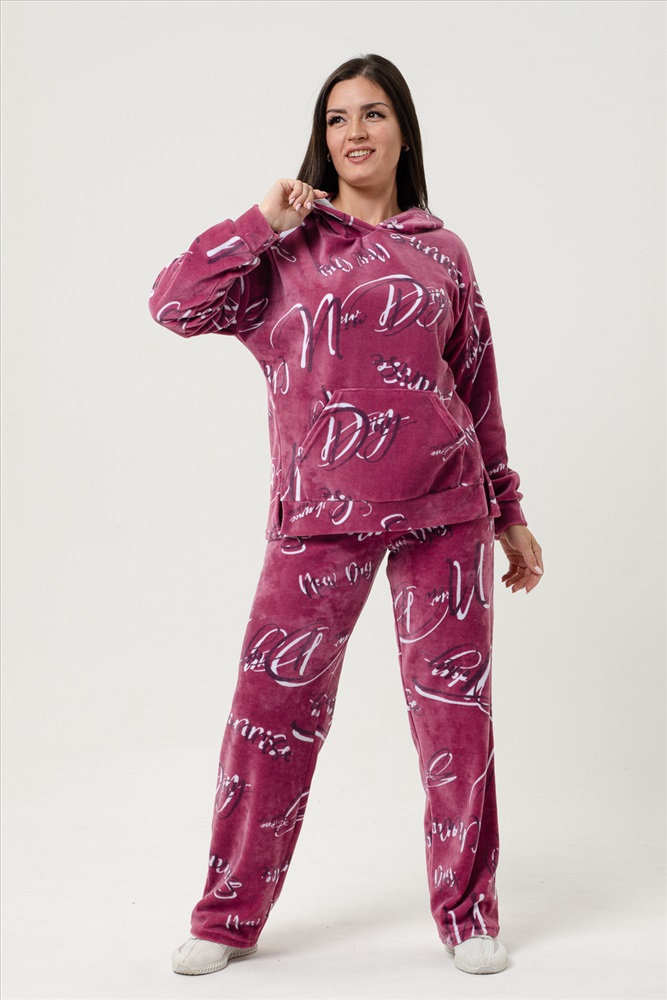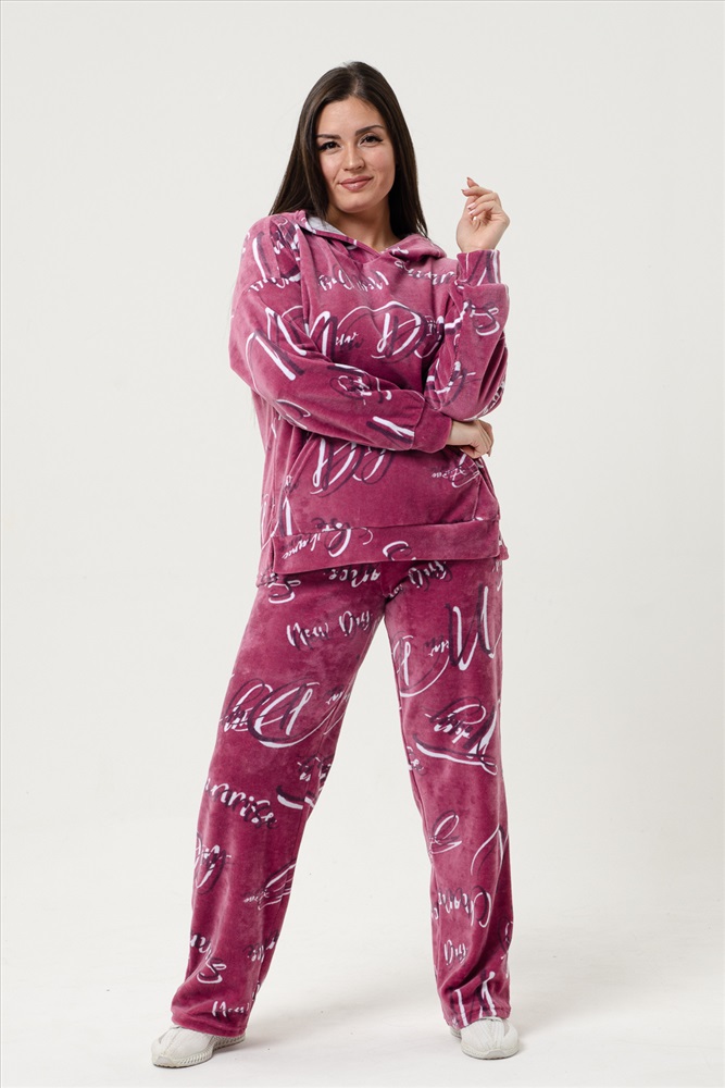 Застежка: без застежки Костюм женский с брюками, толстовка с капюшоном, карманом-кенгуру. Боковой шов плавна переходит на перед, внизу которого небольшие разрезы. На передней половинке внизу пояс. Длинный рукав с манжетом. Брюки-трубы с удобной посадкой. Костюм уютный, теплый для дома и отдыха в прохладное время года.