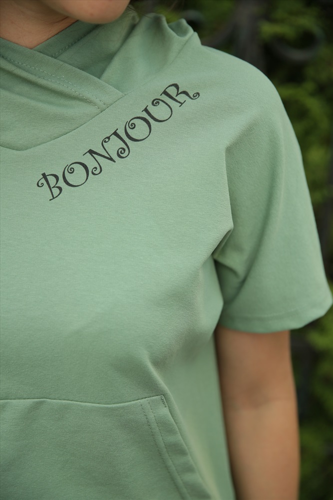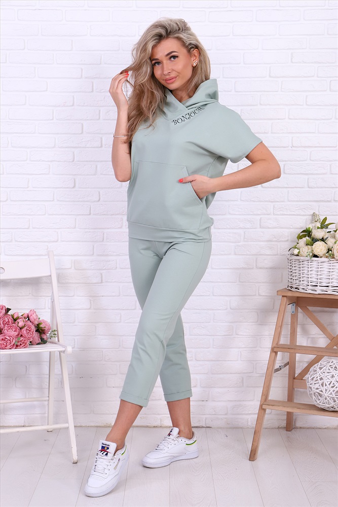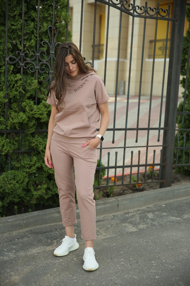 Застежка: без застежки Молодежный костюм с капюшоном. Кофта свободного кроя, карман кенгуру. Неброская печать возле капюшона. Рукав спущенный. Брюки укороченные с манжетом. Карман с подкроенным бочком. Модный стильный костюмчик на любой вкус.
