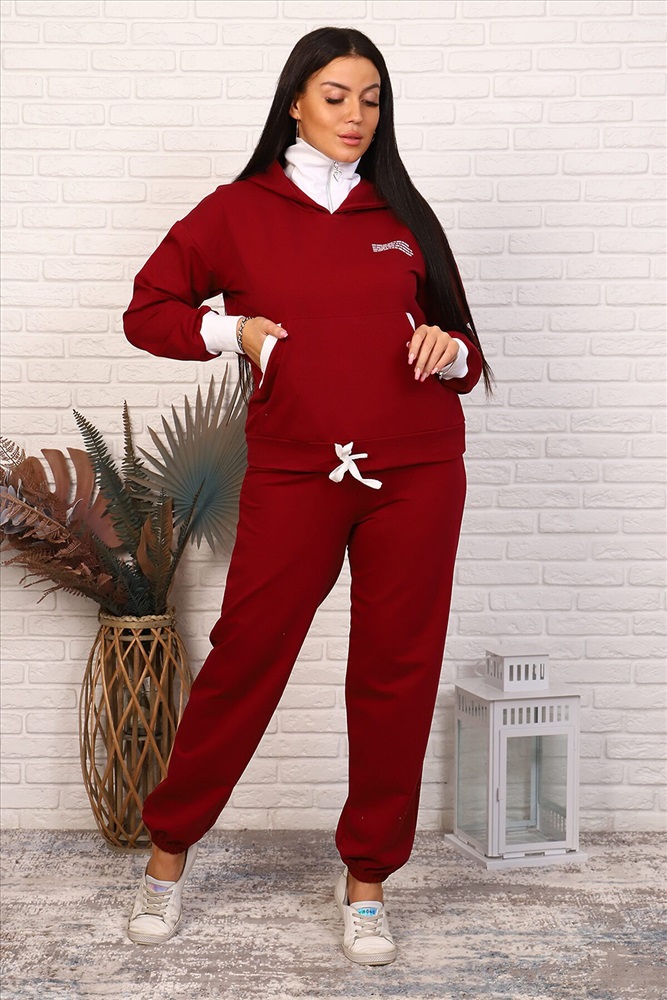 Костюм женский из приятной ткани. Костюм с капюшоном и воротником на молнии, что делает костюм особенно красивым и удобным в любую погоду. Карман кенгуру с отделочными обтачками. Рукав с манжетом из отделочной ткани. Брюки свободные на резинке, низ брюк также на резинке. Подойдет девушкам любого возраста