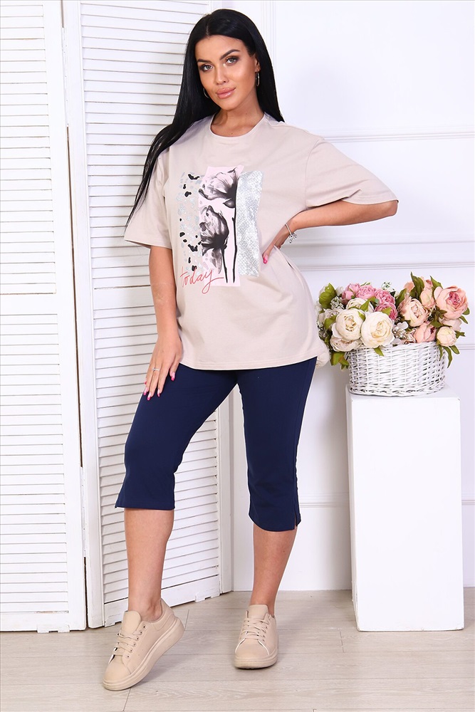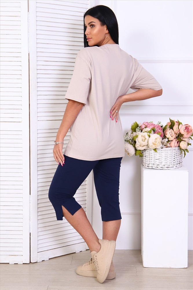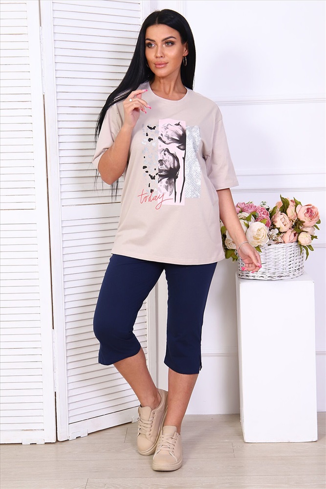 Домашний женский костюм с бриджами из кулирки. Футболка свободного покроя, с короткими спущенными рукавами. Горловина выполнена в форме лодочки, отделана кантом. На полочке красивая печать. Бриджи на резинке до середины икр, по бокам разрезы.