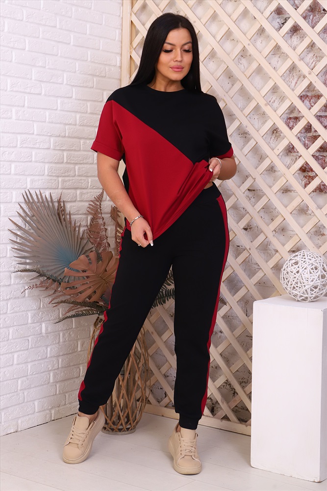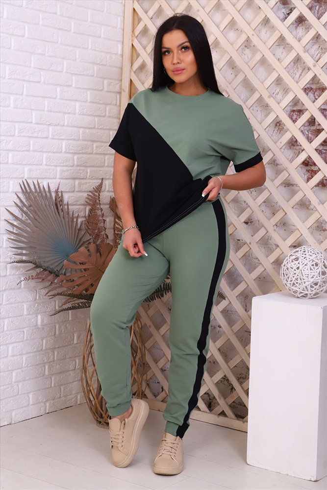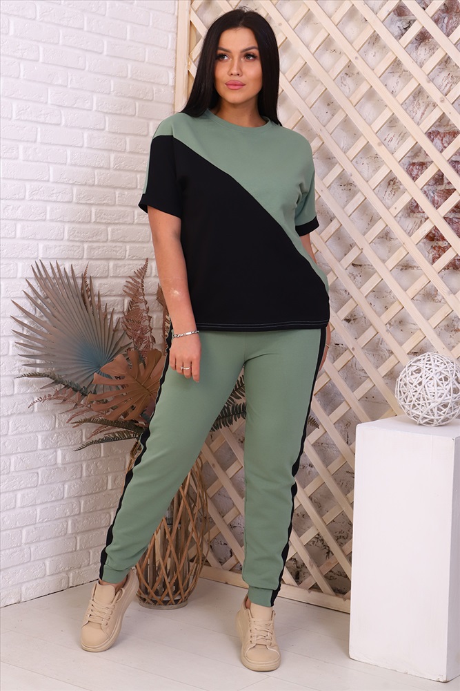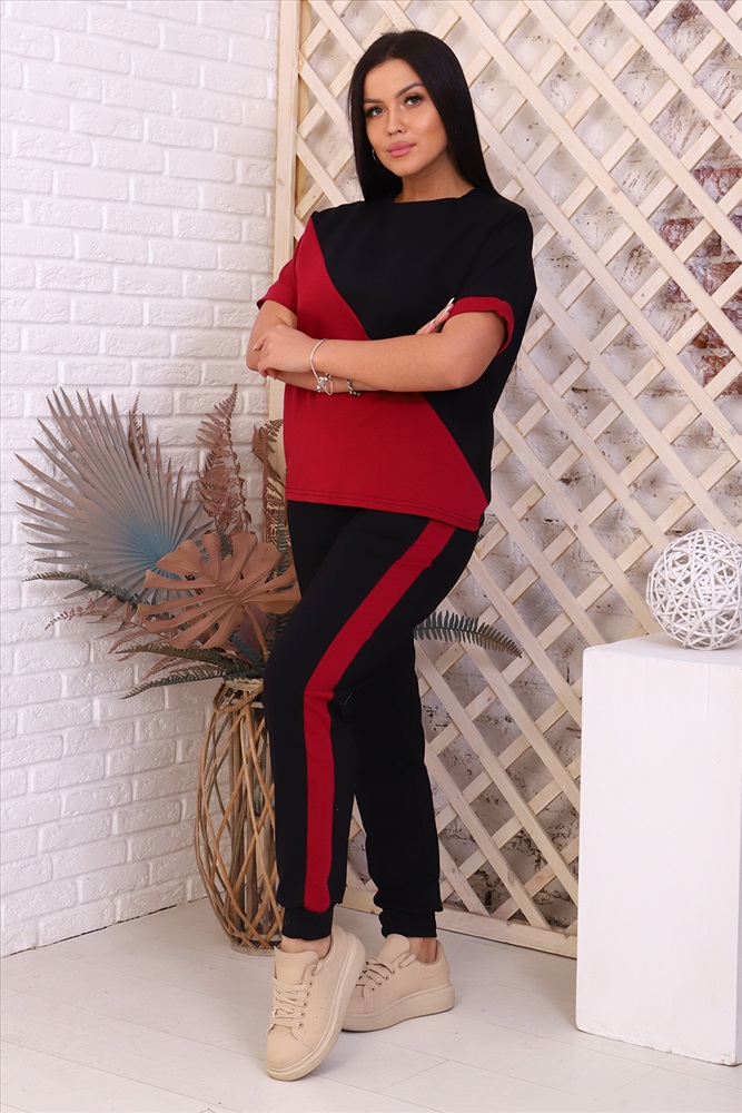 Застежка: без застежки Костюм женский - туника со спущенным рукавом и контрастными вставками, свободный крой, брюки без карманов, по бокам лампасы
