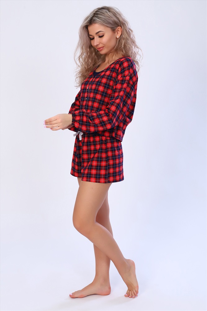 Застежка: кнопка Ищите пижаму для себя, для подарка или домашних времяпрепровождений? Тогда наш комплект в классическую клетку из 100% хлопка - это тот самый идеальный вариант. Домашний костюм 3-ка включает в себя рубашку, майку и свободные шортики. Рубашка укороченная с V-образным вырезом, длинным рукавом на резинке и застёжкой на кнопки, что добавляет больше удобства и комфорта. Майка классическая, однотонная, без рукава. Шорты на резинке, свободные, укороченные и декорированы бантиком. Мягкий и приятный к телу костюмчик придется по вкусу ценителям уюта и роскоши. Данный костюм Вы можете приобрести с брюками 36600 или полностью весь комплект 4-ка 36601.