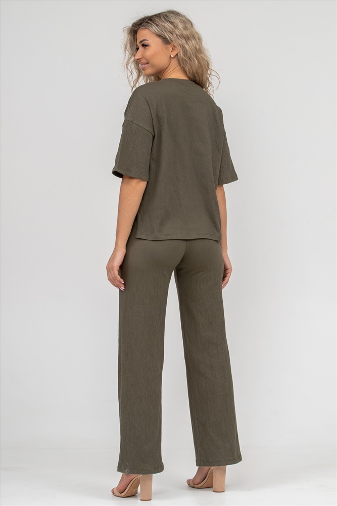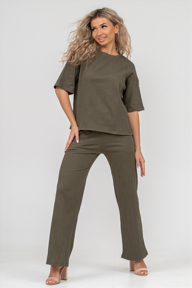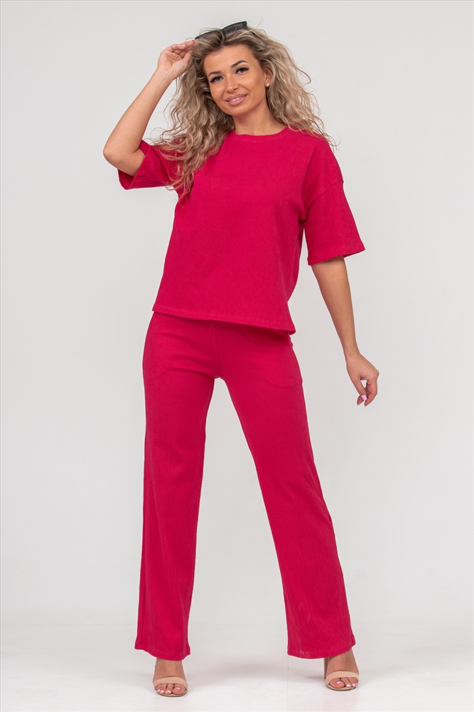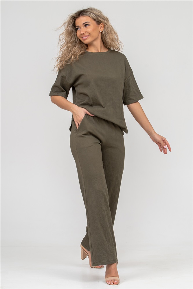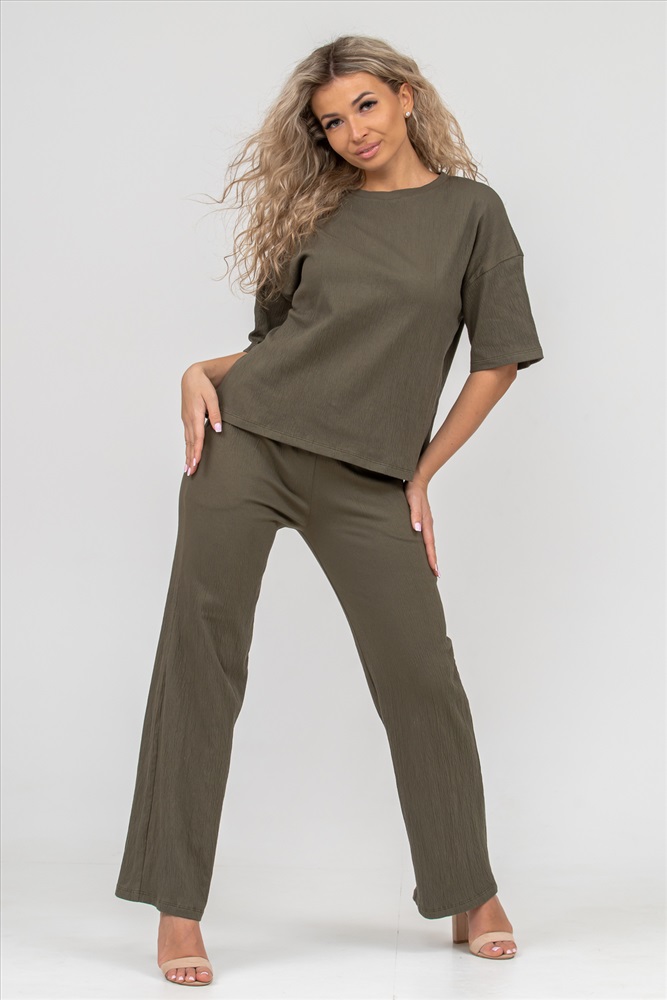 Состав: 88% хлопок; 10% п/э; 2% лайкра Модель: Костюм 36646 Тип товара: костюм с брюками Материал: жатка | жатка Бренд: Натали Суслова Карман: боковые Отделка: с карманами Посадка: высокая посадка Рейтинг: Рейтинг 4 и выше Рисунок: однотонные Рукав: короткий рукав Сезонность: лето | осень | весна | зима Силуэт: прямой | свободный Стиль: молодежный | повседневный Воротник: без воротника Застежка: без застежки Модный стильный костюм - идеальное решение для тех, кто ищет лёгкую и красивую одежду на каждый день. Костюм, футболка и брюки, выполнен из кулирки гипе жатка компакт. Жатка - это ткань с мятой структурой, декоративными заломами и складками. Имеет много положительных качеств: хорошо тянется, упругая, красивая текстура, неприхотливая в уходе, прочная, износостойкая, не мнётся, не нуждается в глажке и приятная к телу. Футболка выполнена со спущенным рукавом, отстроченной обтачкой по горловине и двумя небольшими разрезами по бокам. На брюках имеется два вместительных боковых кармана и пояс, обработанный на специализированной поясной машине. Данная модель костюма очень удобна в качестве повседневной одежды, а универсальный фасон хорошо скроет недостатки и подчеркнет достоинства фигуры. Свободный крой комплекта двойки не сковывает движения, что делает его очень удобным в носке, резинка не перекручивается, а высокая посадка брюк - палаццо даёт ощущение комфорта. Такой костюм можно использовать как в качестве костюма для фитнеса, так и как вариант домашнего костюма, в нем также можно поехать на дачу или отправиться на вечернюю прогулку. Однотонный дизайн летнего брючного костюма без принта, надписей и декоративных элементов будет гармонировать с любым стилем одежды, а дополнить образ с модным костюмчиком можно любимыми аксессуарами и украшениями. Свободную футболку и брючки можно носить как вместе, так и отдельно. Футболку с коротким рукавом и разрезами по бокам можно легко сочетать с джинсами, юбками и шортами. К брюкам с карманами можно также подобрать любой верх. Образ с костюмом можно дополнить кроссовками, кедами или туфлями. Мягкий, прочный, хлопковый материал не дает усадку, не теряет форму после стирки и не линяет, его можно стирать в режиме бережной стирки при 30 градусах. Также данный трикотажный костюм не скатывается и не вытягивается за счет небольшого количества полиэстера в составе. Такой однотонный костюм с широкими брюками подойдет для разной возрастной категории. Он идеально подойдет для беременных и мам с детьми. Хорошо сядет на высоких и невысоких представительницах прекрасного пола всех возрастов. Такой универсальный прогулочный женский костюм станет отличным подарочным вариантом, его можно подарить маме, дочери, жене, бабушке, подруге или порадовать себя любимую даже без повода. Наш костюм благодаря своей практичности и лаконичному дизайну будет служить Вам долгие годы. Ориентируясь по таблице замеров, обратите внимание, что замеры длины рукава проводились от точки основания шеи. Таблица размеров и весафутболка