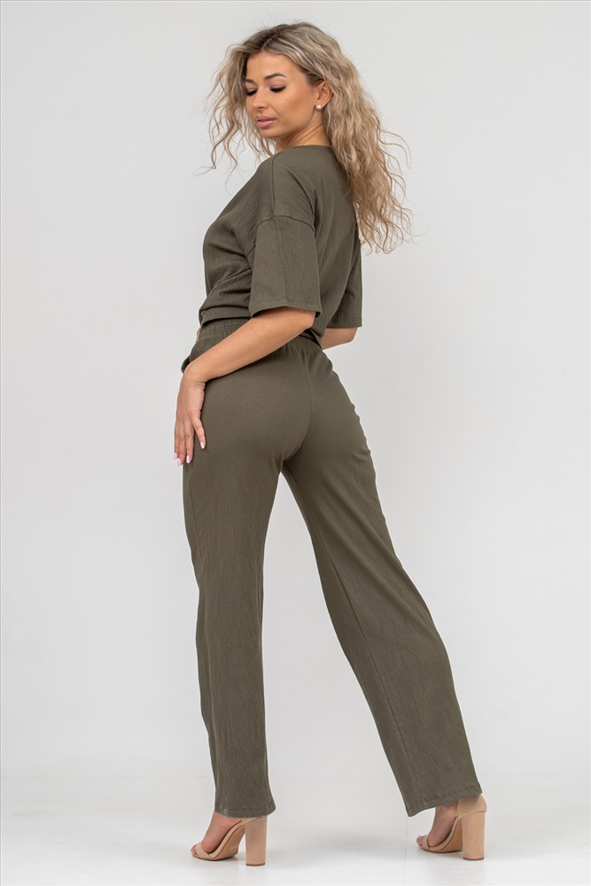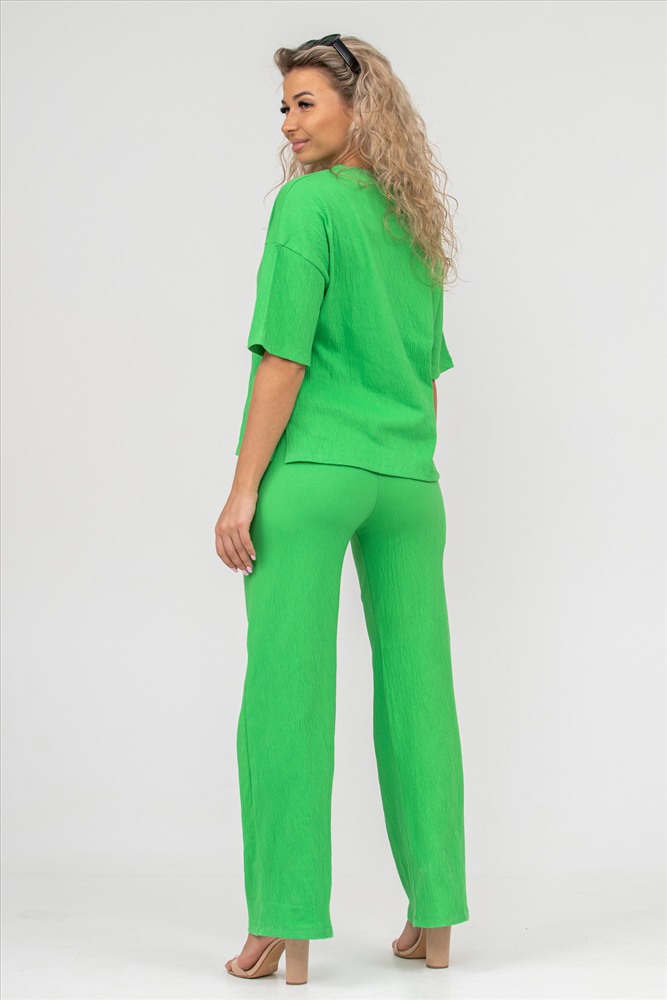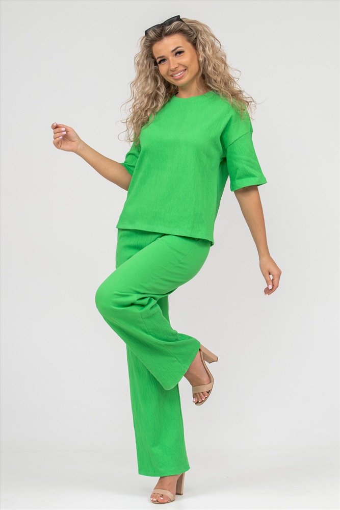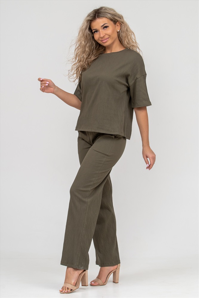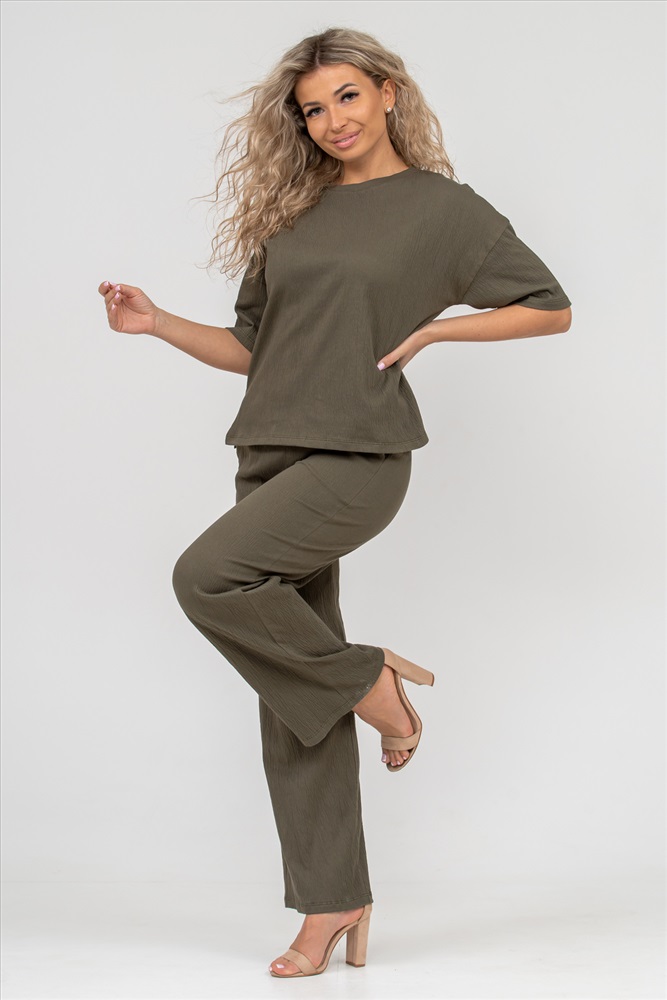 Состав: 88% хлопок; 10% п/э; 2% лайкра Модель: Костюм 36646 Тип товара: костюм с брюками Материал: жатка | жатка Бренд: Натали Суслова Карман: боковые Отделка: с карманами Посадка: высокая посадка Рейтинг: Рейтинг 4 и выше Рисунок: однотонные Рукав: короткий рукав Сезонность: лето | осень | весна | зима Силуэт: прямой | свободный Стиль: молодежный | повседневный Воротник: без воротника Застежка: без застежки Модный стильный костюм - идеальное решение для тех, кто ищет лёгкую и красивую одежду на каждый день. Костюм, футболка и брюки, выполнен из кулирки гипе жатка компакт. Жатка - это ткань с мятой структурой, декоративными заломами и складками. Имеет много положительных качеств: хорошо тянется, упругая, красивая текстура, неприхотливая в уходе, прочная, износостойкая, не мнётся, не нуждается в глажке и приятная к телу. Футболка выполнена со спущенным рукавом, отстроченной обтачкой по горловине и двумя небольшими разрезами по бокам. На брюках имеется два вместительных боковых кармана и пояс, обработанный на специализированной поясной машине. Данная модель костюма очень удобна в качестве повседневной одежды, а универсальный фасон хорошо скроет недостатки и подчеркнет достоинства фигуры. Свободный крой комплекта двойки не сковывает движения, что делает его очень удобным в носке, резинка не перекручивается, а высокая посадка брюк - палаццо даёт ощущение комфорта. Такой костюм можно использовать как в качестве костюма для фитнеса, так и как вариант домашнего костюма, в нем также можно поехать на дачу или отправиться на вечернюю прогулку. Однотонный дизайн летнего брючного костюма без принта, надписей и декоративных элементов будет гармонировать с любым стилем одежды, а дополнить образ с модным костюмчиком можно любимыми аксессуарами и украшениями. Свободную футболку и брючки можно носить как вместе, так и отдельно. Футболку с коротким рукавом и разрезами по бокам можно легко сочетать с джинсами, юбками и шортами. К брюкам с карманами можно также подобрать любой верх. Образ с костюмом можно дополнить кроссовками, кедами или туфлями. Мягкий, прочный, хлопковый материал не дает усадку, не теряет форму после стирки и не линяет, его можно стирать в режиме бережной стирки при 30 градусах. Также данный трикотажный костюм не скатывается и не вытягивается за счет небольшого количества полиэстера в составе. Такой однотонный костюм с широкими брюками подойдет для разной возрастной категории. Он идеально подойдет для беременных и мам с детьми. Хорошо сядет на высоких и невысоких представительницах прекрасного пола всех возрастов. Такой универсальный прогулочный женский костюм станет отличным подарочным вариантом, его можно подарить маме, дочери, жене, бабушке, подруге или порадовать себя любимую даже без повода. Наш костюм благодаря своей практичности и лаконичному дизайну будет служить Вам долгие годы. Ориентируясь по таблице замеров, обратите внимание, что замеры длины рукава проводились от точки основания шеи. Таблица размеров и весафутболка