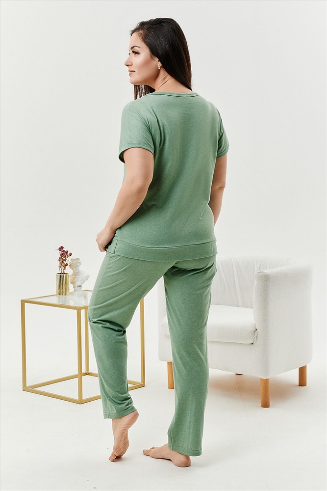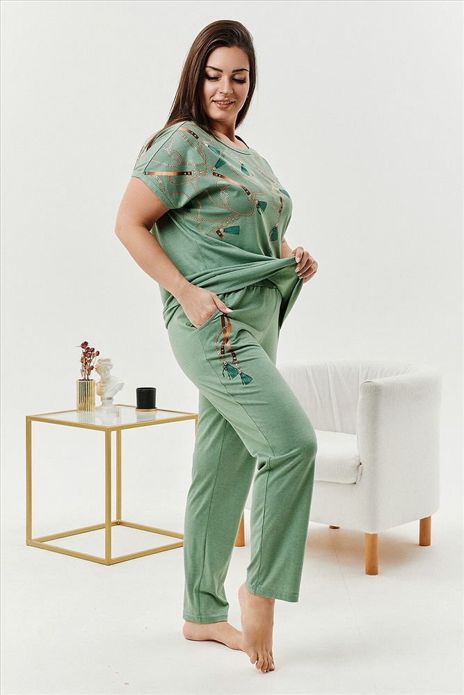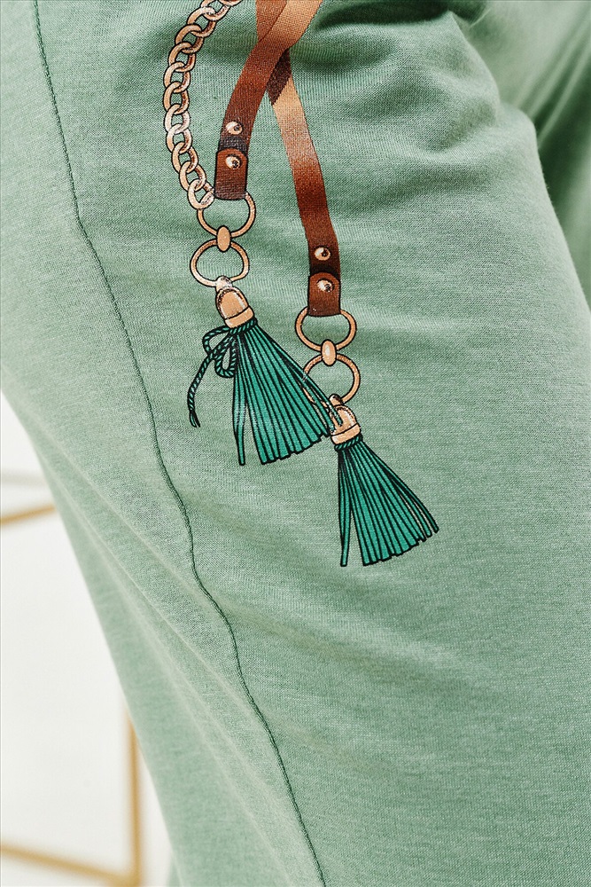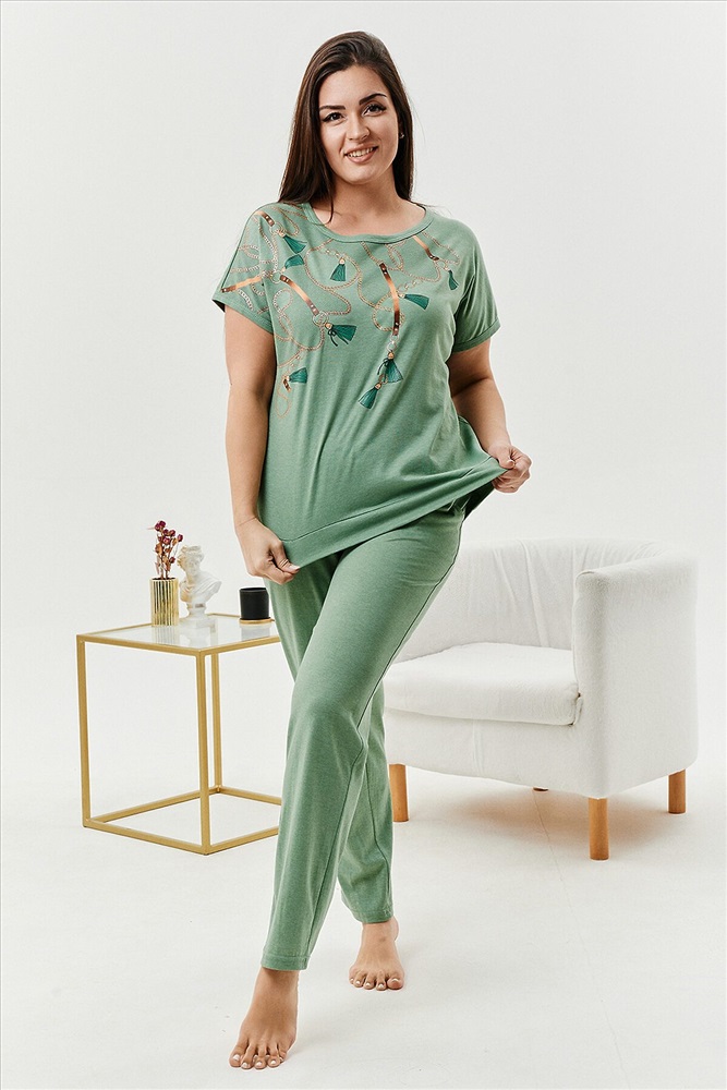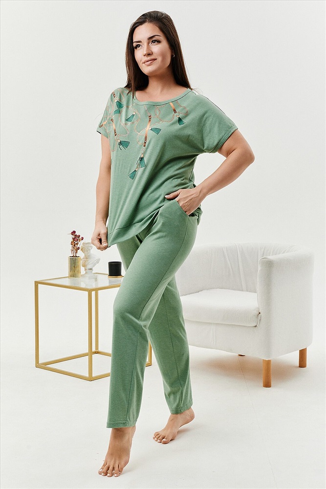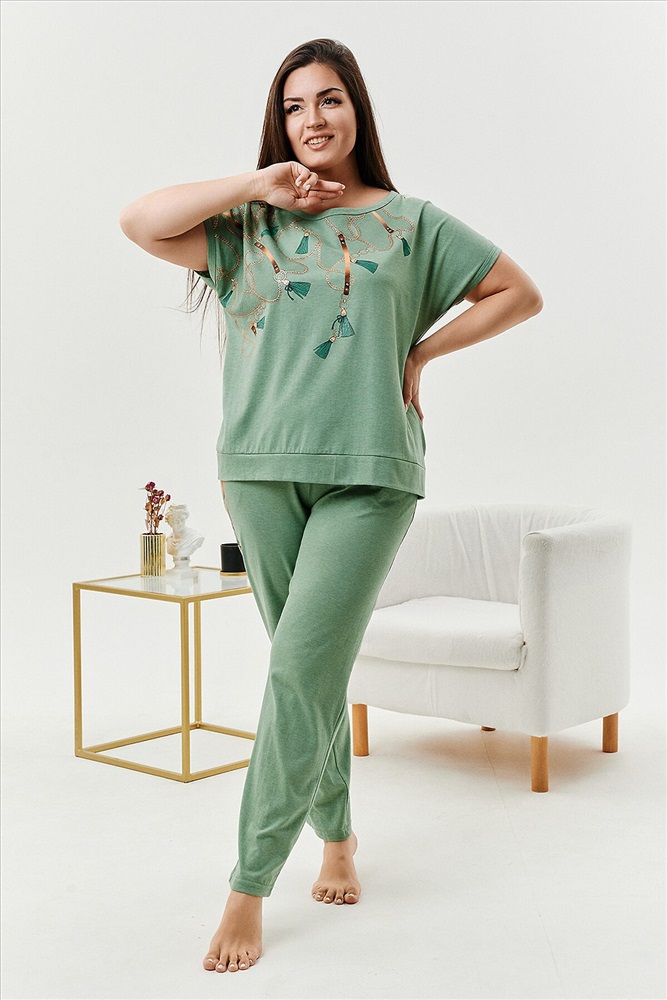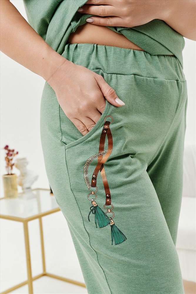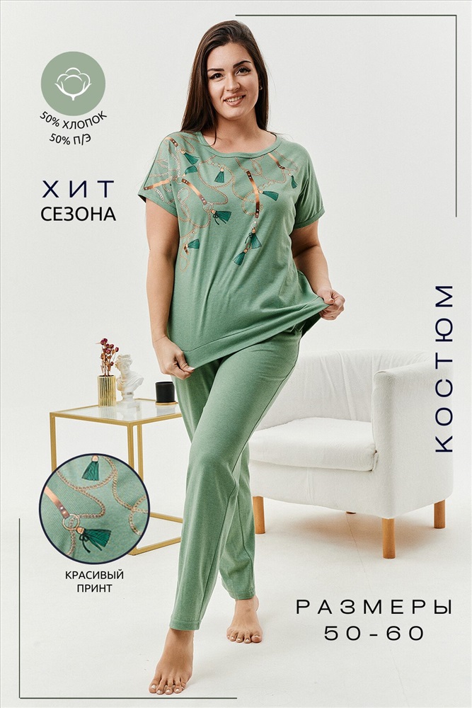 Костюм женский из кулирного полотна состоит из кофты и брюк. Кофта - прямого кроя, горловина круглая, спущенное плечо, низ изделия на поясе. Брюки - прямого кроя, верх на поясе с резинкой, в боковых швах внутренние карманы, низ обработан на плоскошовной машине. На полочке и брюках принт. Такой комплект отлично подойдет для дома, отдыха.