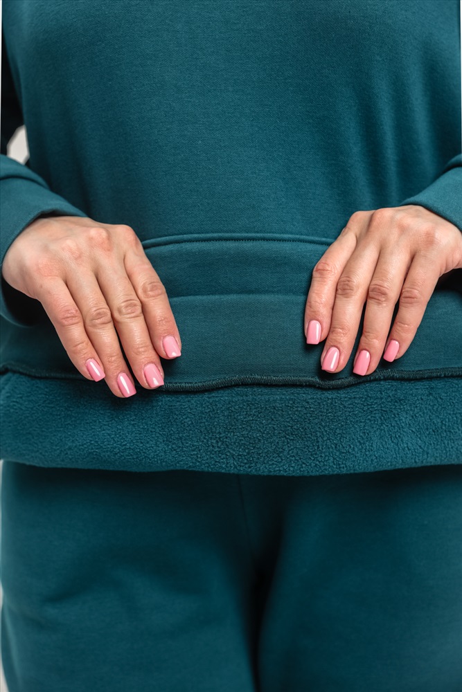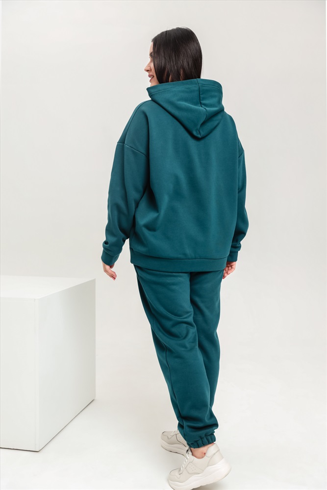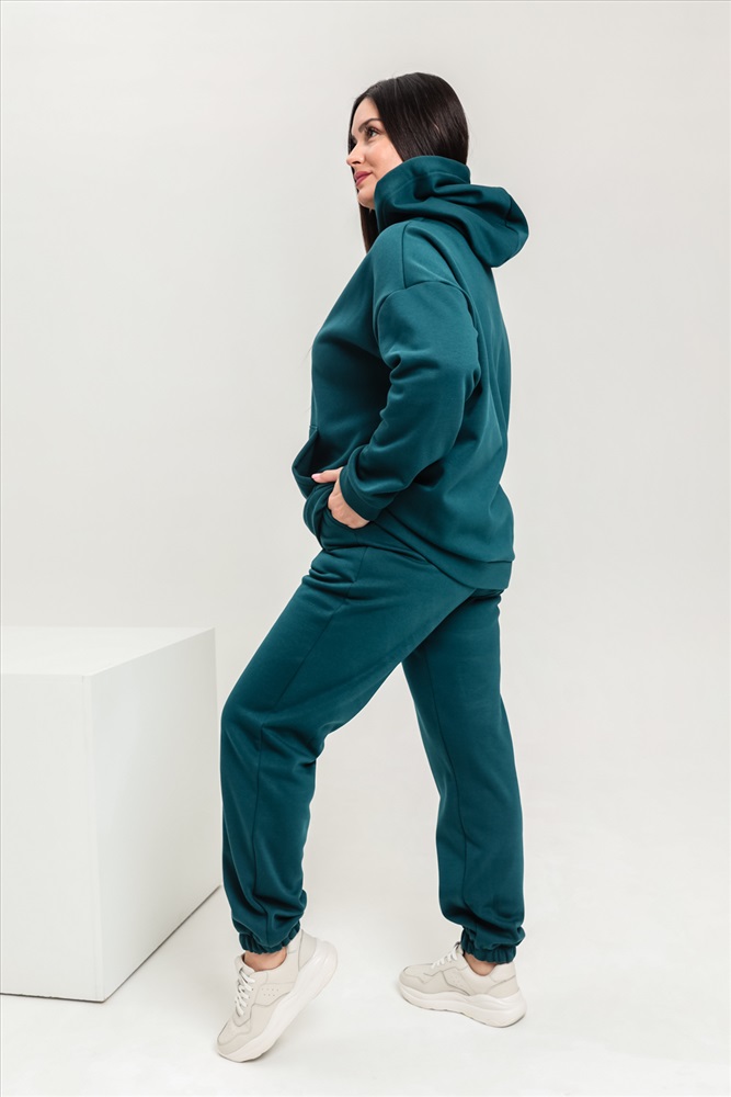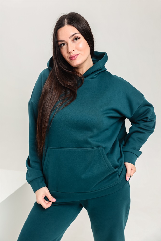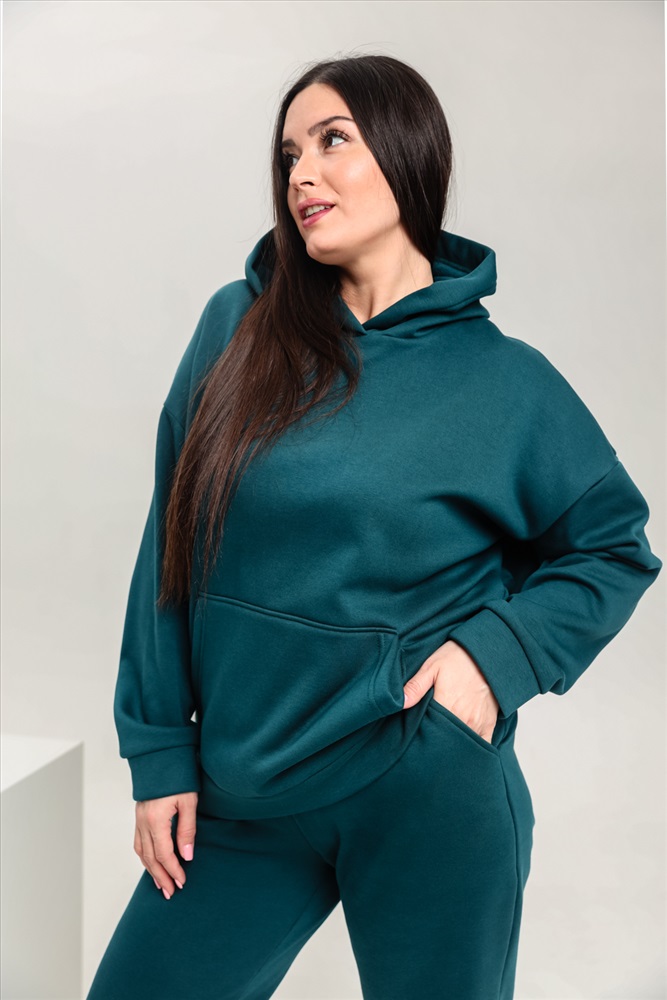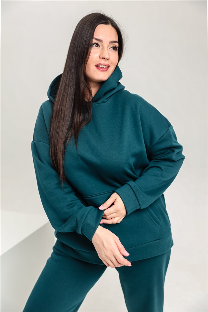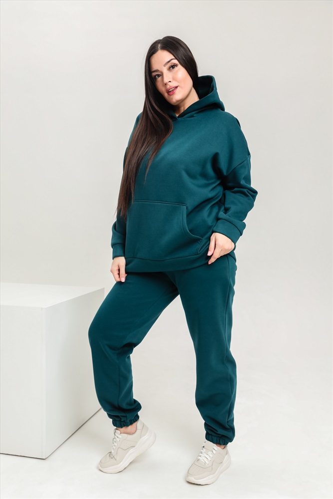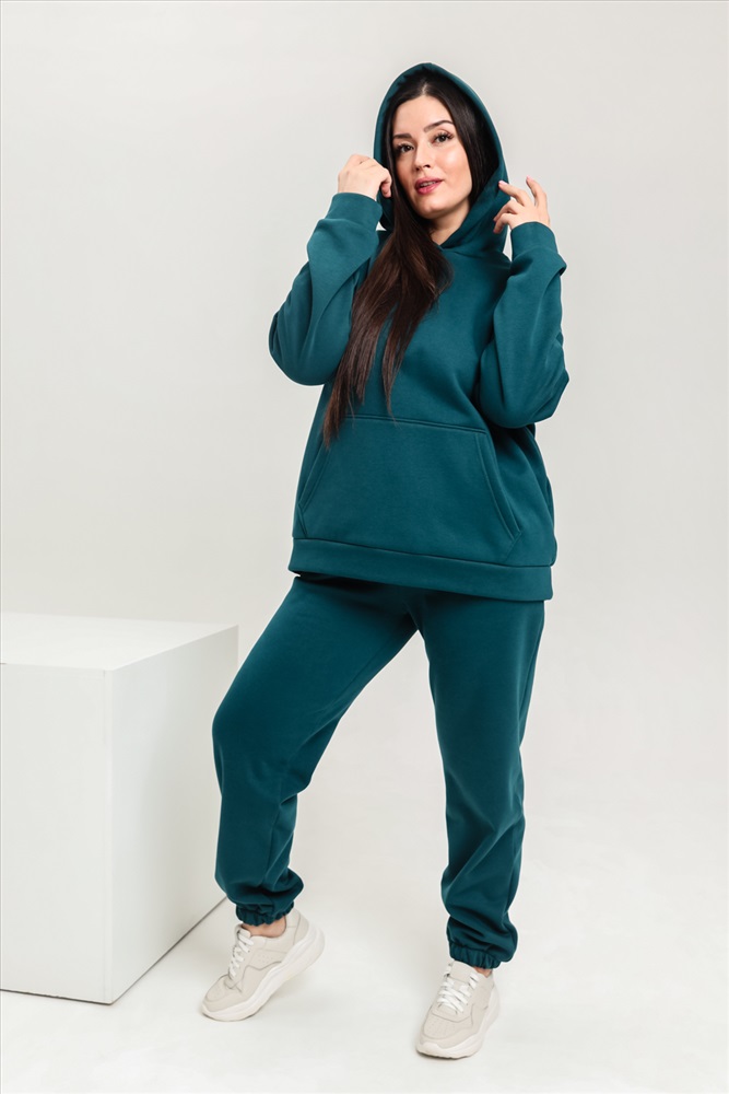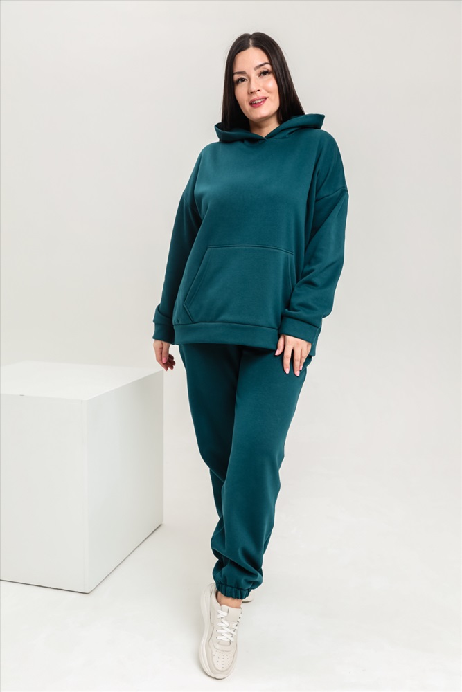 Застежка: без застежки Костюм женский теплый из ткани интерсофт-начес. Толстовка костюма OVERSIZE с капюшоном и карманом кенгуру, брюки костюма с прорезными карманами и резинками внизу, резинка брюк прострочена на поясной пятиигольной машине. Идеальный вариант для холодной погоды.