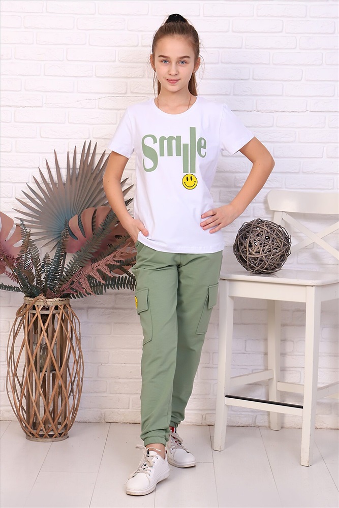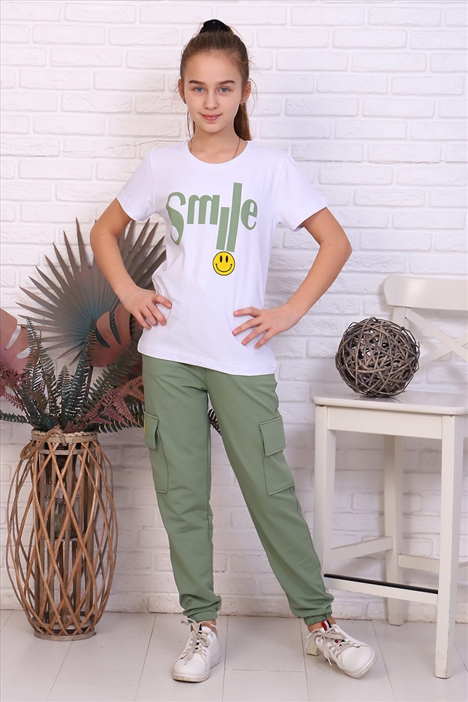 ID товара: 765985 Состав: 95% х/б, 5% лайкра; 74% х/б, 20% п/э, 6% лайкра Сезон: Весна/Лето Длина: Полная Фасон: Прямой Рукав: Короткий Вид застежки: Без застежки Крой брючин: Прямой Рисунок: Надпись Тип карманов: накладной Декоративные элементы: Принт Основная ткань: Хлопок | Кулирка с лайкрой пенье, футер с лайкрой 2-х нитка Стиль: Повседневный Страна бренда: Россия Страна производства: Россия Костюм для девочек, состоящий из футболки и брюк. Брюки из 2-х нитки с накладными карманами по бокам. Футболка из стрейча. Ткань эластичная, при стирке не деформируется. На футболке и брюках имеется печать. Комментарии к товару