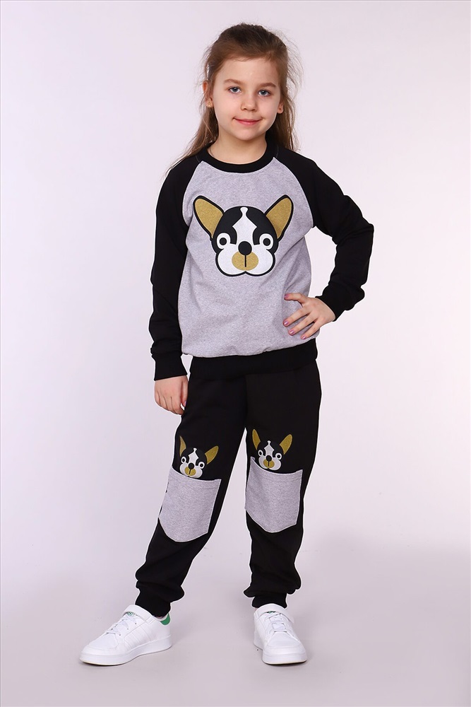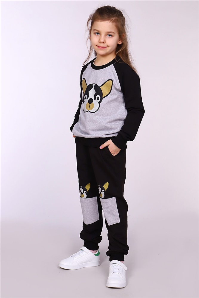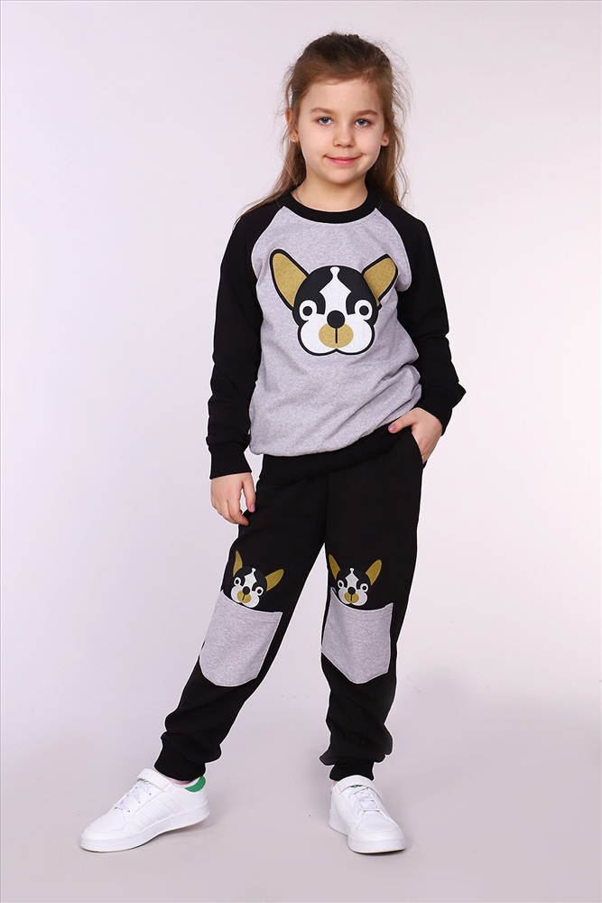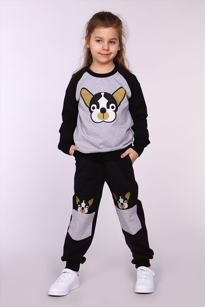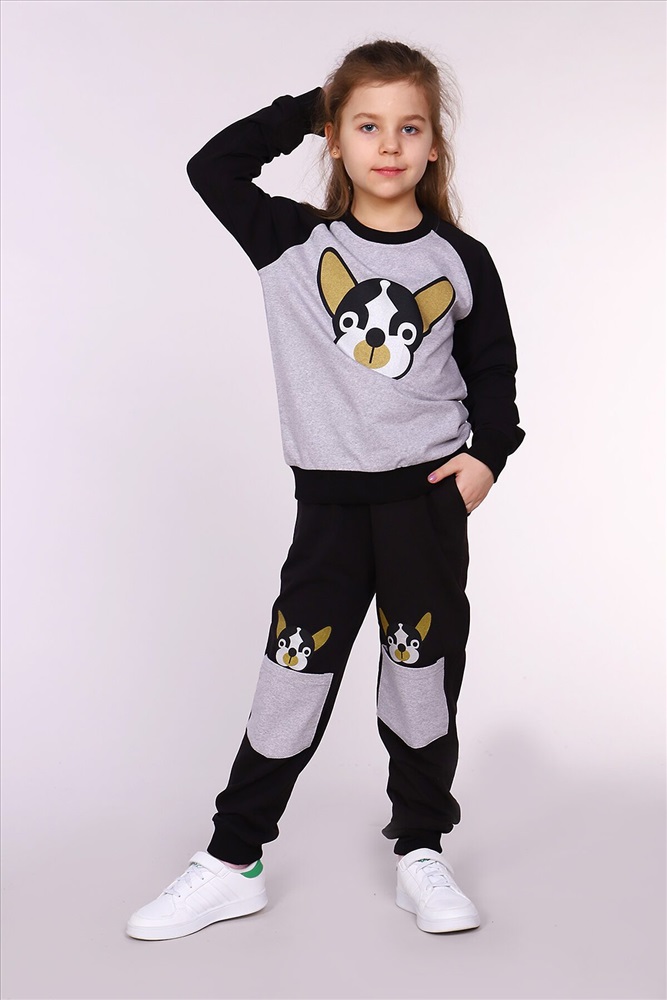 Костюм из 2-х нитки пенье - мягкой и эластичной ткани, которая не будет сковывать движения. Рукава реглан, на кофте красивая печать. Брюки на манжетах, в области колена имеются накладные карманы, из которых виднеется печать в виде собачки. Свободный крой и оригинальный дизайн понравятся вашему ребенку