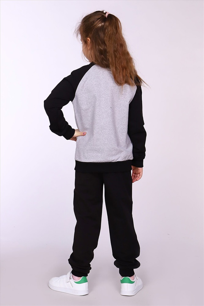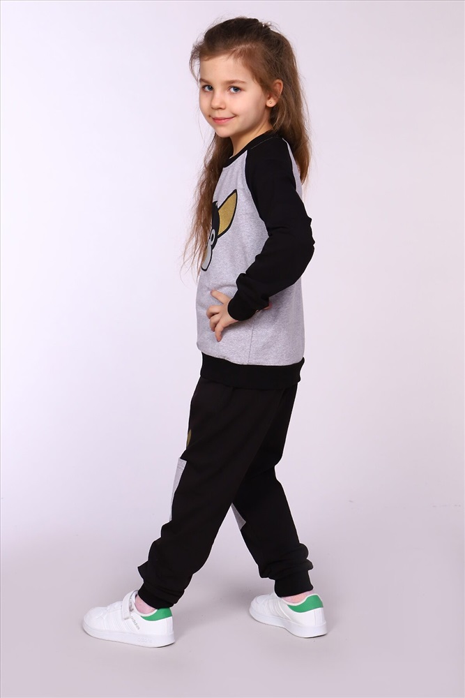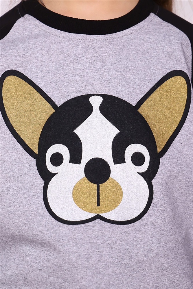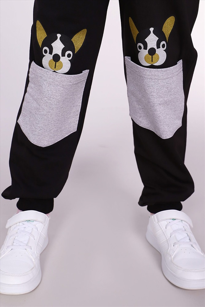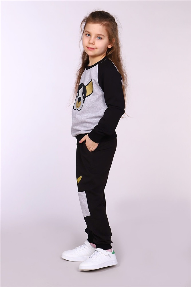Костюм из 2-х нитки пенье - мягкой и эластичной ткани, которая не будет сковывать движения. Рукава реглан, на кофте красивая печать. Брюки на манжетах, в области колена имеются накладные карманы, из которых виднеется печать в виде собачки. Свободный крой и оригинальный дизайн понравятся вашему ребенку