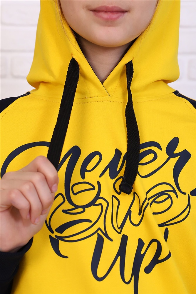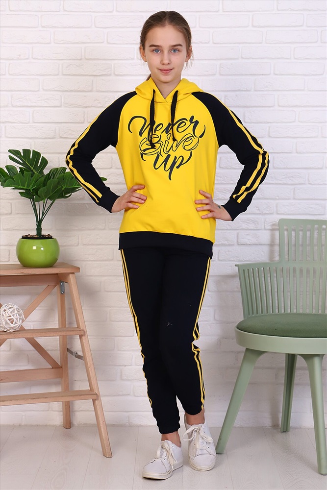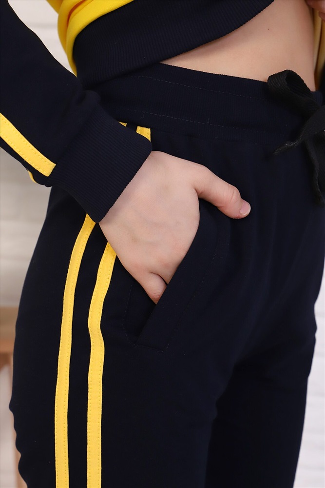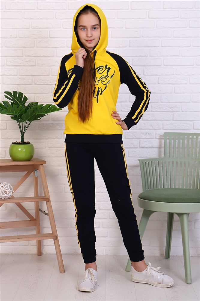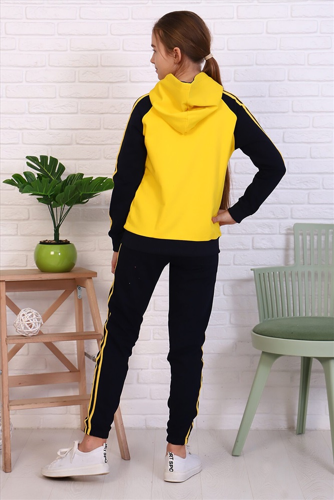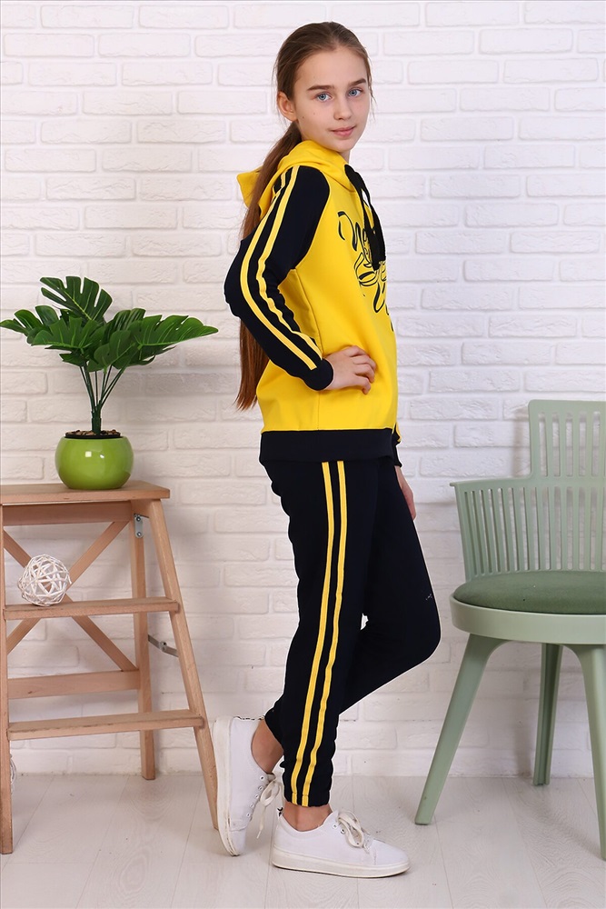 Костюм детский состоит из брюк и кофты. Низ брюк на резинке, боковая вставка с лампасами. На кофте так же имеются лампасы на рукавах, печать на полочке, капюшон на шнурках. Низ кофты обработан кашкорсе. Модный и удобный костюм для ваших маленьких модниц.