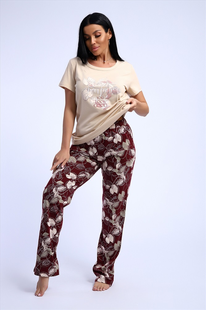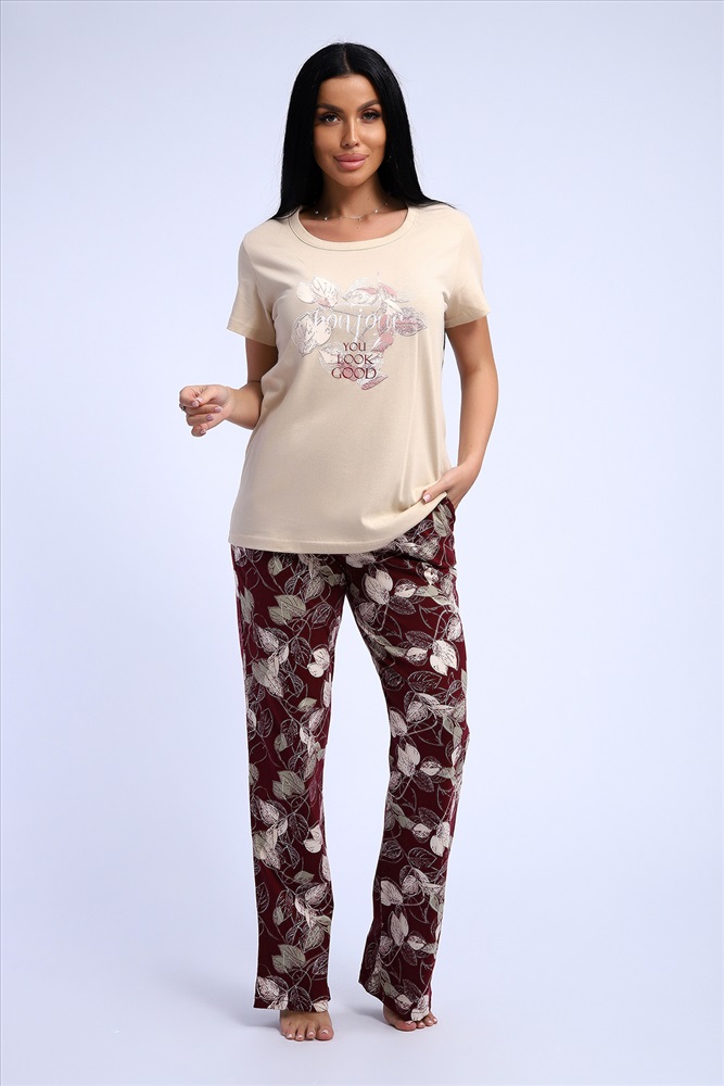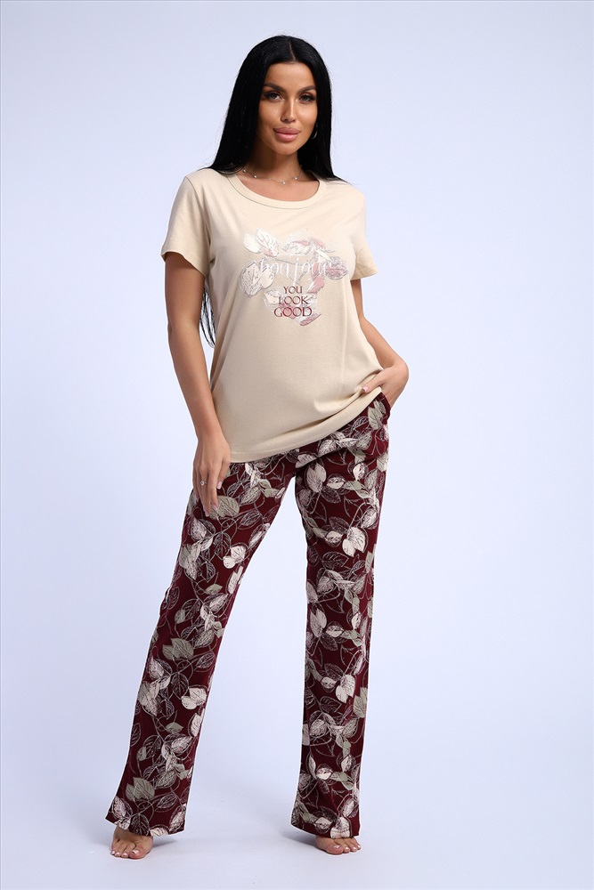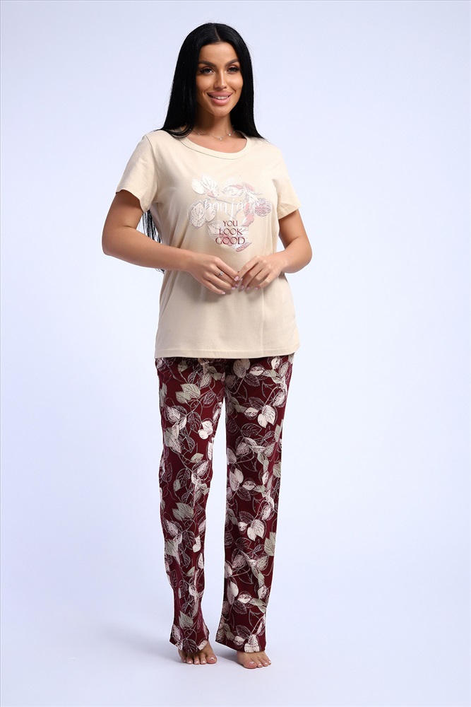 Состав: 100% хлопок Модель: Костюм 51195 Тип товара: костюм с брюками Материал: кулирка | кулирка Бренд: Натали Суслова Карман: боковые Назначение: для дома НДС: Без НДС Особенности: на резинке Отделка: с карманами | с печатью Посадка: средняя посадка Рисунок: цветы Рукав: короткий рукав Сезонность: лето | осень | весна | зима Силуэт: свободный Стиль: домашний Воротник: без воротника Застежка: без застежки Комплект трикотажный футболка и брюки из натурального хлопка высокого качества. Размерный ряд с 48 до 66 размера. Футболка нежно-песочного цвета, брюки бордово-винного цвета с растительным рисунком, есть боковые карманы. Таблица размеров и весафутболка