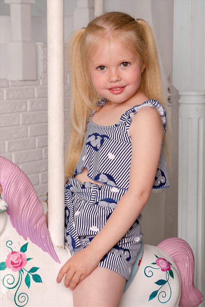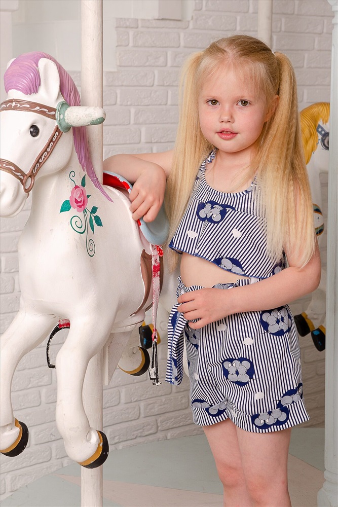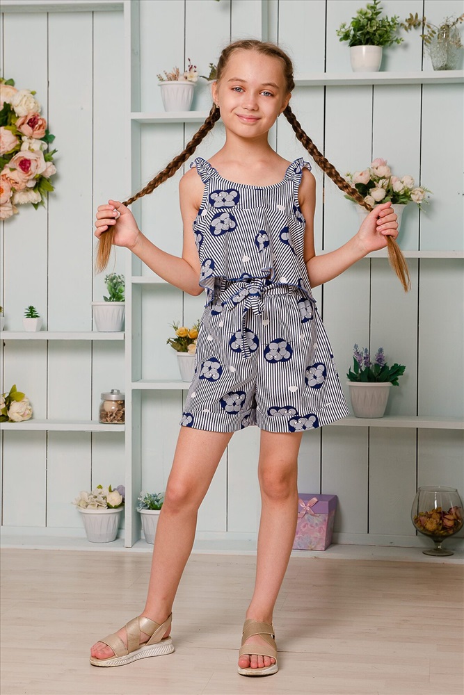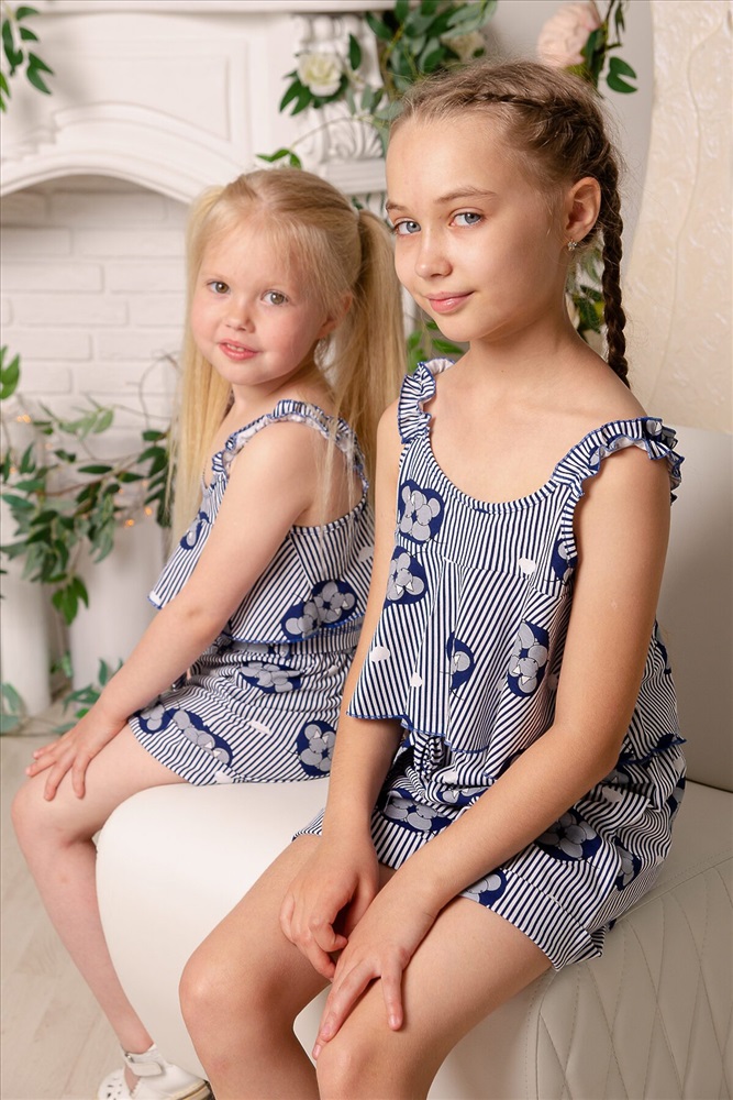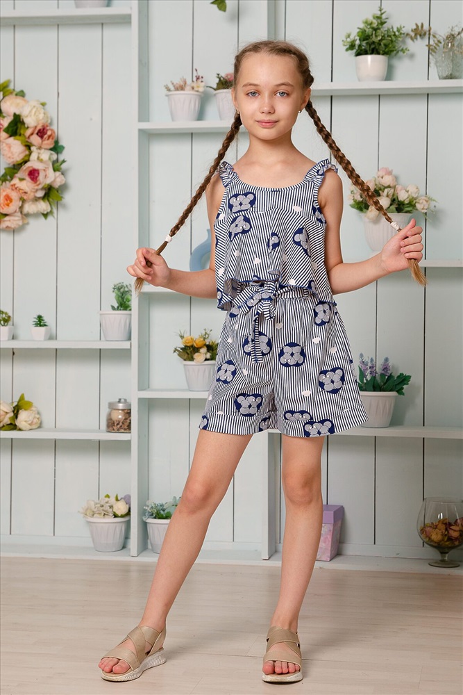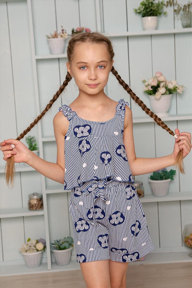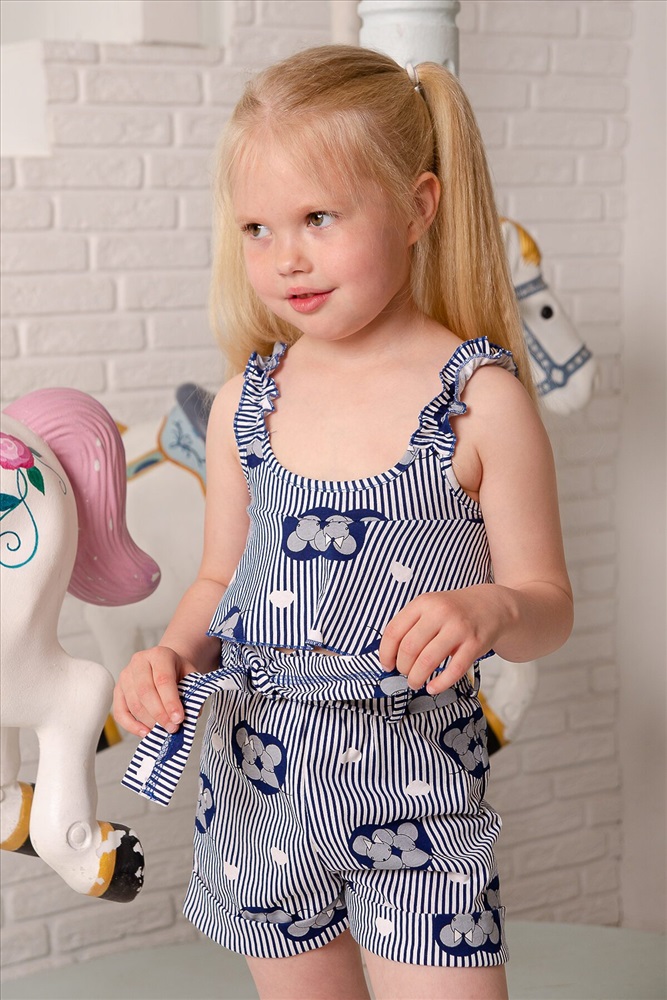 Костюм детский летний. Коротенький топ с шортами. Топ короткий, расклешенный с завышенной линией талии по переду, на широких бретельках из основной ткани, собранных в сборку на резинку. Низ топа обработан декоративной краеобметочной строчкой. Шорты с завышеной линией талии, на широкой резинке, шорты оформлены декоративным поясом со шлевками. Низ обработан притачными манжетами с отворотом.
