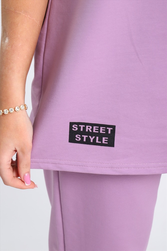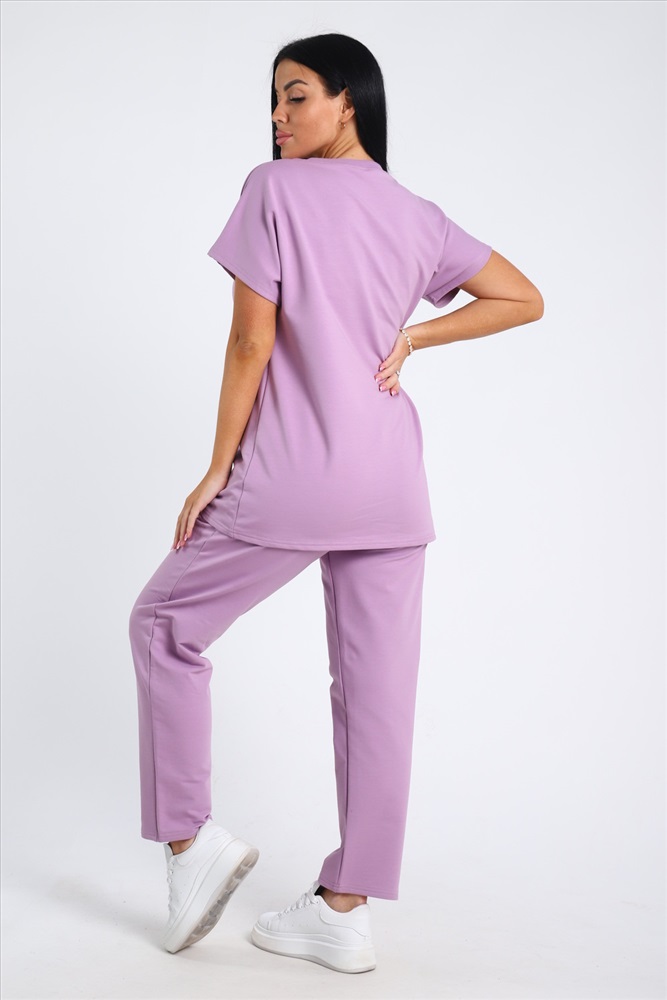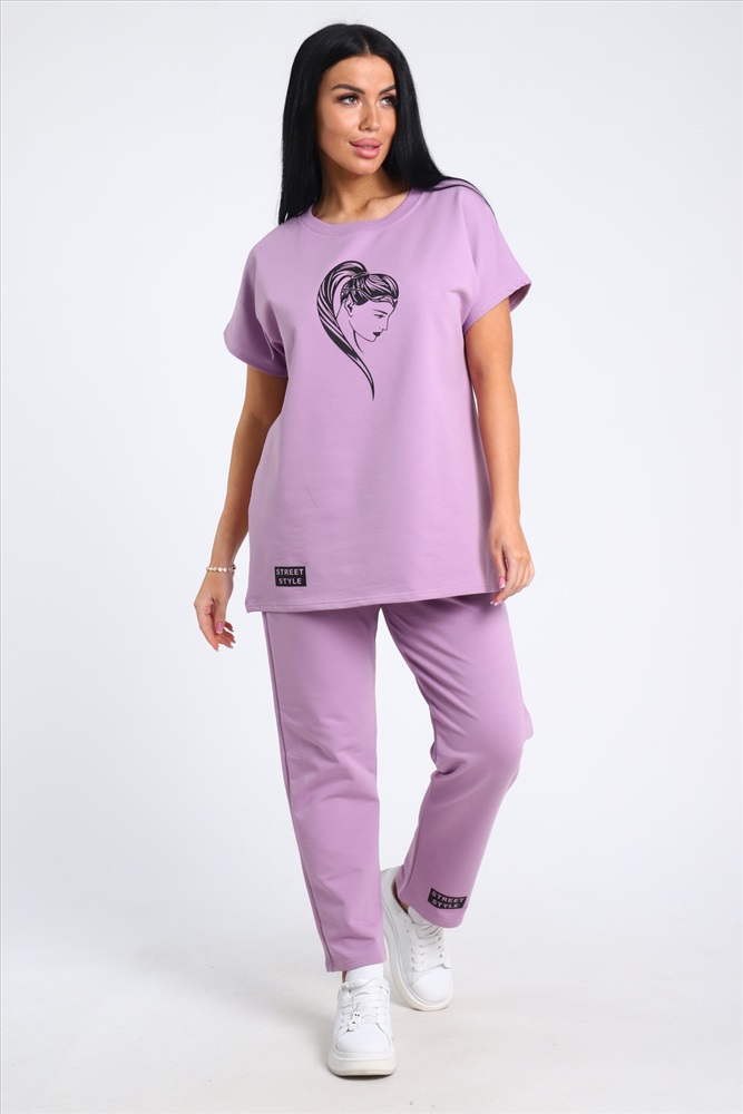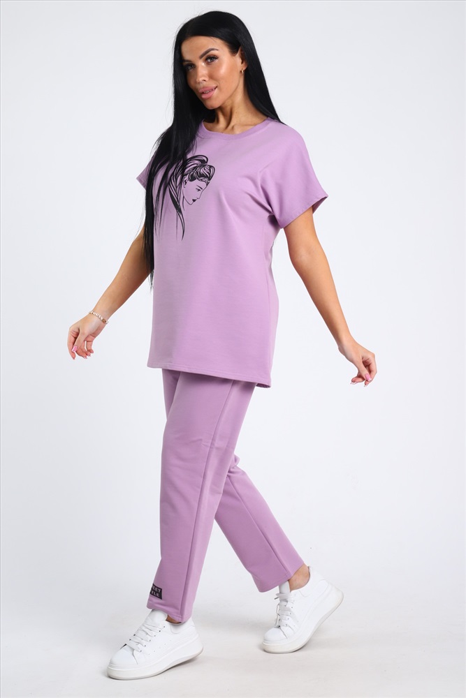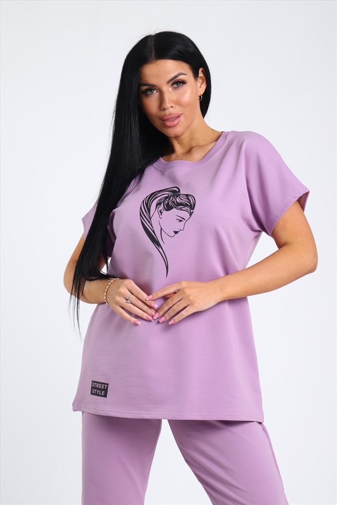 Застежка: без застежки Легкий женский костюм прямого силуэта. Верх двойки - футболка с коротким рукавом и округлой горловиной. Футболка свободная с принтом. Низ - прямые брюки без карманов, пояс на резинке. Данная модель подойдет как и для повседневной носки, так и для дома. Удобный и приятный костюм. Рост модели на фото 165, размер 48.