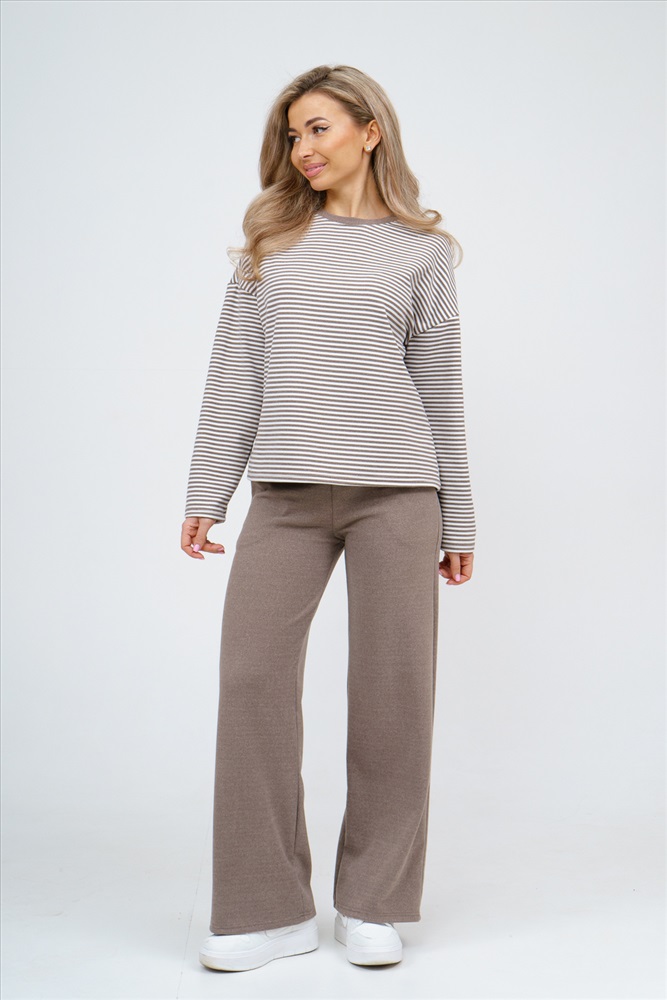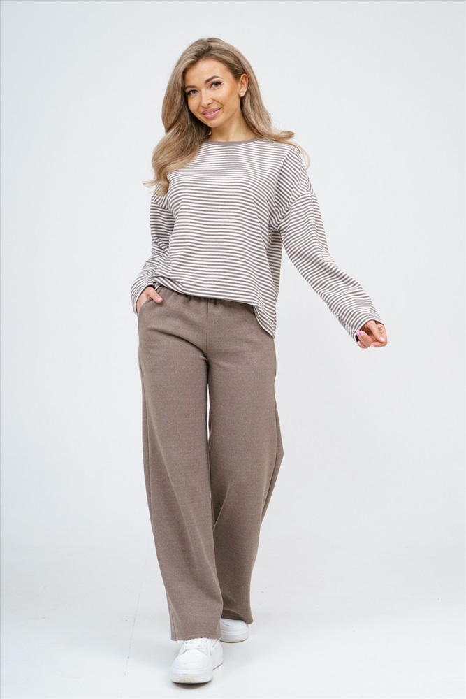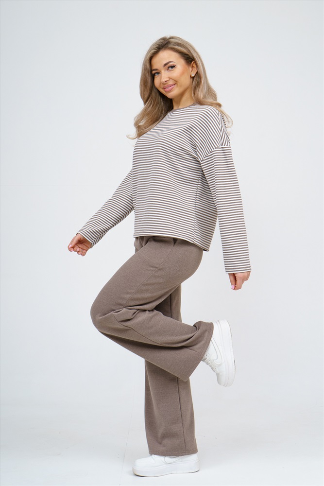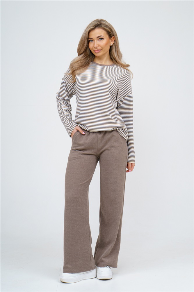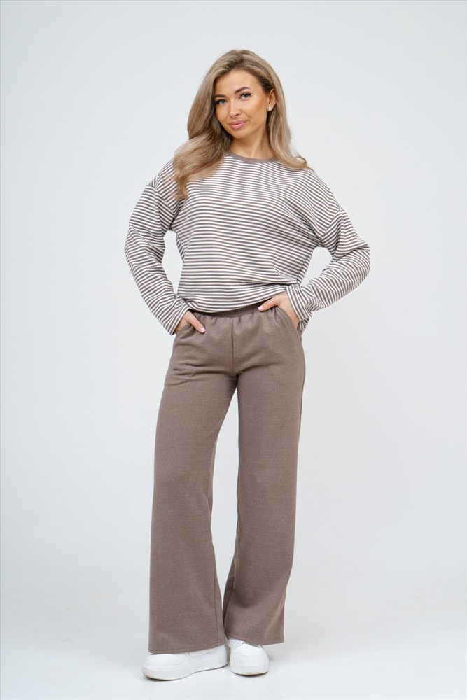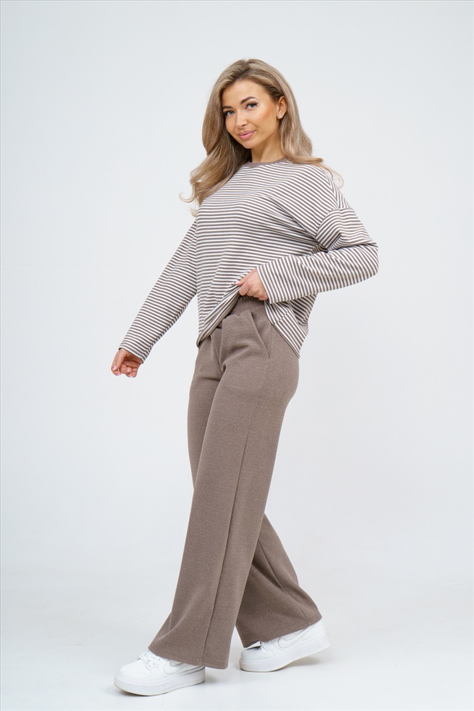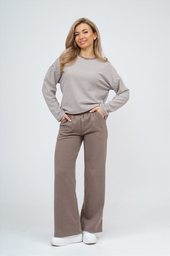 Женский костюм выполнен из двухстороннего флис полара высокого качества. Флис полар - высокотехнологичный материал, прошедшей особую обработку. Ткань отличается высокими теплозащитными свойствами, при этом является дышащей. По своим характеристикам она не уступает шерстяным полотнам. И даже в сыром состоянии удерживает тепло у тела. Материал прочный, эластичный, влагостойкий. Воздухопроницаемая гигроскопичная ткань создает для тела комфортный микроклимат. Материал гипоаллергенный, подходит для изготовления одежды детям, в том числе новорожденным. Изделия из флиса легкие, не мнутся, не деформируются, не вытягиваються.В такой одежде удобно и комфортно. Эластичность материала позволяет легко двигаться. Костюм состоит из лонгслива и брюк. Лонг в стиле OVERSIZE ( одежда свободного кроя ) - это свобода самовыражения, позволяющая чувствовать себя комфортно и стильно одновременно. Горловина футболки выполнена с обтачкой. Линия плеча спущена, длинный рукав. Женские стильные брюки - трубы представлены с вместительными боковыми карманами. Пояс выполнен на специализированной круговой поясной машине, что делает швы ровными и качественными. А профессиональные закрепки на поясе, придают изделию законченный вид и качество. Свободный крой прекрасно будет смотреться на дамах с любыми формами. Костюм такого плана представлен в широкой размерной сетке, что позволяет выбрать его как девушке, так и женщине. Костюм модных расцветок с полосой, будет удачным выбором для поездок в отпуск, на пикник, для школы, для активного отдыха и прогулок по городу. Будет гармонично сочетаться как с кроссовками, так и с ботинками. Используя эту модель в качестве домашнего костюма, Вы поймёте, что это именно тот самый идеальный вариант, в котором будете себя чувствовать удобно, комфортно и современно. Костюм с брюками - это настоящая находка для тех, кто ценит свою индивидуальность!