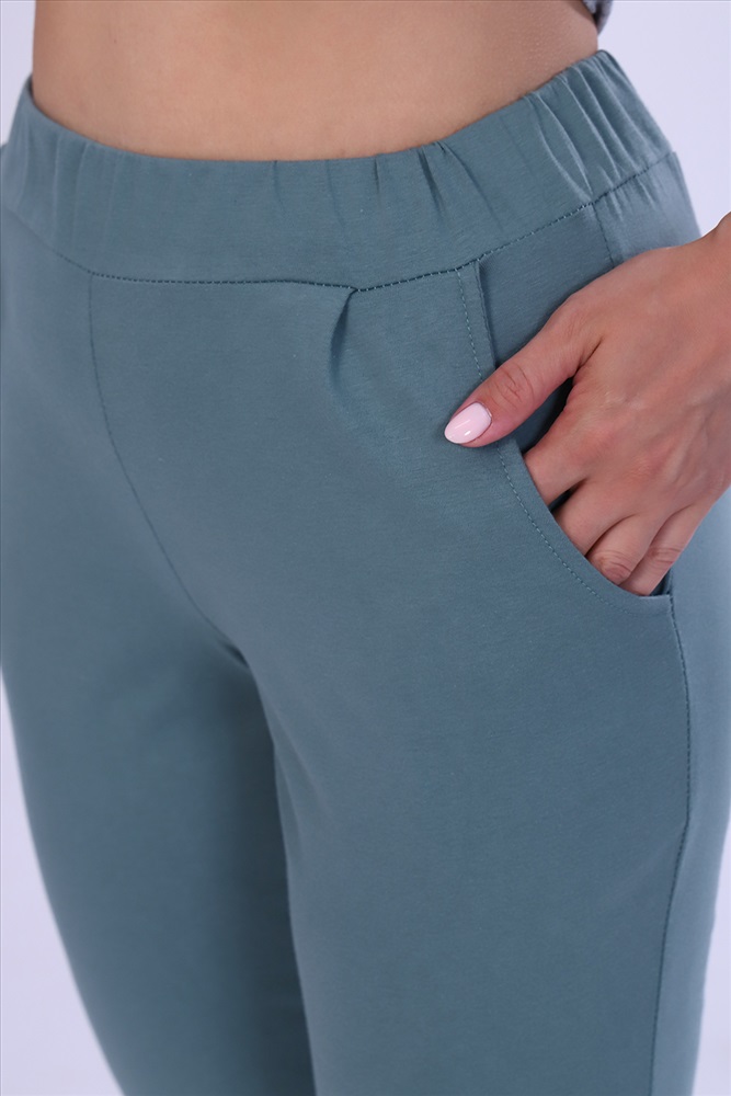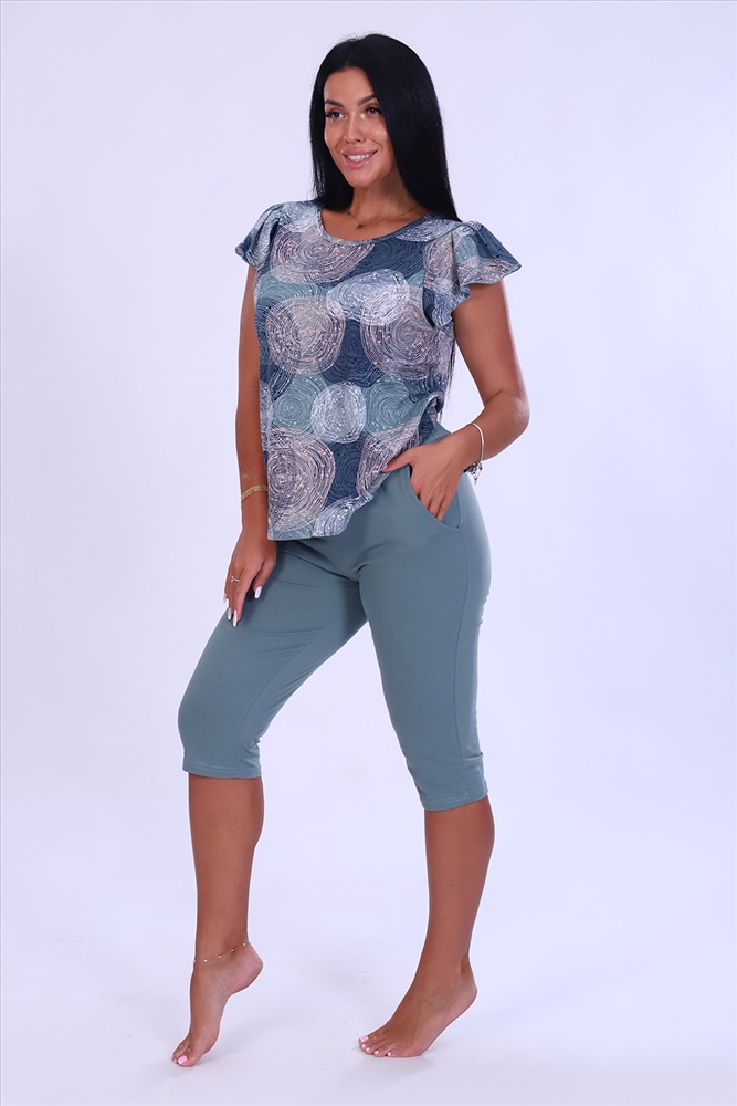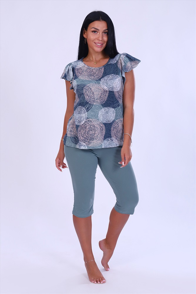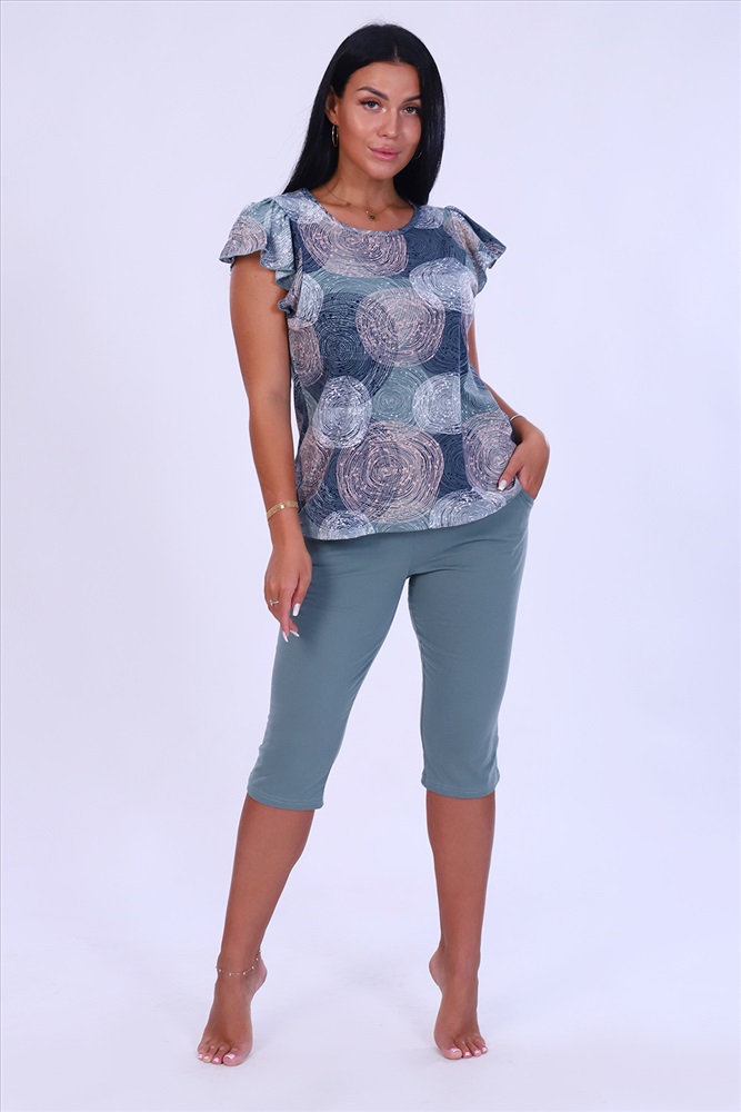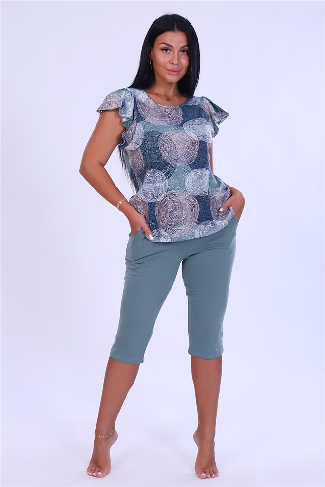 Застежка: без застежки Домашний женский костюм изготовлен из кулирки - 100% хлопка. Женский костюм состоит из майки и брюк. Майка полуприлегающего силуэта с округлой горловиной. Бриджи прилегающие с карманами, притачным поясом, низ обработан на плоскошовной машине.