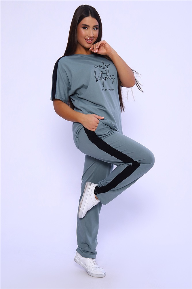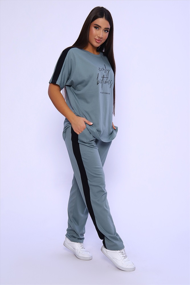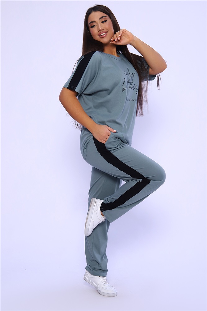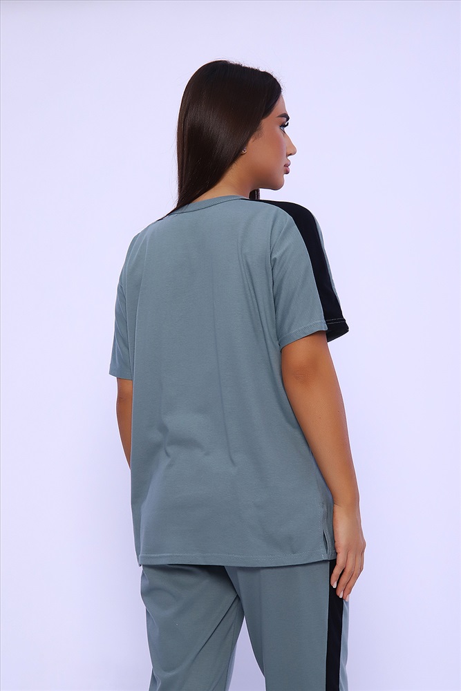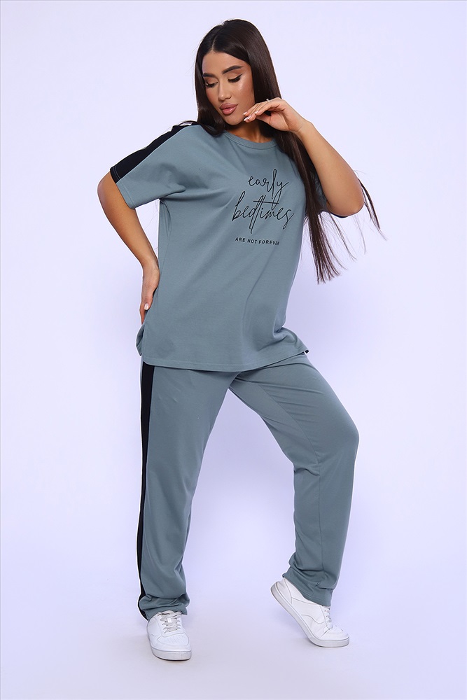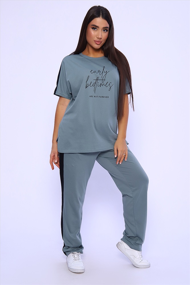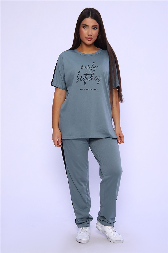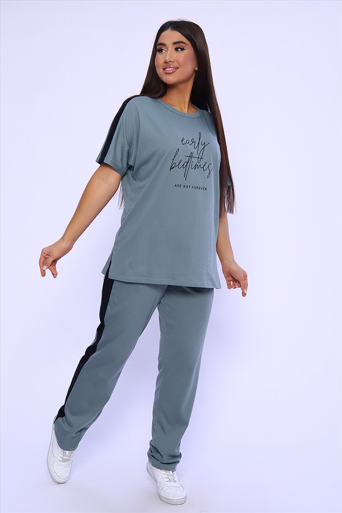 Застежка: без застежки Женский костюм изготовлен из мягкого кулирного полотна, средней плотности. Костюм состоит из футболки и брюк. Футболка с округлой горловиной, обработанной окантовкой, по плечам есть лампасы, по бокам небольшие разрезы. Брюки прямые с лампасами, поясом есть карманы.