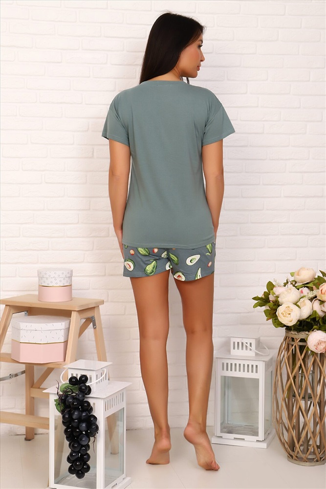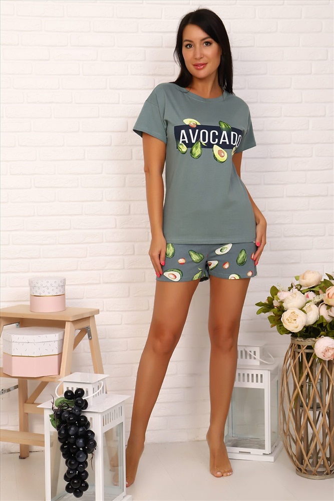 ID товара: 280510 Состав: 100% Хлопок. Сезон: Весна/Лето Длина: Средняя Фасон: Прямой Рукав: Короткий Крой брючин: Прямой Рисунок: Фрукты Основная ткань: Хлопок | Кулирка, Кулирка — это самое тонкое и гладкое трикотажное полотно, изготовленное из чистого хлопка. Полотно имеет характерную структуру- с лицевой стороны плоские «косички», с изнаночной – «кирпичная кладка». Особенности- гигроскопична, воздухопроницаема, при стирке, сушке и глажке не садится, хорошо держит форму, не образует складки. Стиль: Повседневный Страна бренда: Россия Страна производства: Россия Костюм женский с шортами, сшит из трикотажного полотна. Футболка свободного кроя с короткими рукавами. Горловина округлой формы. Шорты на резинке из набивной ткани. Комментарии к товару