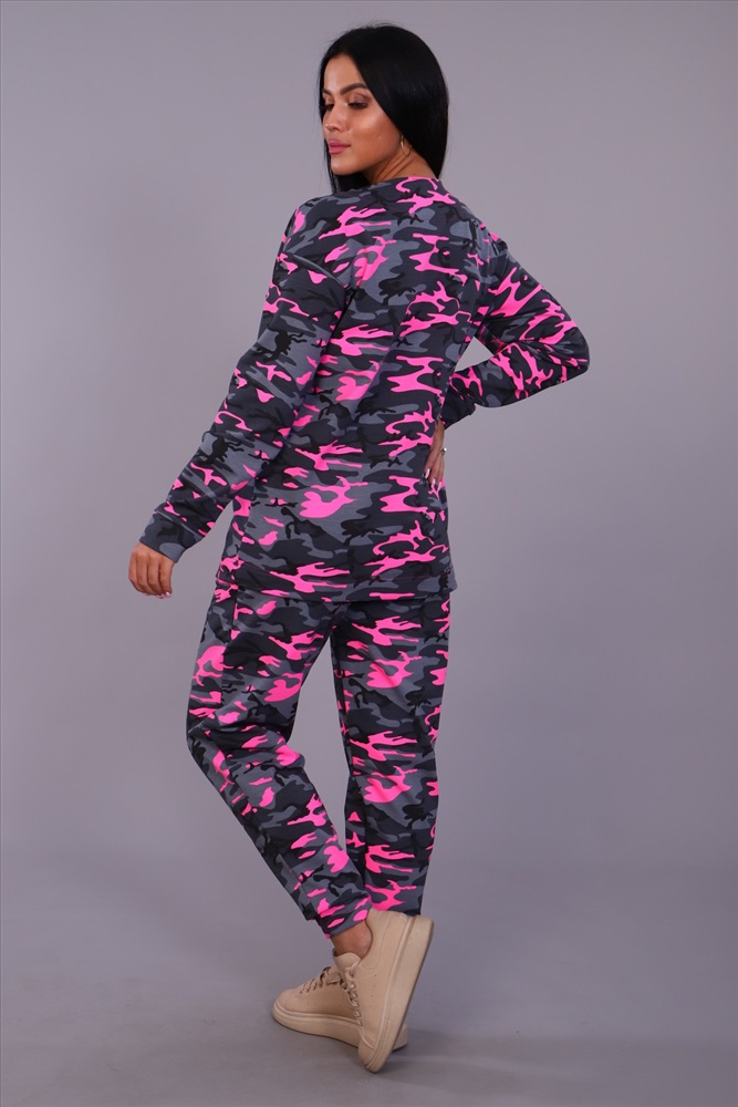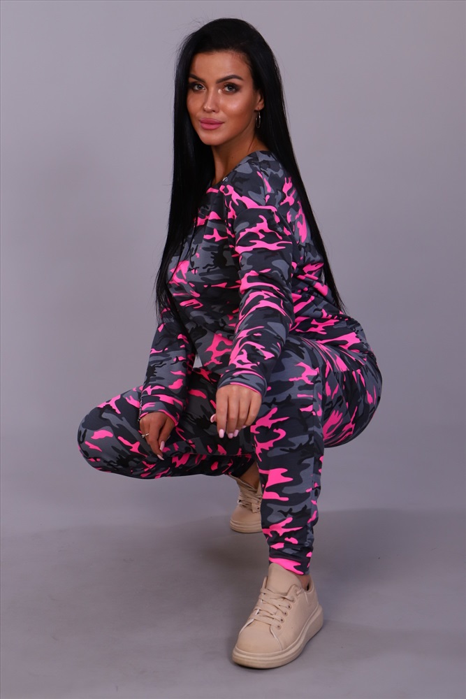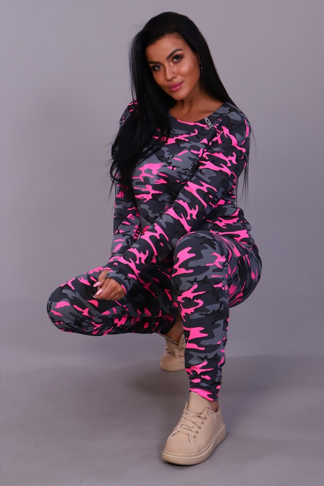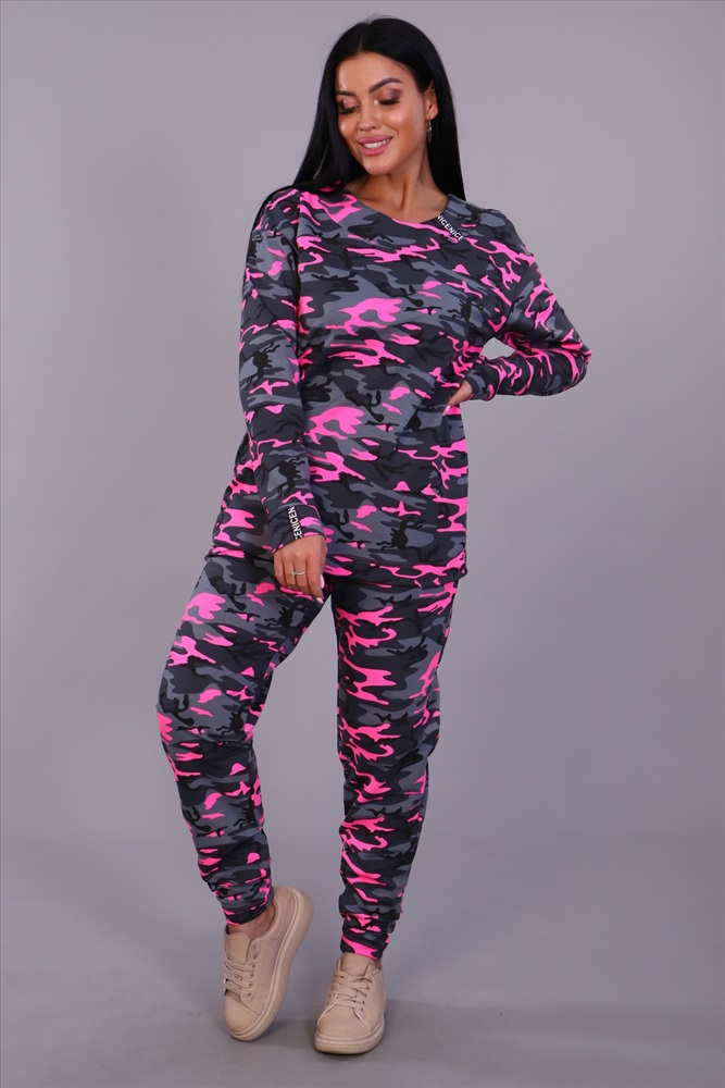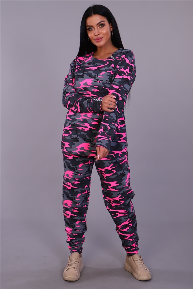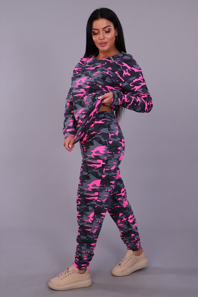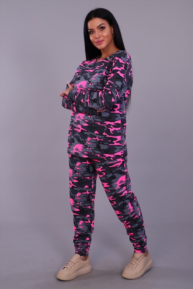 Застежка: без застежки Женский брючный костюм из футера прямого силуэта. Брюки свободные, с внутренними карманами на передней части, толстовка с длинными рукавами без воротника, небольшая декоративная черная лента с белой надписью слева у горловины и на рукаве.