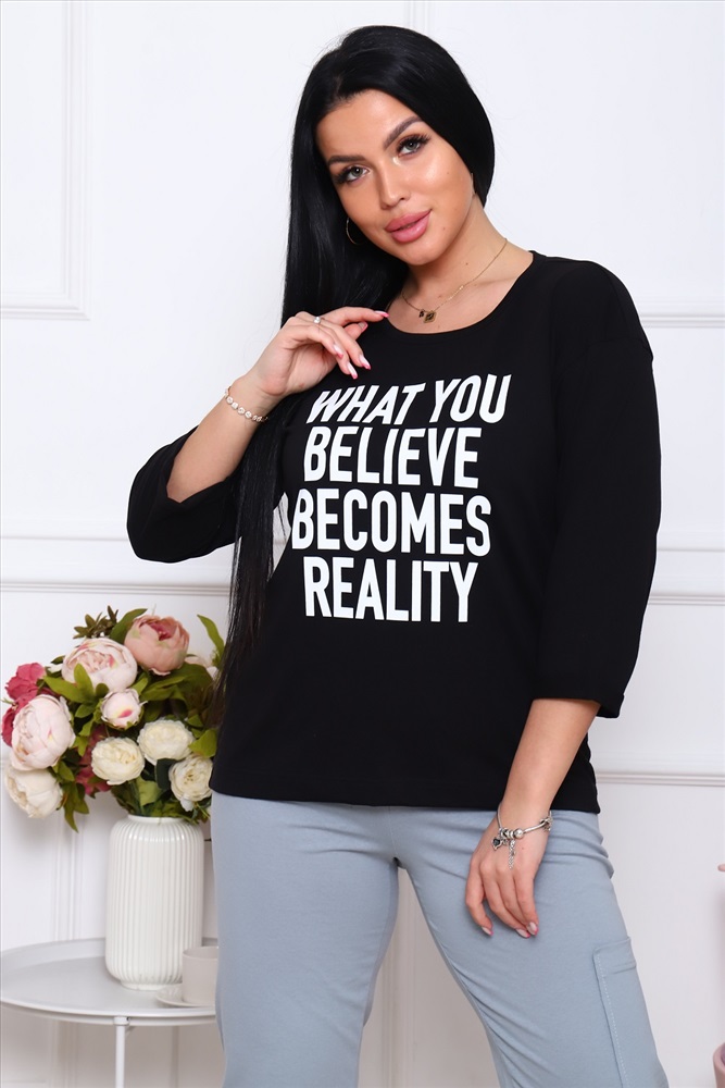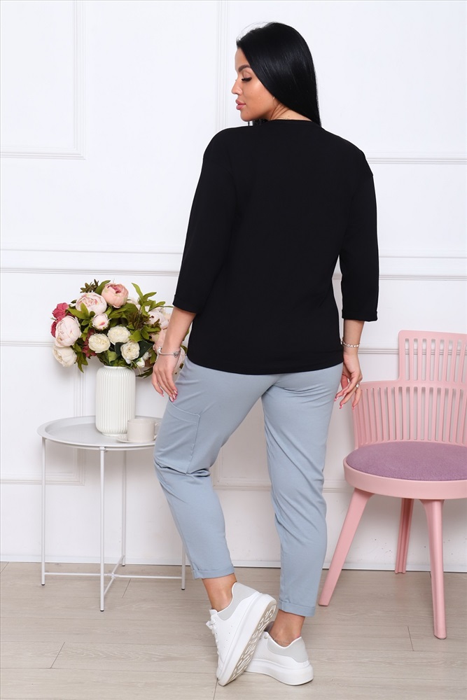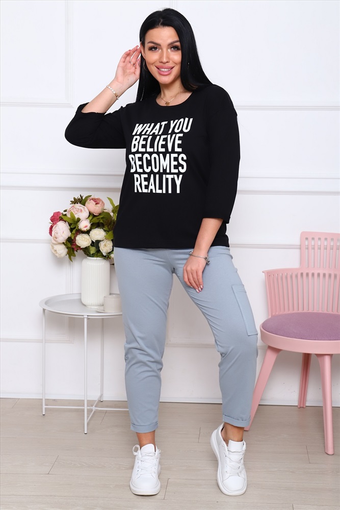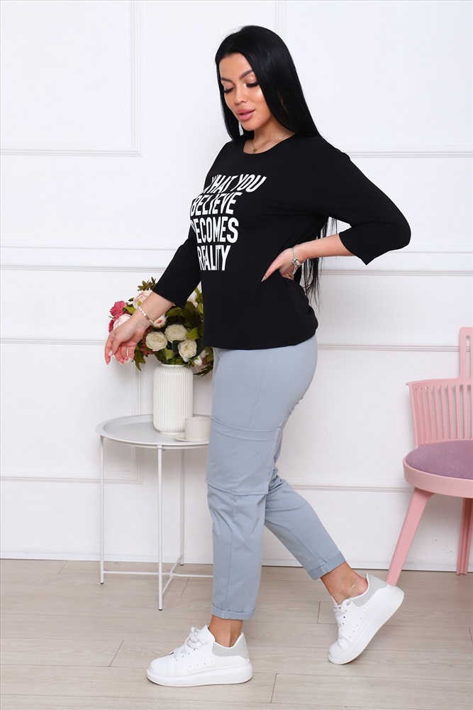 Застежка: без застежки Костюм Кэжуал, стильная и элегантная футболка с рукавом 3/4 с подворотами и с печатью на полочке. Спинка футболки немного длиннее полочки. Брюки укороченные с подворотами, с одним карманом на левой брючине, пояс широкий, эластичный, комфортный.
