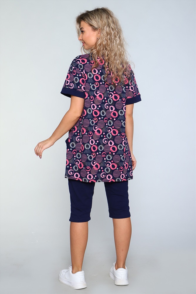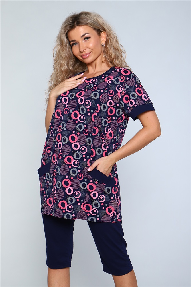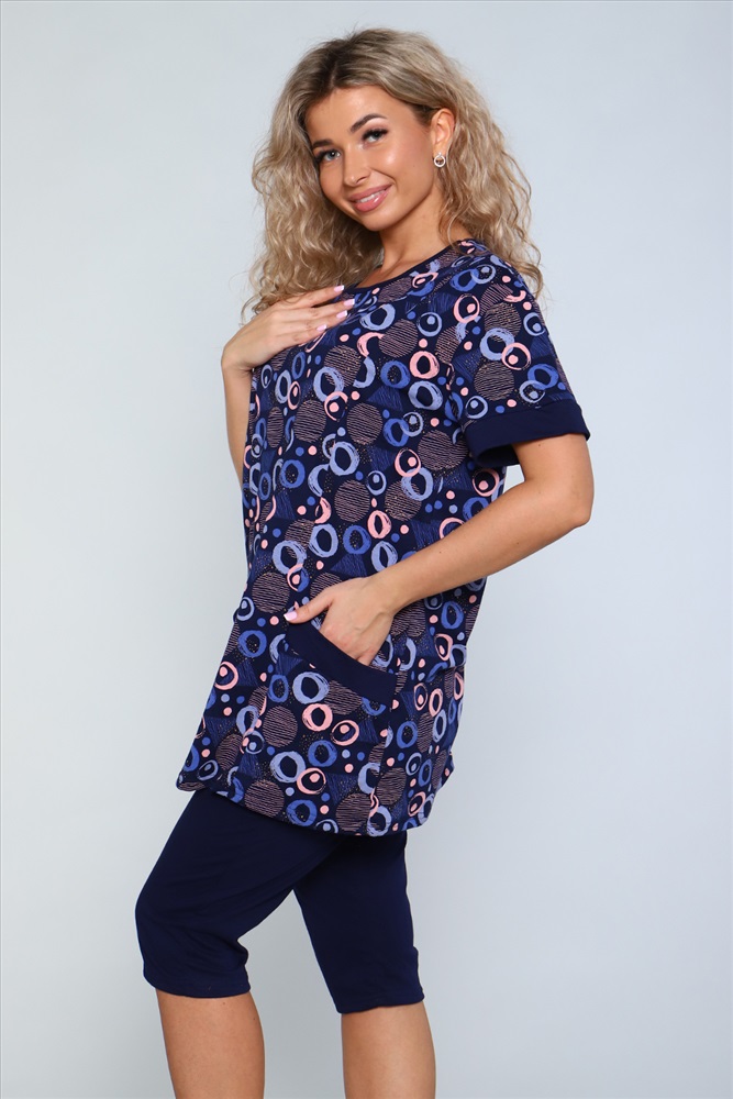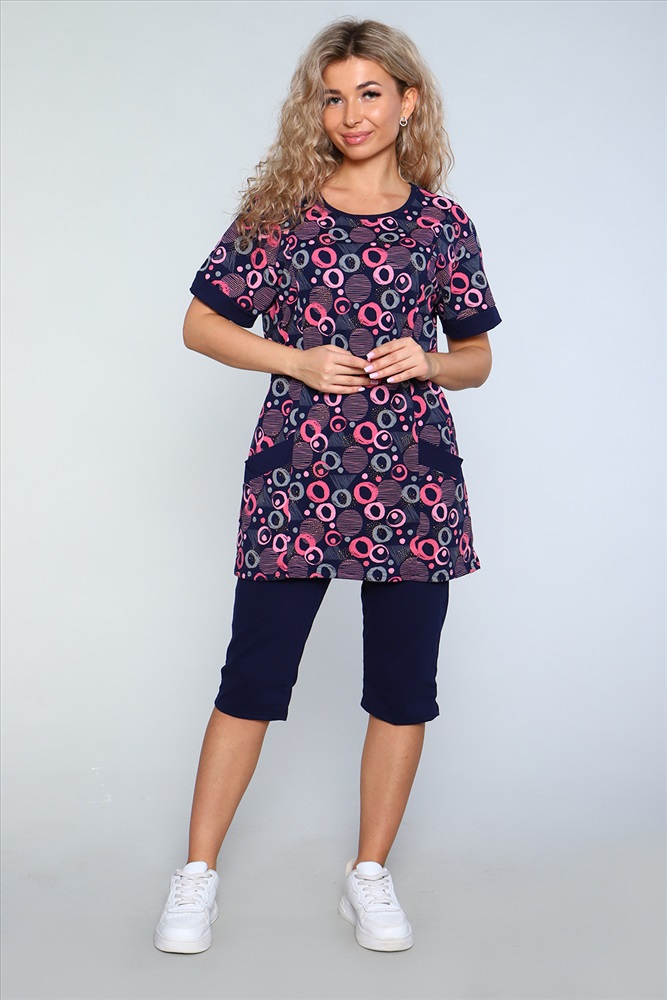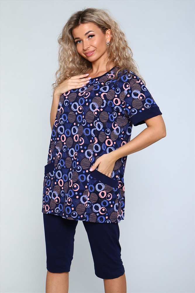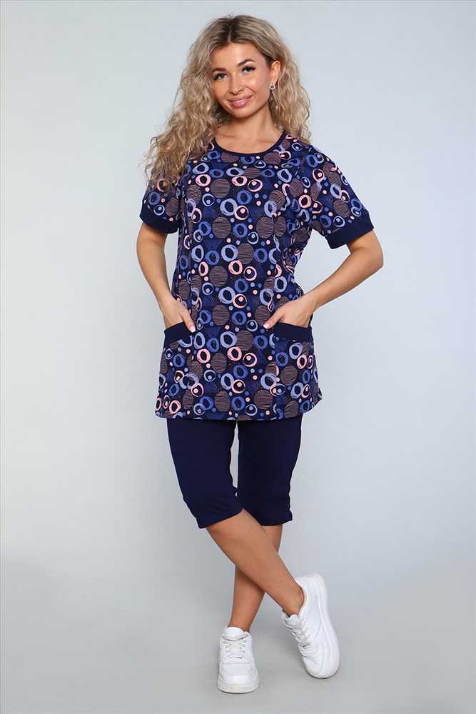 Застежка: без застежки Костюм состоит из туники и бридж. Бриджи с карманами, длиной ниже колена. Туника с короткими рукавами на манжетах. Полочка с отрезными бочками и накладными карманами. Неотъемлемый элемент домашнего гардероба.
