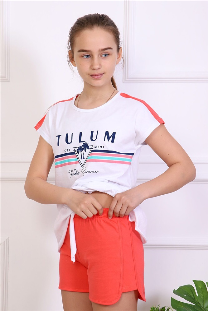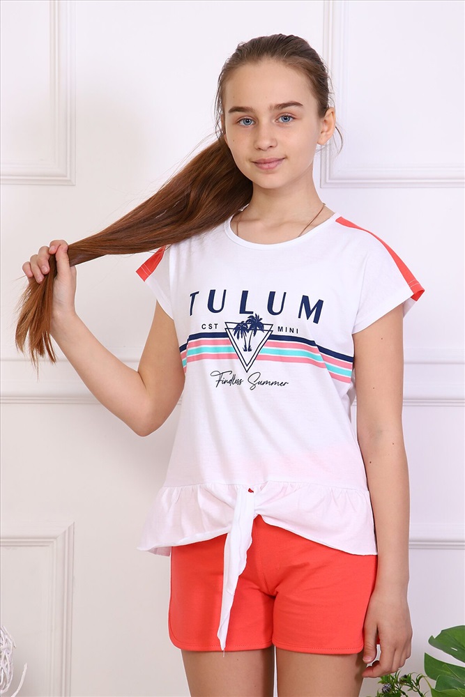 ID товара: 782266 Состав: 100% хлопок Сезон: Весна/Лето Длина: Средняя Фасон: Прямой Рукав: Короткий Вид застежки: Без застежки Крой брючин: Прямой Рисунок: Надпись Декоративные элементы: Рюши Основная ткань: 100% хлопок | Кулирка Стиль: Повседневный Страна бренда: Россия Страна производства: Россия Комплект состоит из шорт и футболки. На футболке на плечах имеются цветные вставки, низ обработан рюшей. Шорты однотонные обработаны окантовкой. Пояс с резинкой. Комментарии к товару