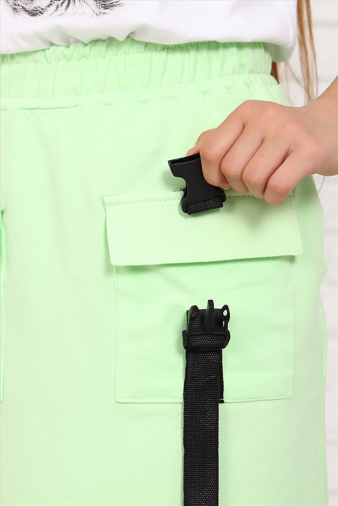 Комплект состоит из футболки и юбки. На юбке накладные и карманы, отделочная лента с застежкой. На футболке печать на полочке.