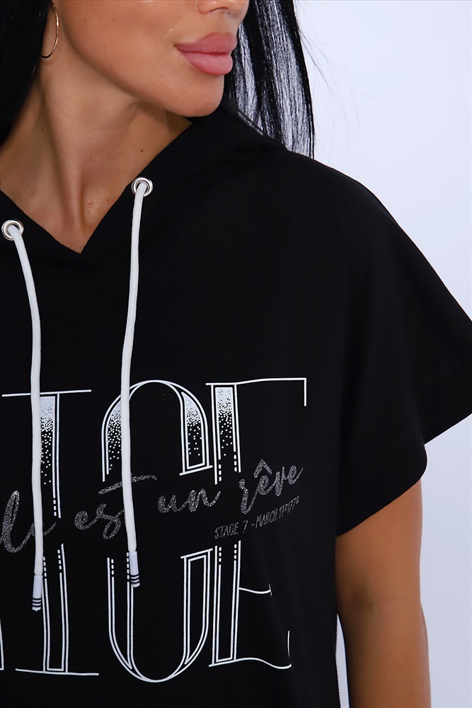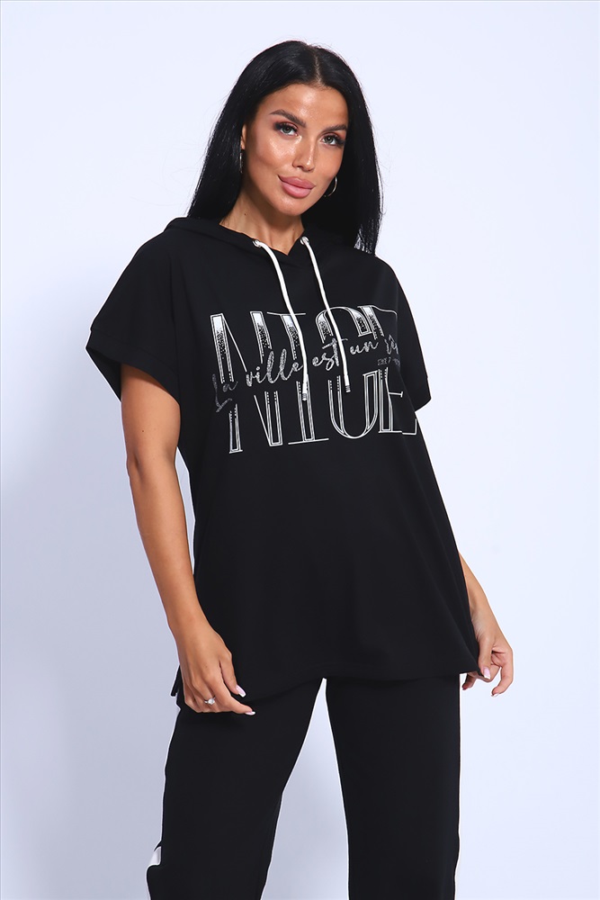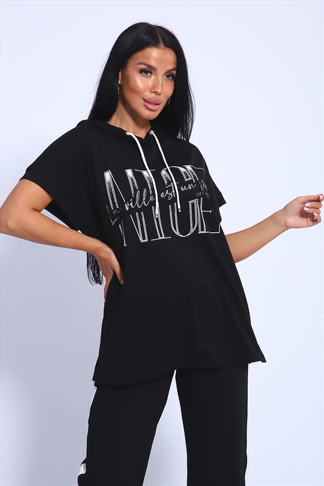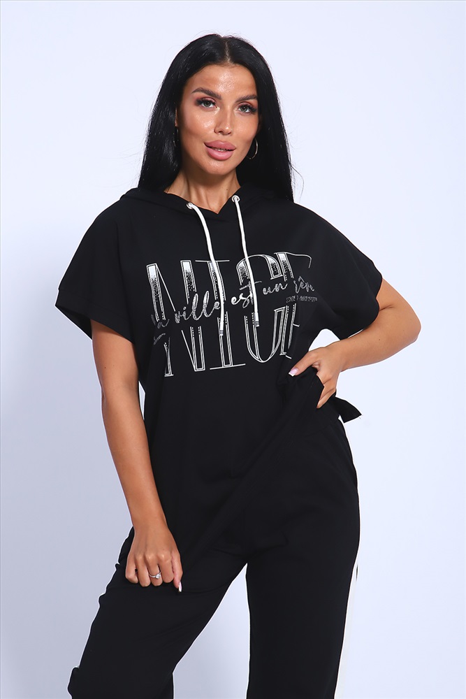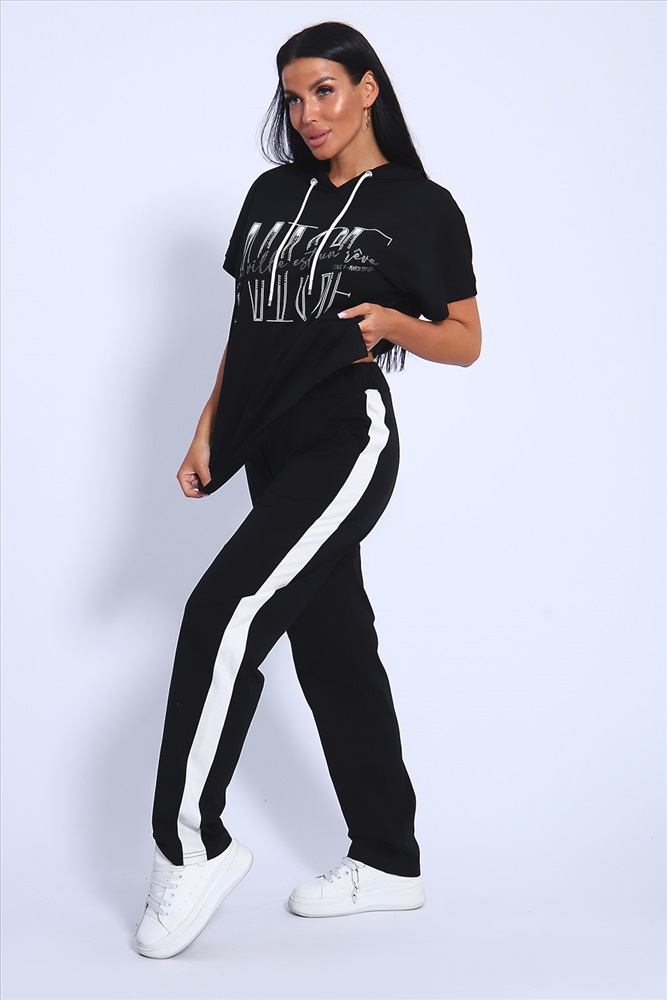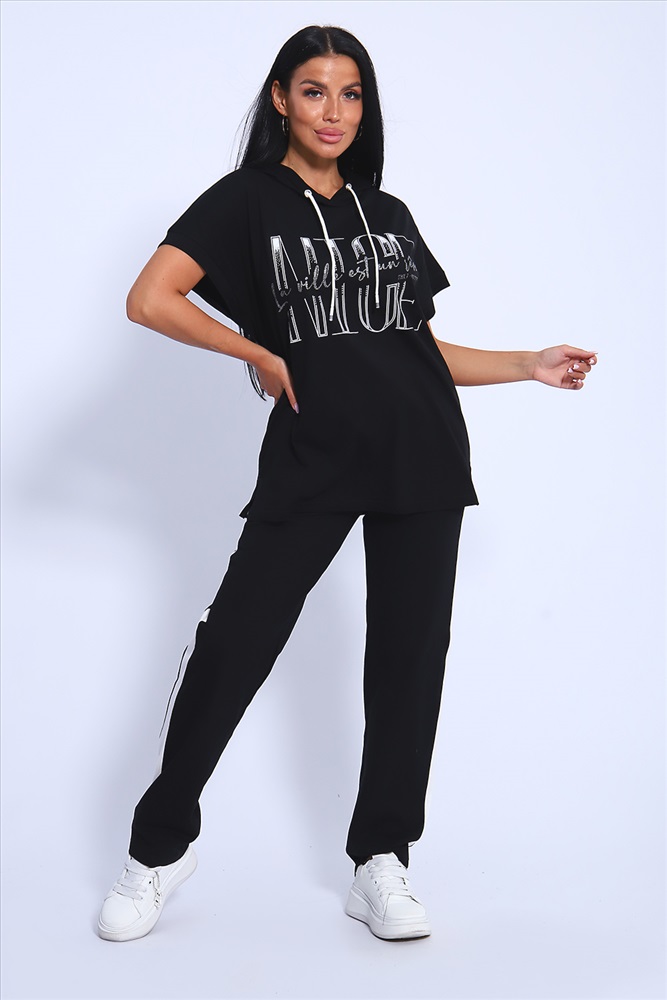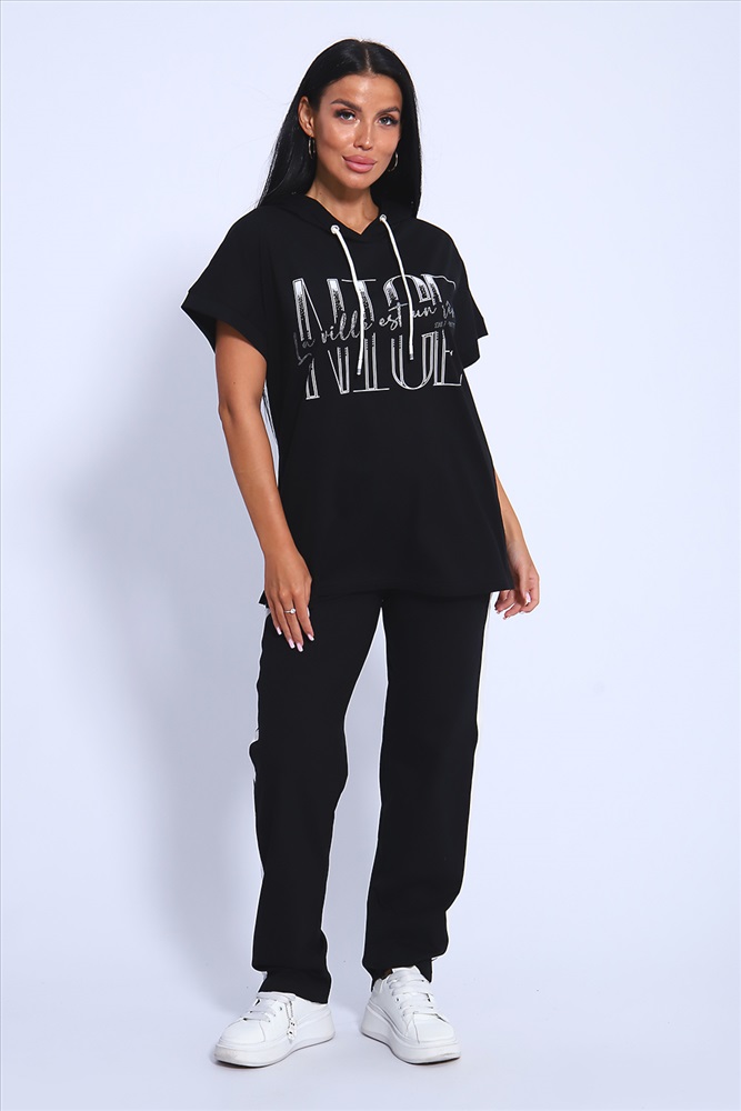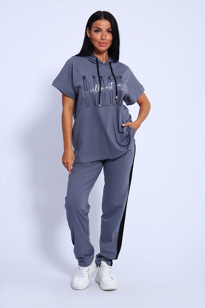 Застежка: без застежки Классический и удобный трикотажный костюм с брюками из 100%-го хлопка! В комплекте костюма представлены кофта свободного кроя с капюшоном и брюки c тонкими лампасами универсальной посадки. Кофта украшена ярким принтом, состоящим из крупных латинских букв, контрастирующими с общим фоном изделия. Костюм - идеальный вариант домашней одежды для женщин, также прекрасно подойдет и для повседневной носки, прогулок и занятий спортом.