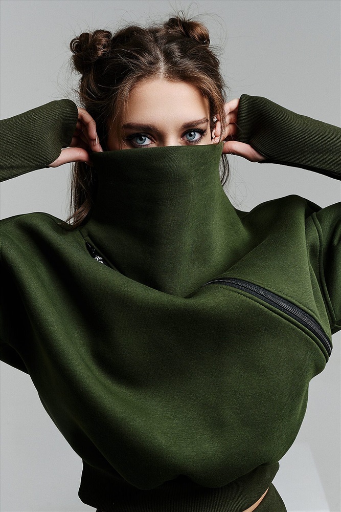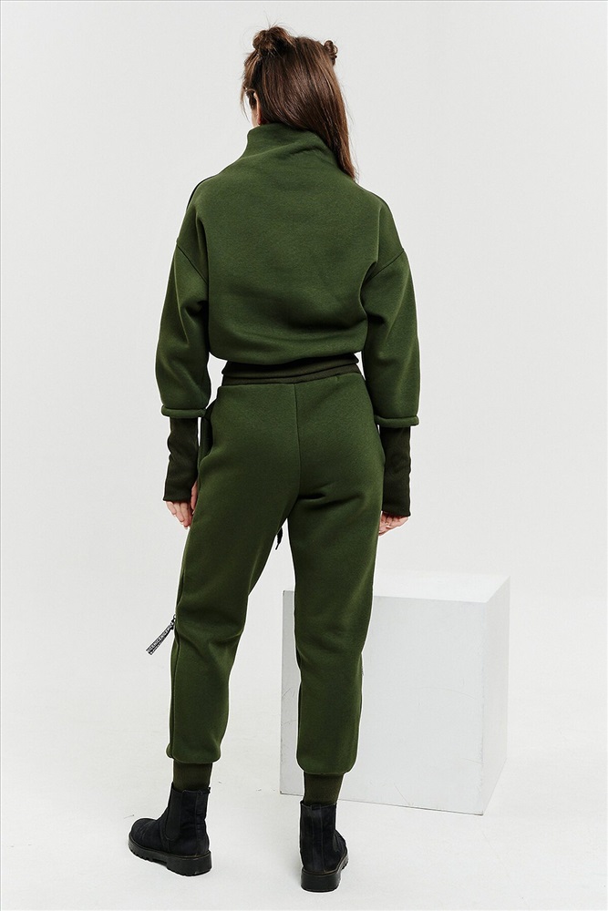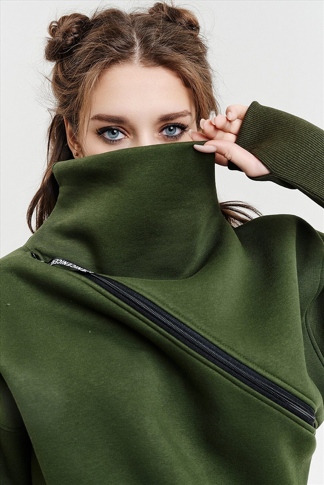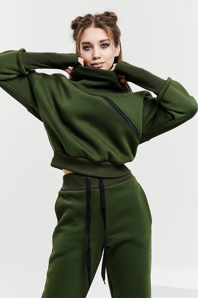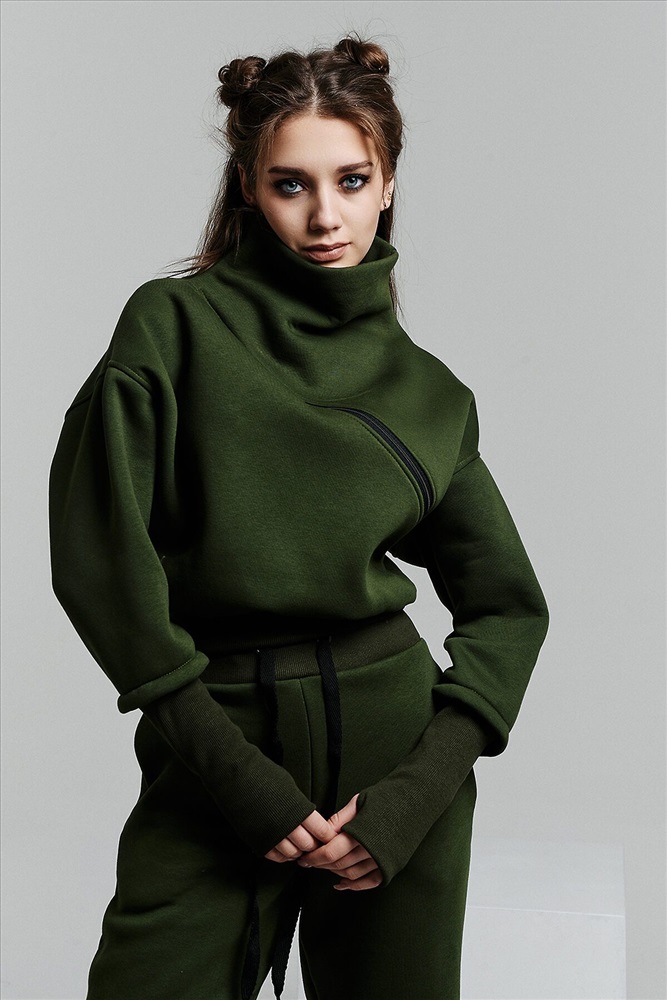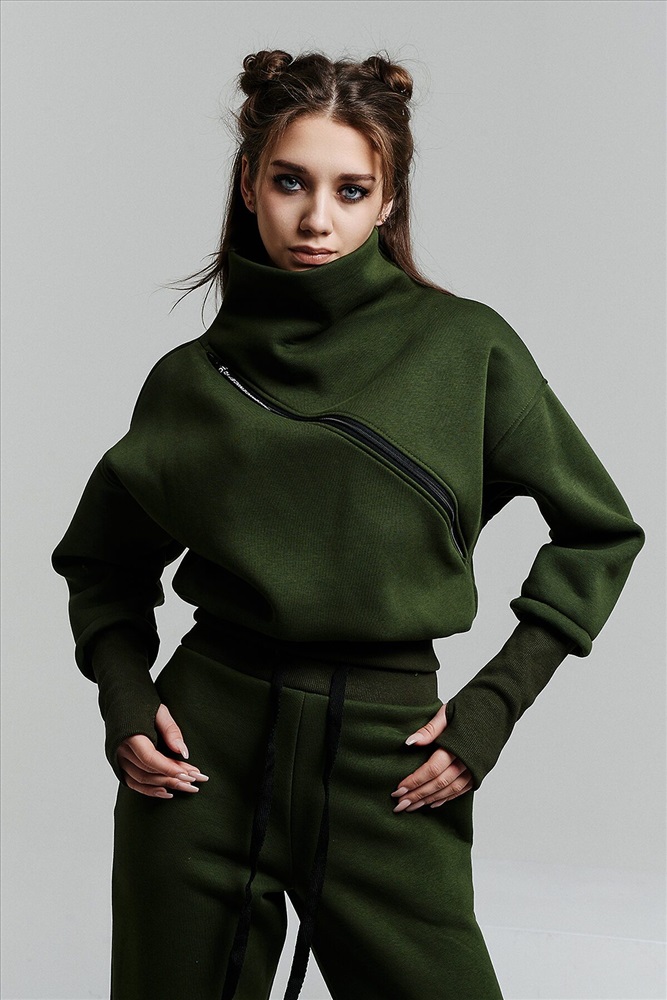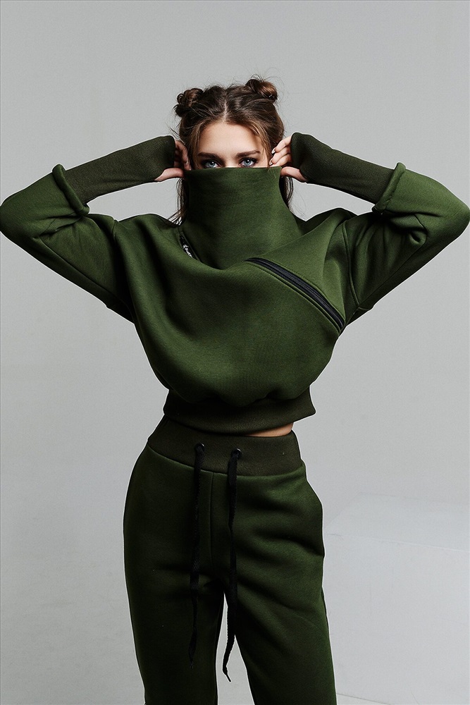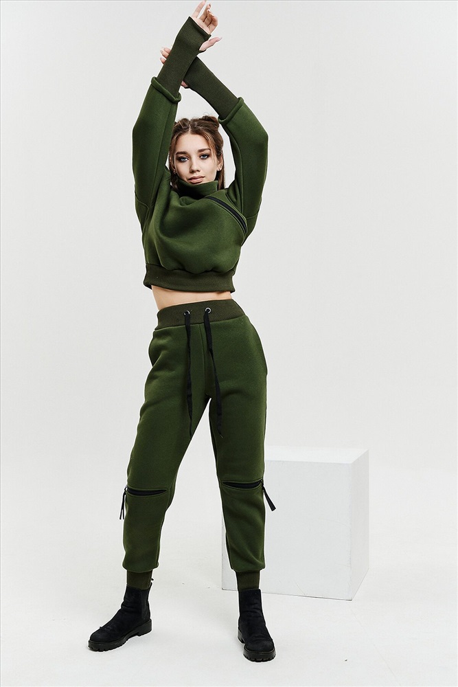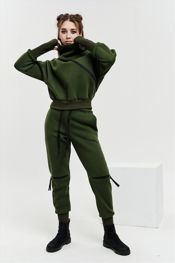 Удобный и стильный женский спортивный костюм. Состоит из свитшота и брюк-" джогеров". Толстовка и брюки оформлены функциональными, декоративными молниями. Толстовка с удобным воротником-стойкой, низ рукавов обработан высокой манжетой-перчаткойиз кашкорсе. Джогеры с высокой посадкой и широкой эластичной резинкой на поясе со шнурком. Низки брюк обработаны манжетами, что очень удобно при носке и отлично смотрятся с грубыми ботинками в стиле "челси". Спортивный костюм подходит как для зимних видов спорта, лыж, коньков, так и в холодную погоду осенью, весной. Расцветки "хаки" и "хаки с разрезом" отличаются отсутствием/наличием разреза на воротнике-стойке.