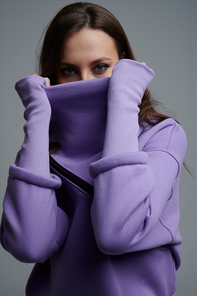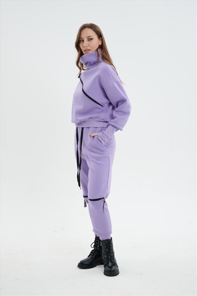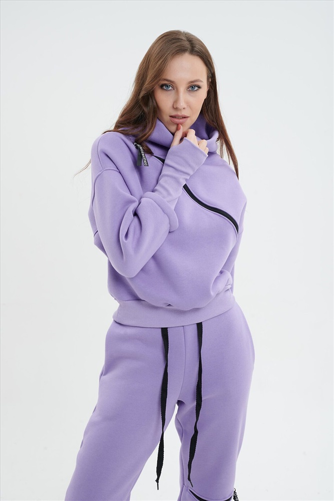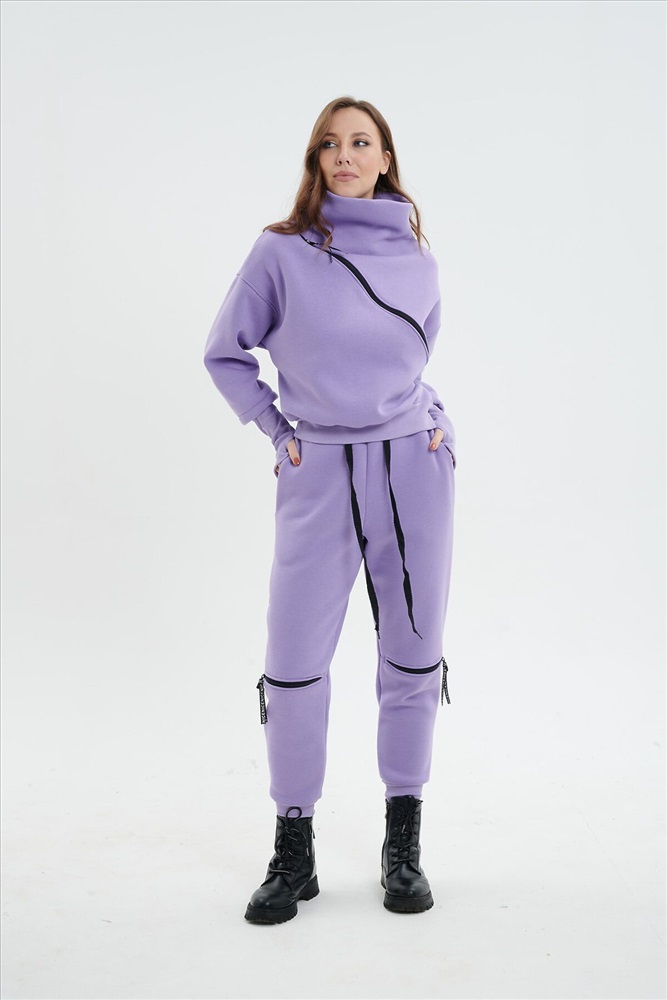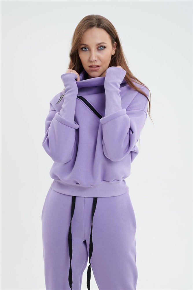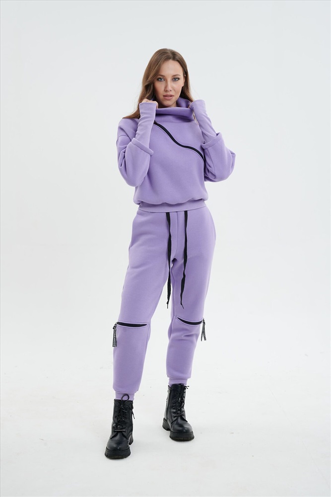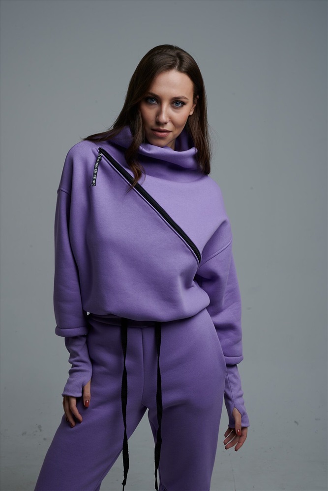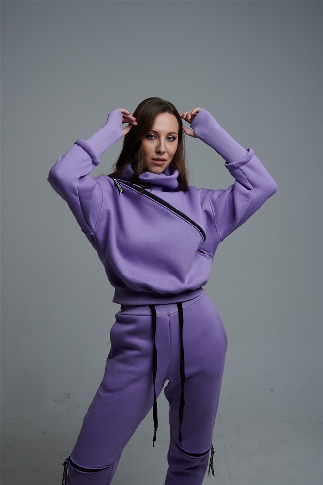 Удобный и стильный женский спортивный костюм. Состоит из свитшота и брюк-" джогеров". Толстовка и брюки оформлены функциональными, декоративными молниями. Толстовка с удобным воротником-стойкой, низ рукавов обработан высокой манжетой-перчаткойиз кашкорсе. Джогеры с высокой посадкой и широкой эластичной резинкой на поясе со шнурком. Низки брюк обработаны манжетами, что очень удобно при носке и отлично смотрятся с грубыми ботинками в стиле "челси". Спортивный костюм подходит как для зимних видов спорта, лыж, коньков, так и в холодную погоду осенью, весной. Расцветки "хаки" и "хаки с разрезом" отличаются отсутствием/наличием разреза на воротнике-стойке.