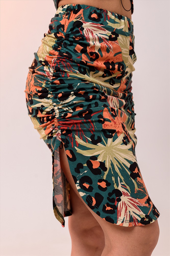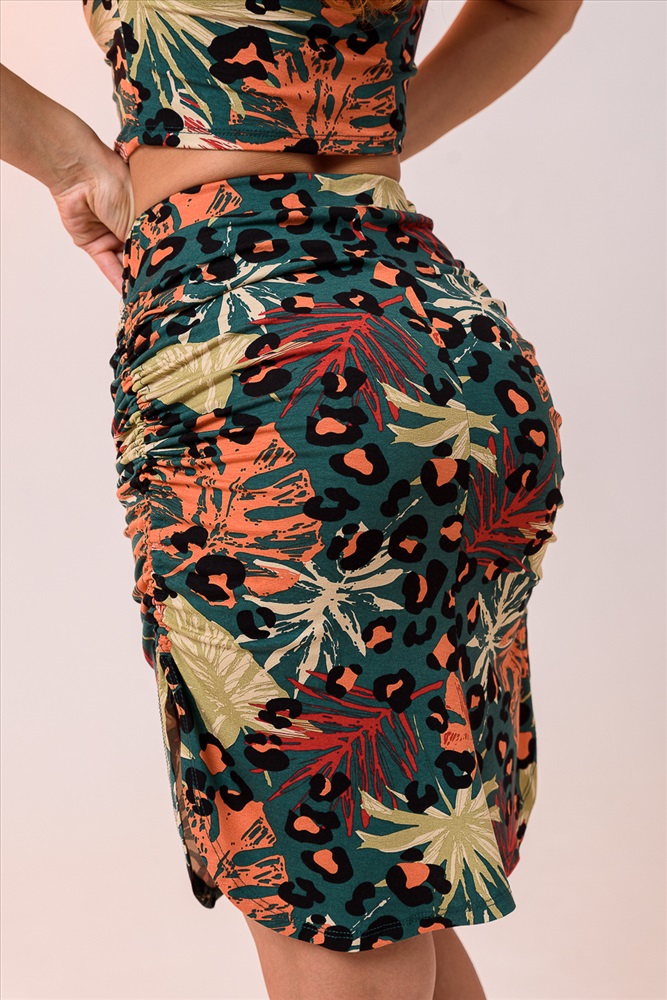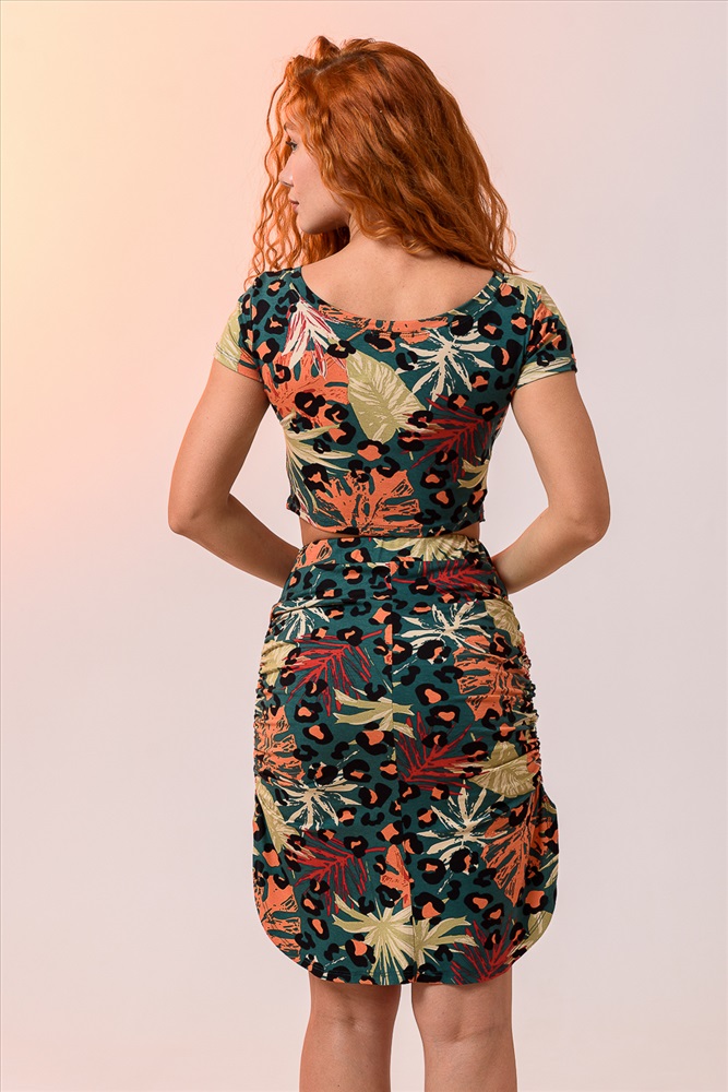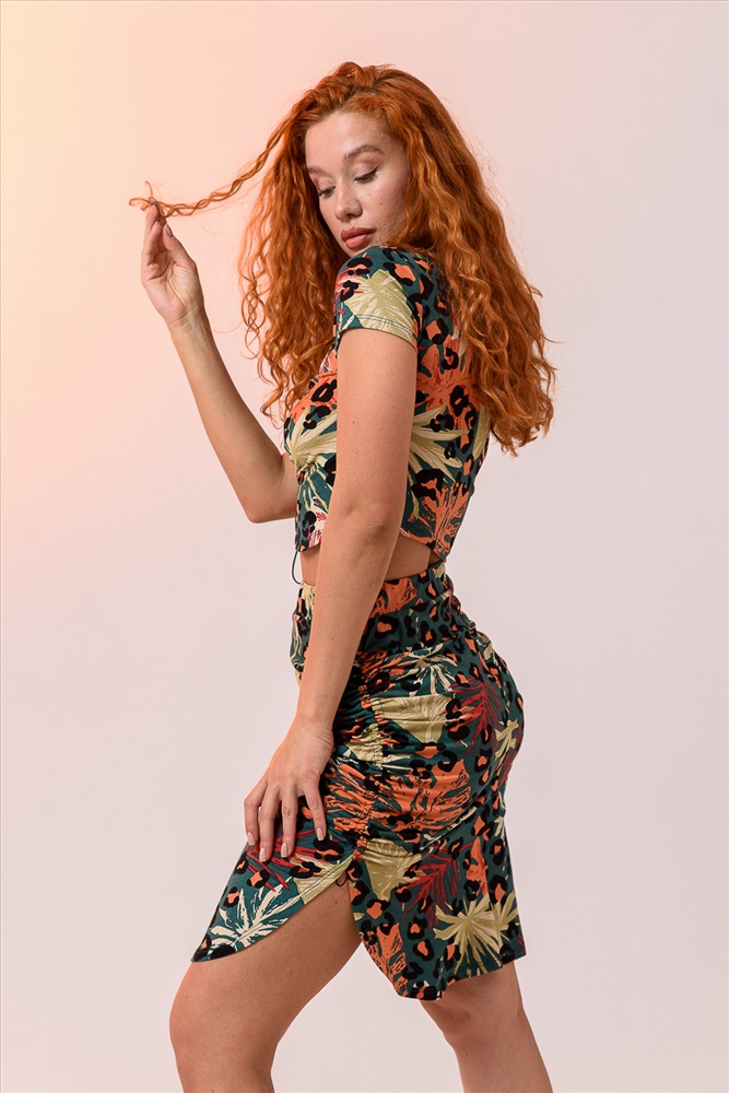 Застежка: без застежки Костюм летний женский состоит из юбки и топа прилегающего силуэта. Выполнен из качественного мягкого материала хорошей растяжимости не сковывает движения. Топ укороченный с коротким рукавом и глубоким вырезом горловины. По центру полочки походит эластичная тонкая резинка, которой вы сможете отрегулировать желаемую длину топа и драпировку. Юбка длиной миди, с высокой посадкой на талии и широким поясом с тонкой эластичной резинкой в боковых швах, в которой вы так же сможете отрегулировать нужную вам длину и частоту драпировки. Оставшейся конец петли завязать.