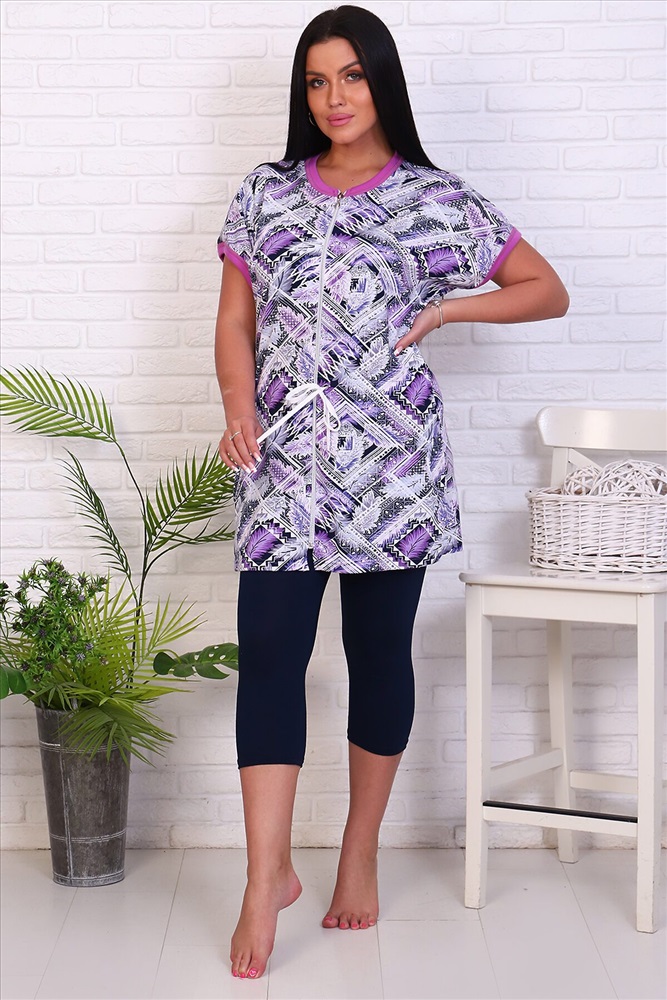 ID товара: 768262 Состав: 100% хлопок; 92% вискоза, 8% лайкра Сезон: Весна/Лето Длина: Средняя Фасон: Полуприлегающий Рукав: Короткий Вид застежки: Молния Декоративные элементы: Кулиска Основная ткань: Хлопок | Вискоза, кулирка Стиль: Повседневный Страна бренда: Россия Страна производства: Россия Костюм женский состоит из туники из кулирки и вискозных бриджей. Туника удлиненная на молнии, по линии талии проходит кулиска со шнуром, горловина с контрастной окантовкой. Рукав спущенный с контрастной окантовкой. Ткань с оригинальным принтом. Костюм подойдет для дома, отдыха и прогулок. Комментарии к товару
