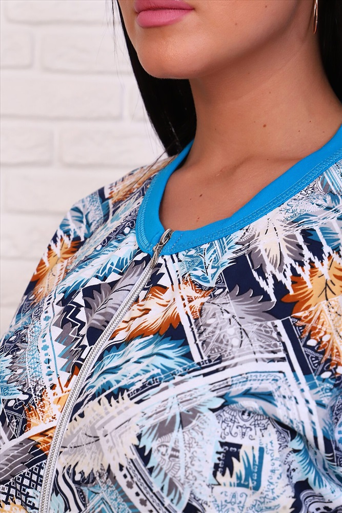 Костюм женский состоит из туники из кулирки и вискозных бриджей. Туника удлиненная на молнии, по линии талии проходит кулиска со шнуром, горловина с контрастной окантовкой. Рукав спущенный с контрастной окантовкой. Ткань с оригинальным принтом. Костюм подойдет для дома, отдыха и прогулок.