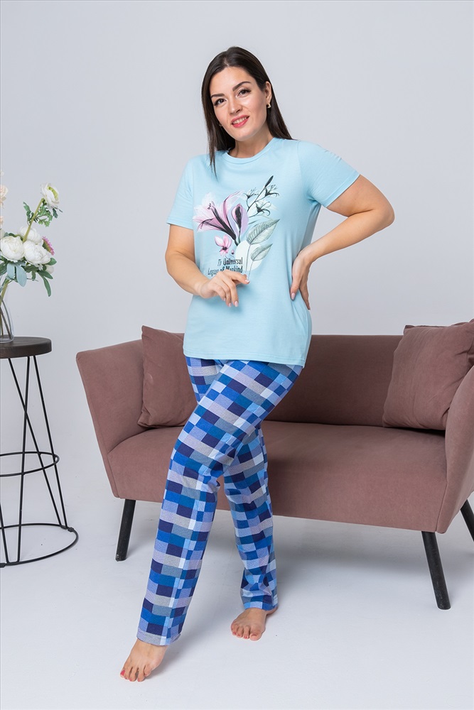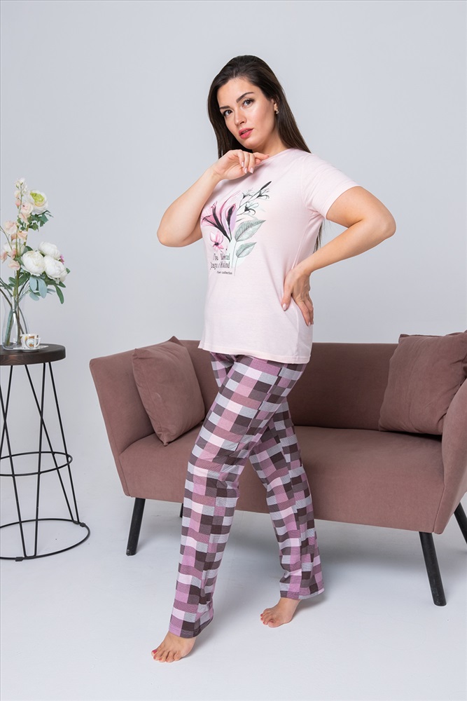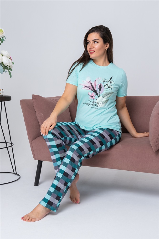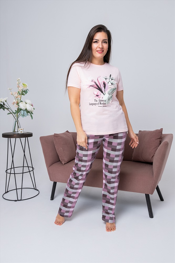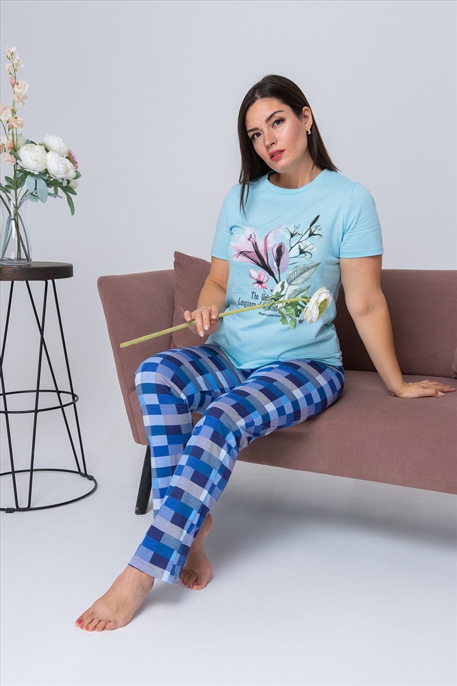 Застежка: без застежки Костюм женский состоит из футболки с коротким рукавом из ткани кулирка гладь, на полочке красивый принт, и брюк из ткани кулирка, принт - клетка. Костюм для дома, отдыха, комфортный, удобный, не меняет цвет после стирки.