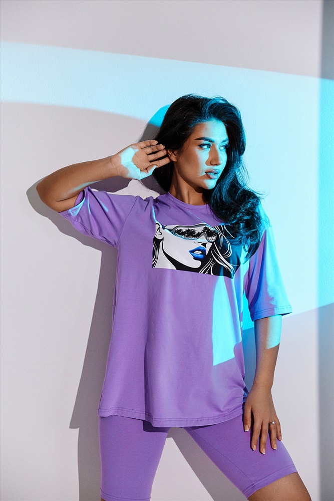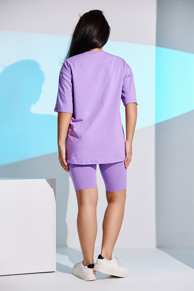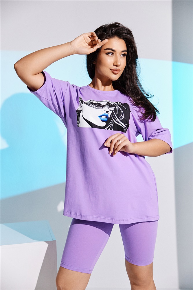 Застежка: без застежки Костюм женский - свободная футболка и облегающие бриджи выполнен из кулирки с лайкрой. Спереди на футболке оригинальный принт. Горловина обработана бейкой, низ изделия и рукав подшиты. Костюм очень удобный и приятный к телу, идеально подойдет как для дома, так и для отдыха и прогулок.