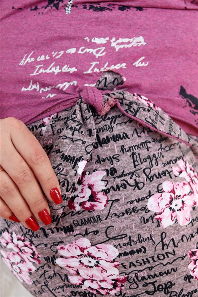 Костюм женский туника и брюки капри. Рукав цельнокроеный, короткий. Туника из однотонной ткани, на полочке принт, брюки из отделочной ткани. Вырез горловины - лодочка. Ширина туники по бедрам регулируется завязками. Горловина, низ рукава обработаны широкой окантовкой из отделочной ткани. Брюки свободные, слегка зауженные к низу, с внутренними карманами. Низ брюк заканчивается манжетой.
