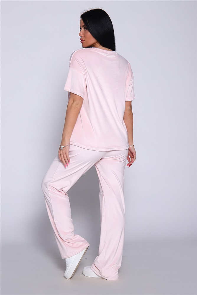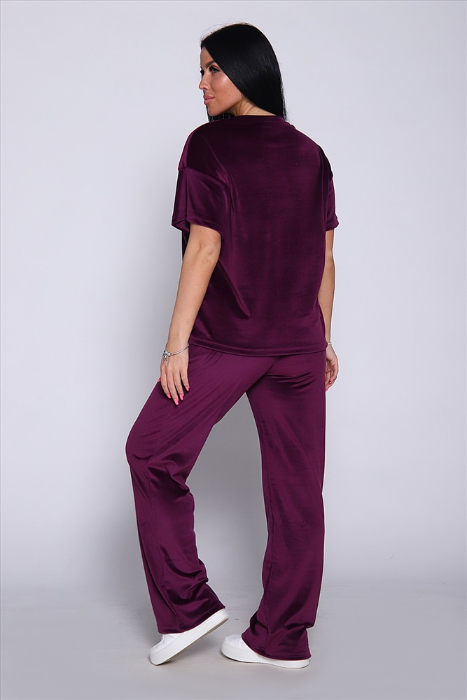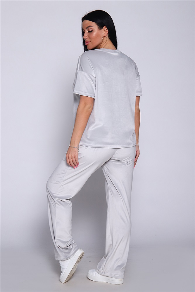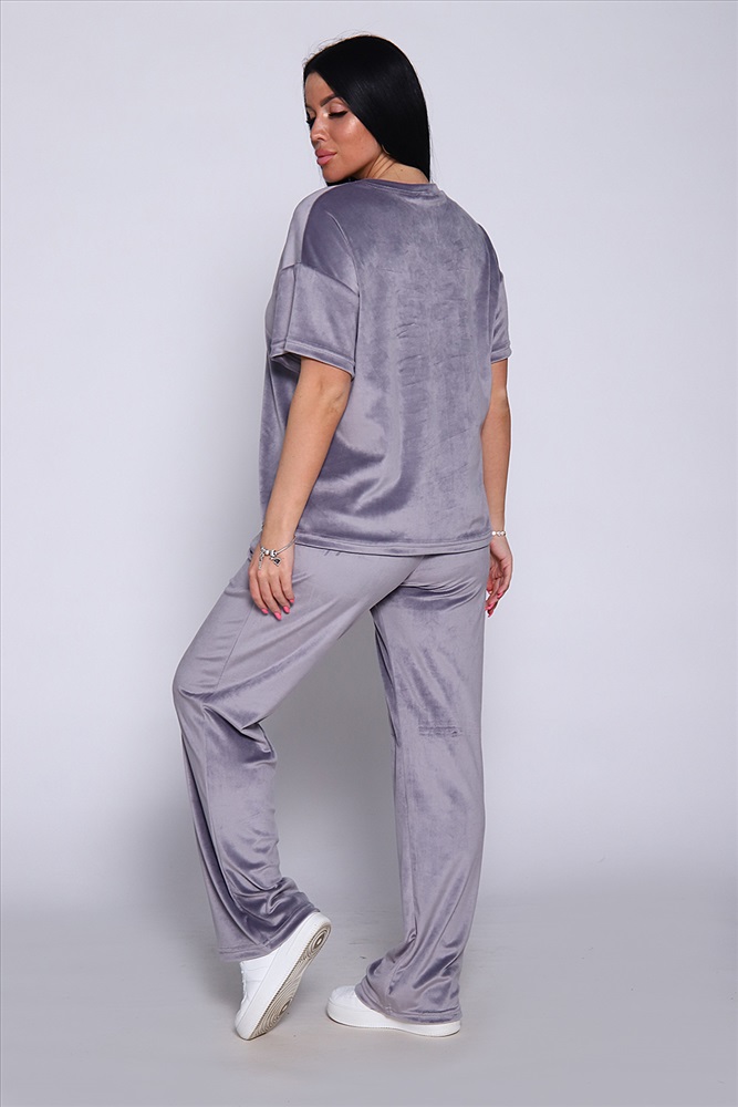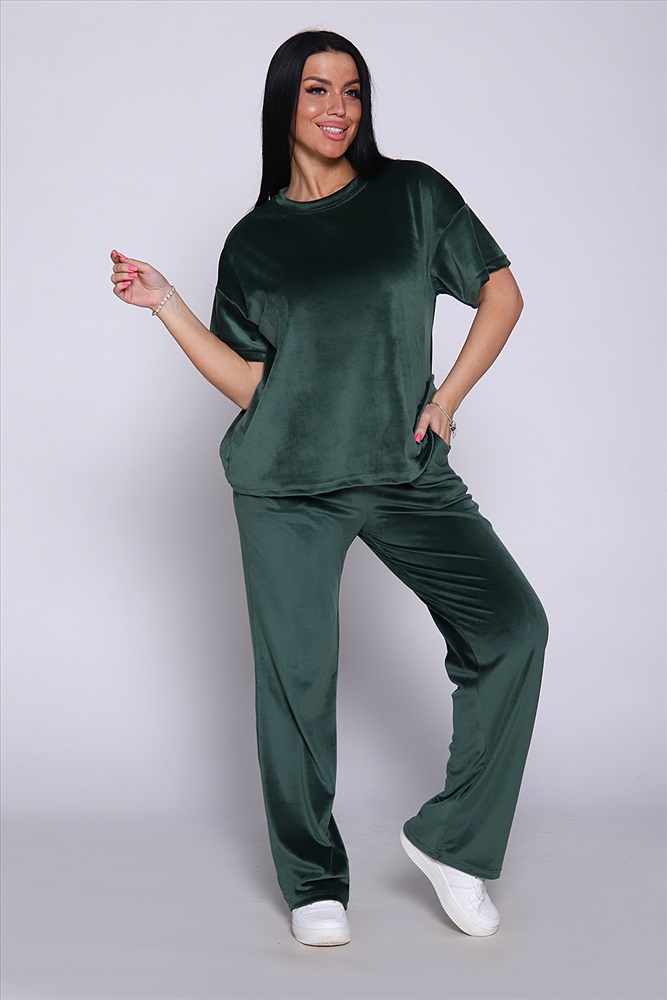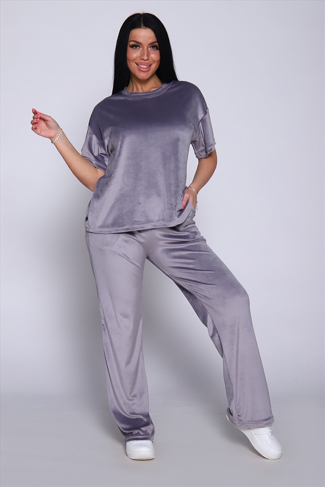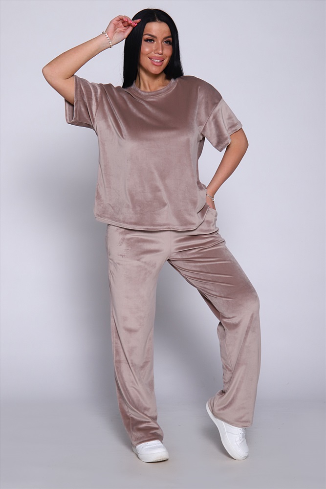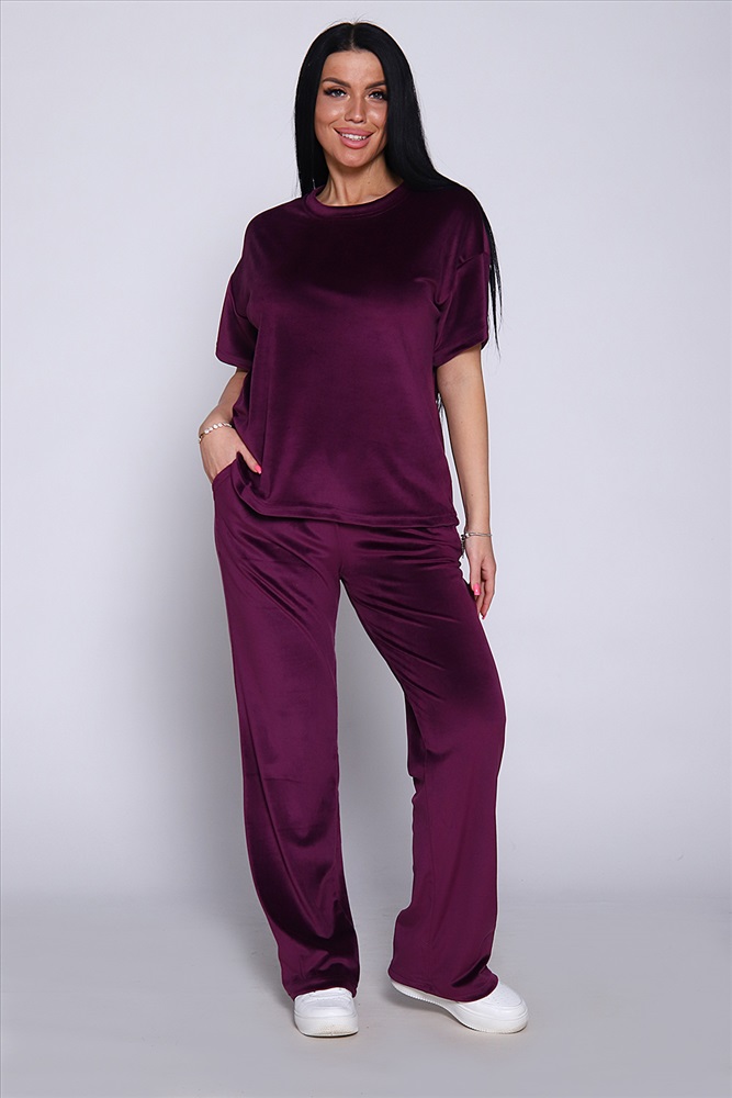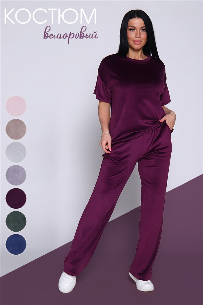 Застежка: без застежки Костюм женский велюровый, повседневный, всесезонный. Костюм состоит из футболки и брюк. Футболка оверсайз прямого силуэта, длиной до бедра. Рукав втачной со спущенным плечом, длиной чуть выше локтя. Горловина с обтачкой, низ футболки с подгибкой. Брюки прямого силуэта, умеренного объема. На передних половинках брюк карманы с отрезным бочком. Пояс притачной с эластичной тесьмой. Низ брюк подгибка. Замеры объема талии брюк по нерастянутой резинке. Параметры модели 97-71-101. На модели представлен 48 размер.