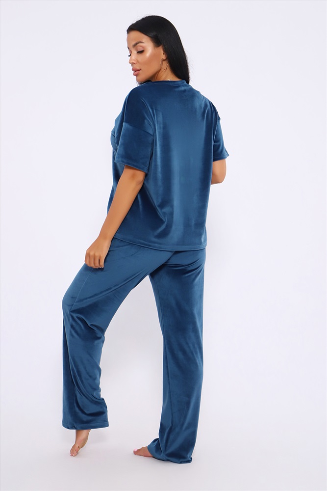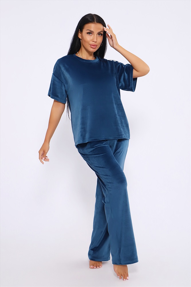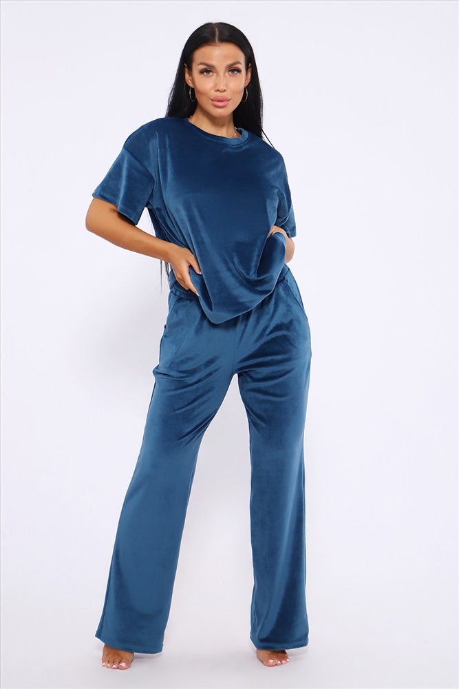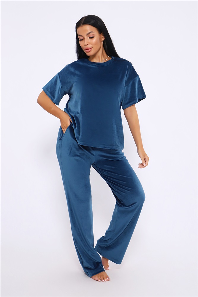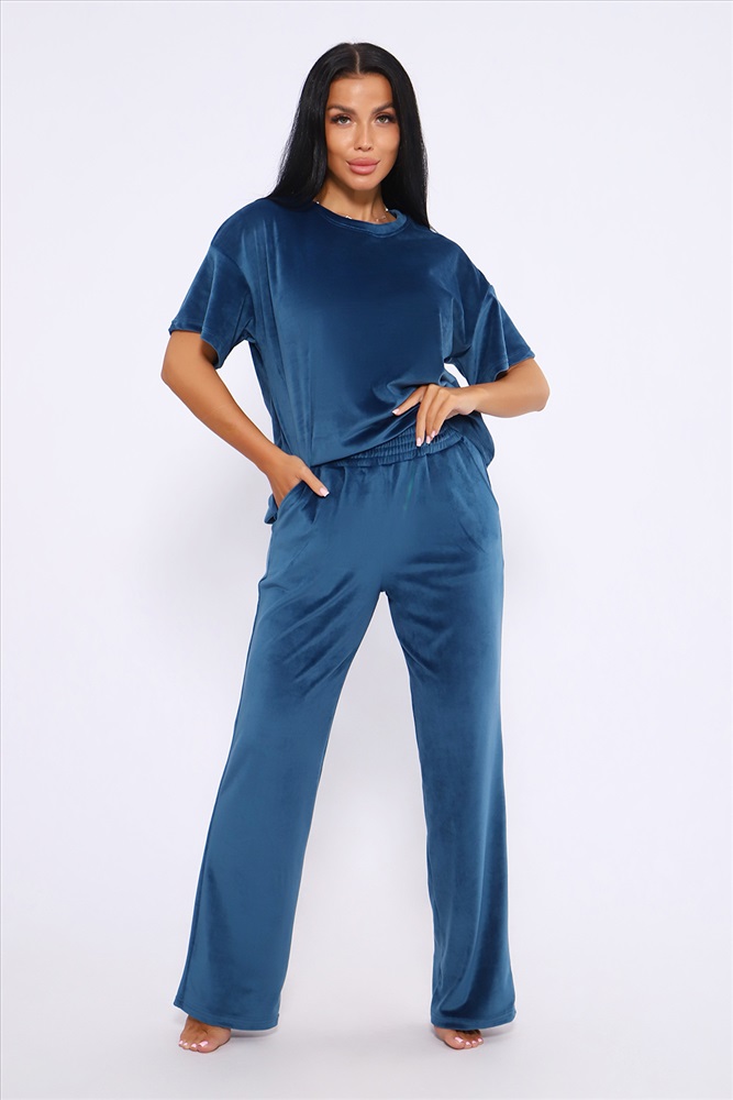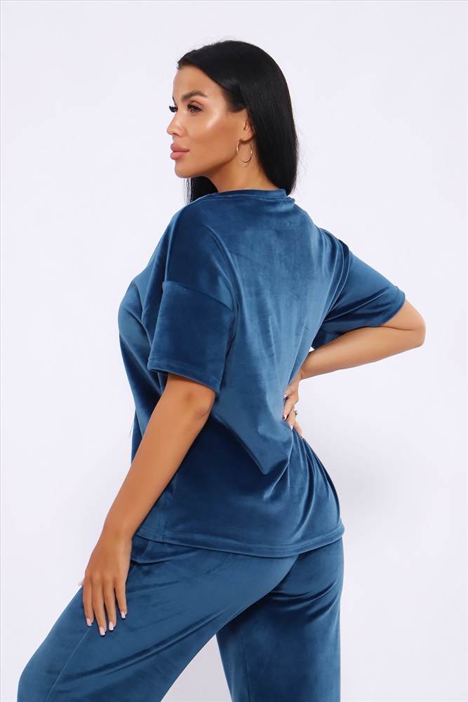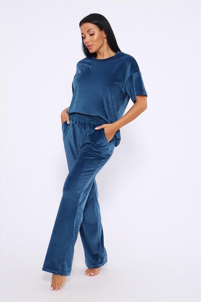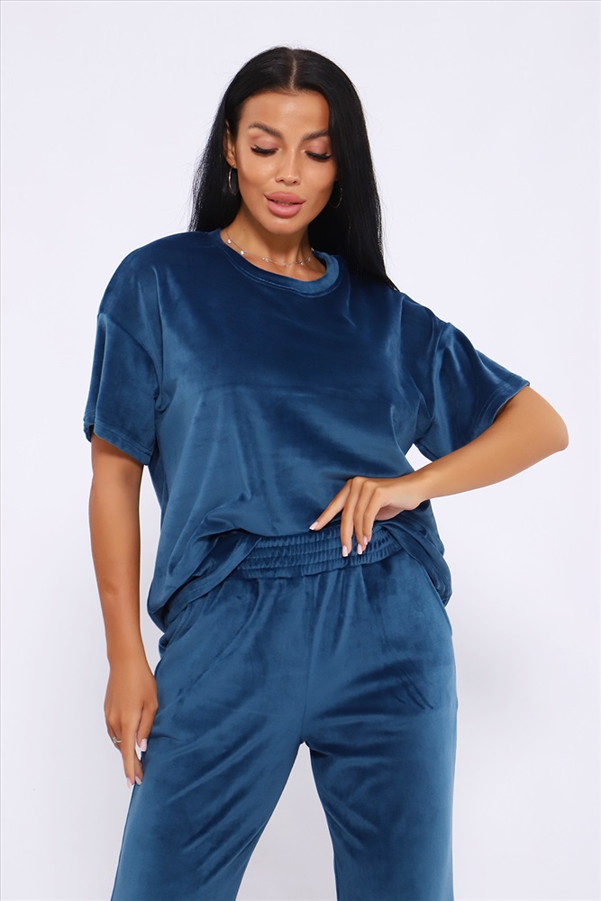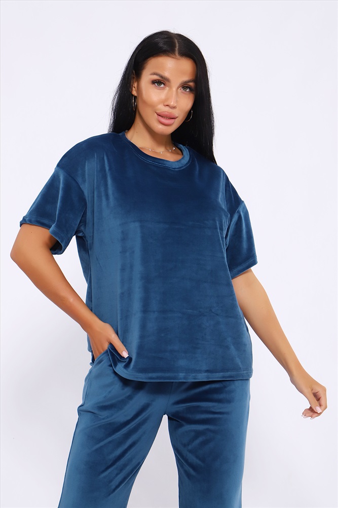 Застежка: без застежки Костюм женский велюровый, повседневный, всесезонный. Костюм состоит из футболки и брюк. Футболка оверсайз прямого силуэта, длиной до бедра. Рукав втачной со спущенным плечом, длиной чуть выше локтя. Горловина с обтачкой, низ футболки с подгибкой. Брюки прямого силуэта, умеренного объема. На передних половинках брюк карманы с отрезным бочком. Пояс притачной с эластичной тесьмой. Низ брюк подгибка. Замеры объема талии брюк по нерастянутой резинке. Параметры модели 97-71-101. На модели представлен 48 размер.