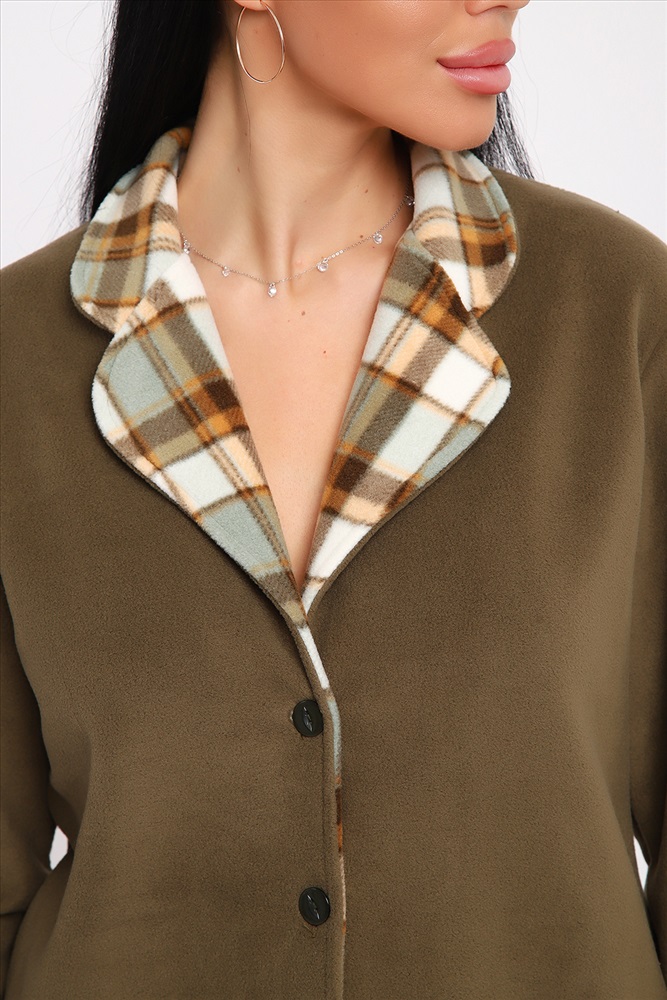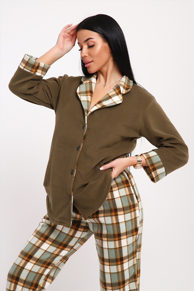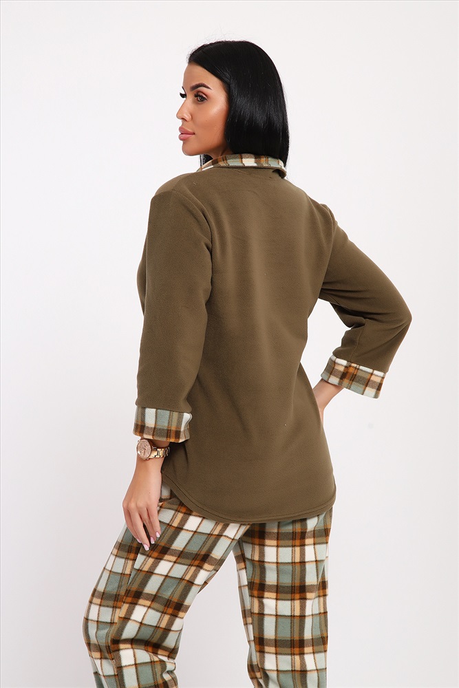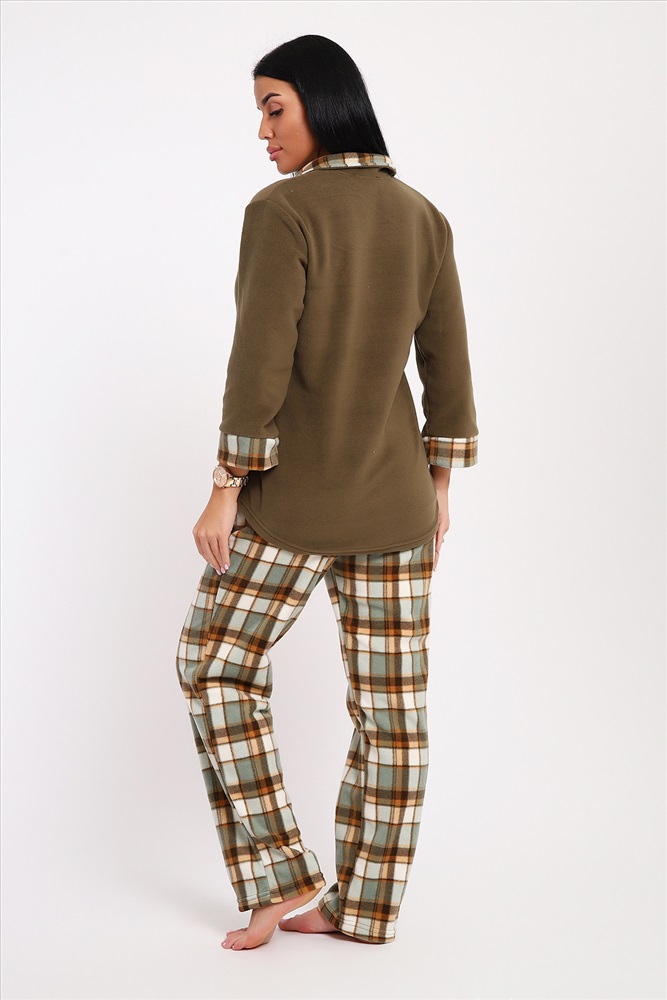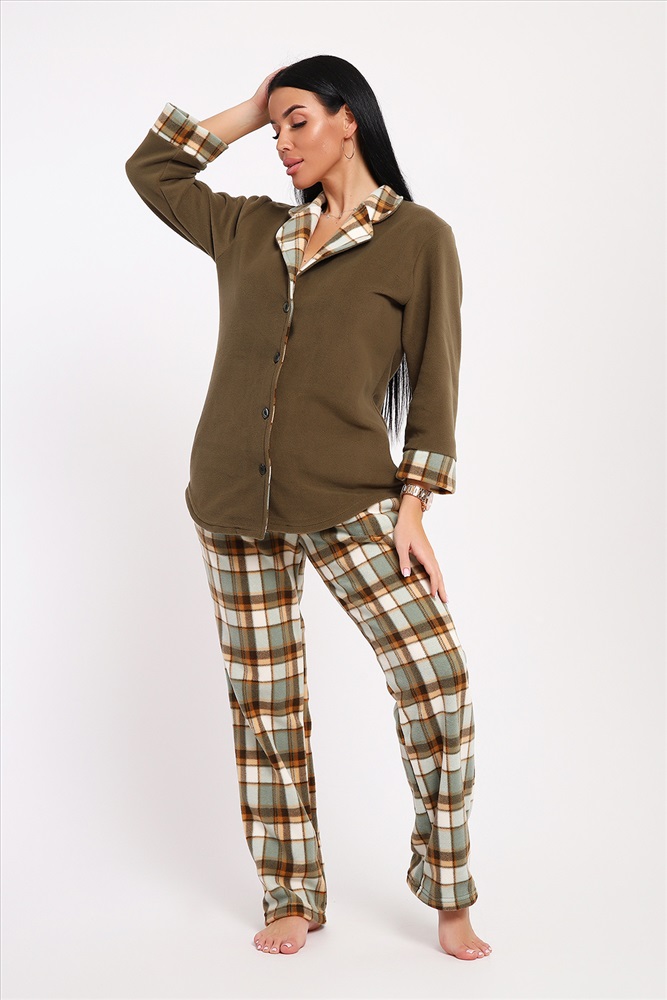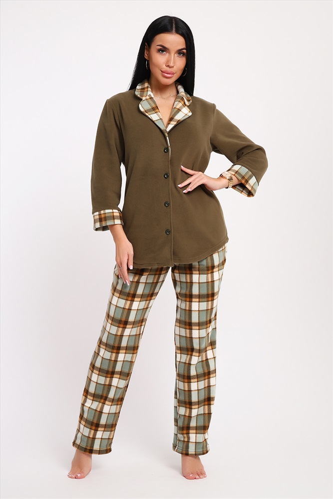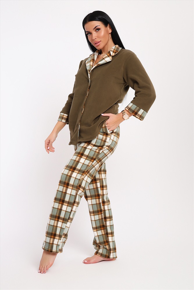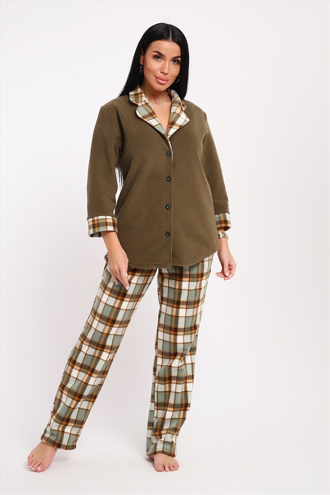 Застежка: пуговицы Домашний женский костюм из мягкого, теплого флиса. Кофта полуприлегающего силуэта, застегивается на петли и пуговицы. Длиной до бедер с фигурной линией низа. Рукав втачной, длиной 3/4 с манжетом из отделочной ткани. Воротник пиджачного типа с закругленными углами, из отделочной ткани. Борта, воротник и лацканы отстрочены. Домашние брюки прямого кроя с вместительными карманами в боковом шве, комфортный пояс на резинке, располагается на линии талии, длина брюк ниже щиколотки. В таблице замеров готовых изделий в столбце Объем бедер, см указан Обхват низа кофты. По запросу вышлем Обхват манжеты рукава На модели представлен 46 размер. Параметры модели 165 см, 97-71-101.