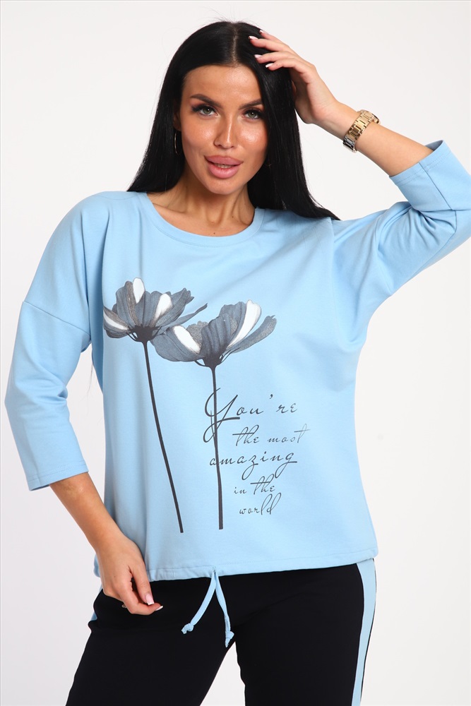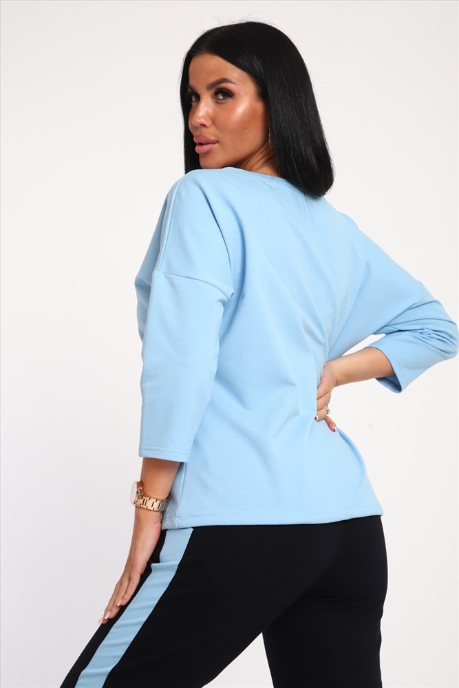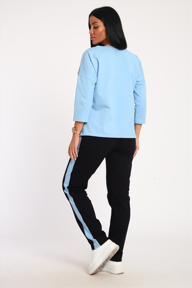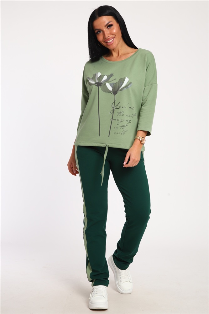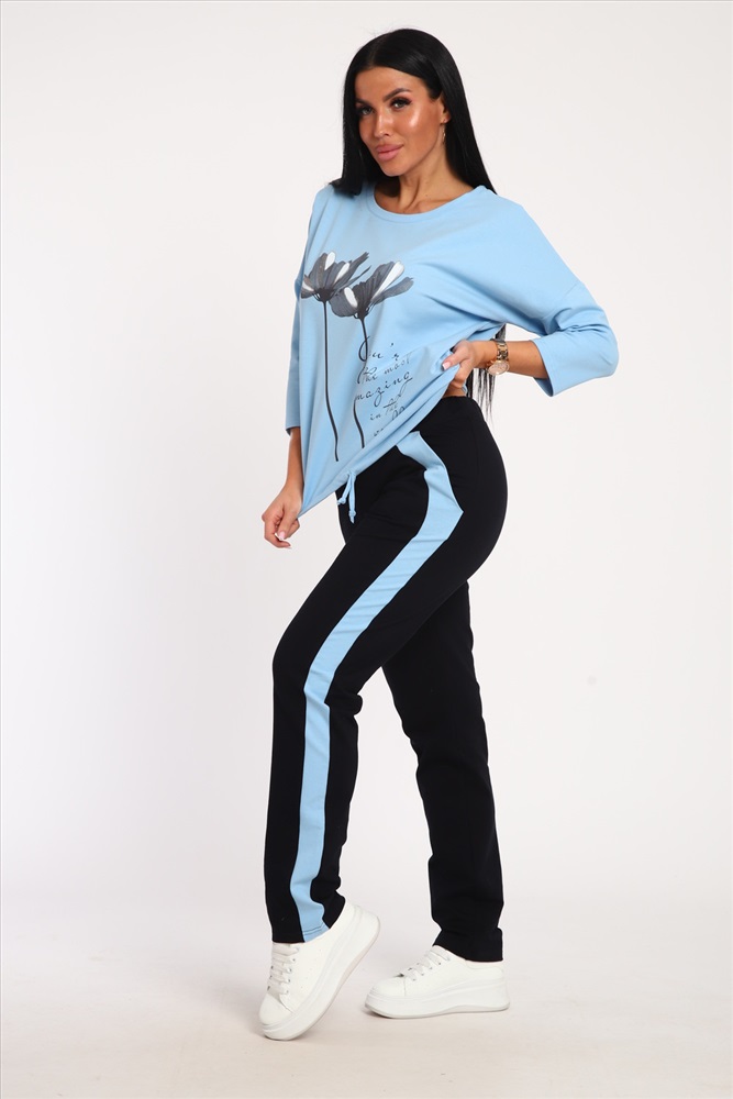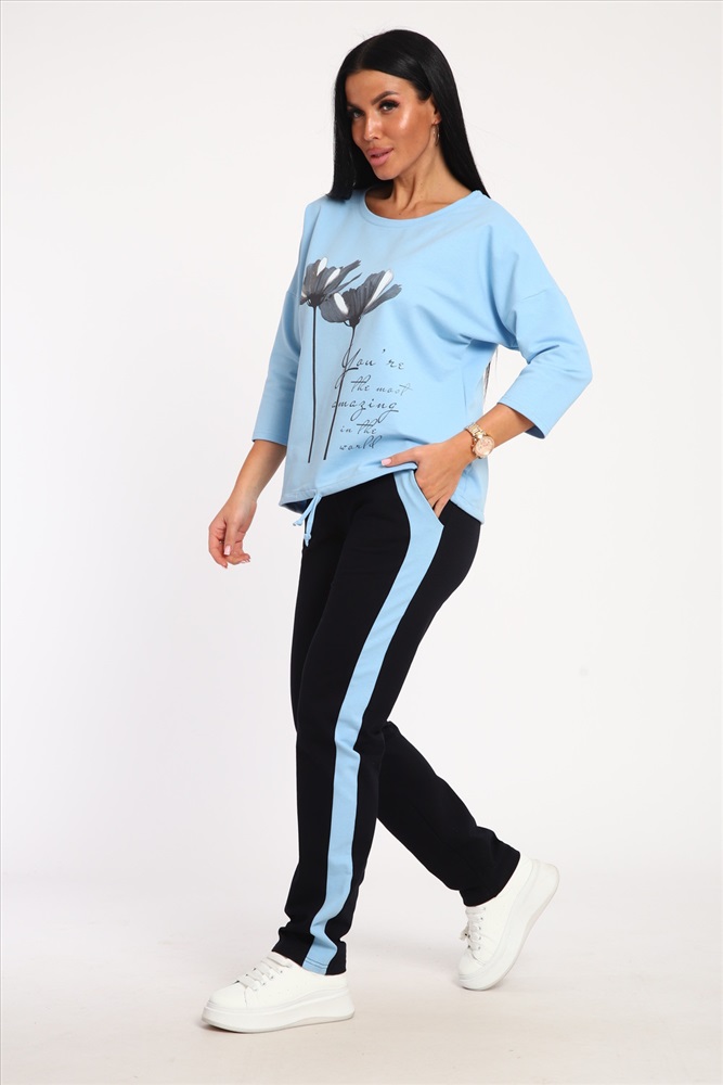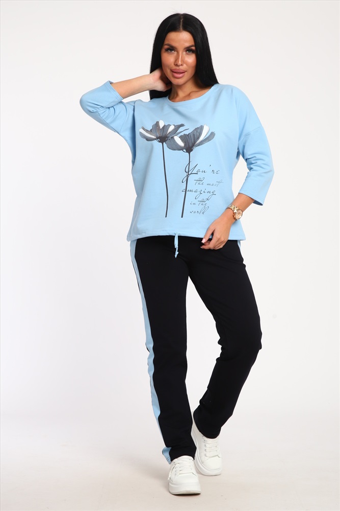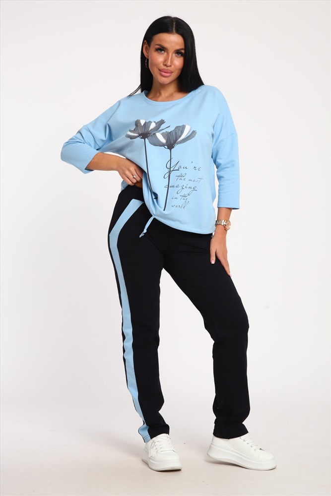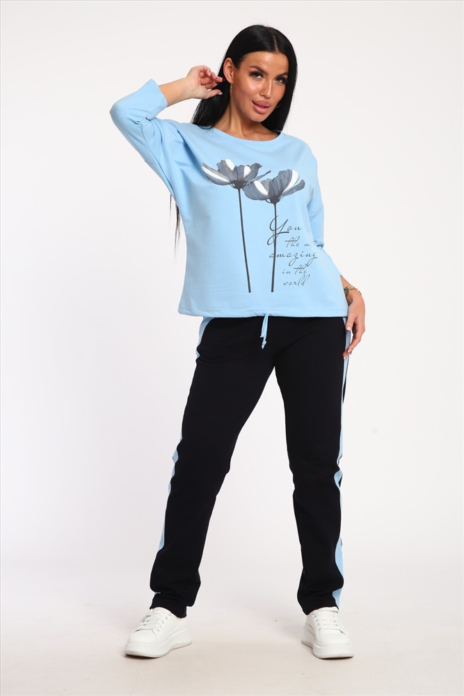 Застежка: без застежки Костюм женский выполнен из футера с лайкрой. Состоит из кофты без карманов и брюк прямого силуэта с лампасами. Кофта имеет внизу регулировку, что позволяет затягивать или оставлять или оставлять кофту свободной. У костюма широкий размерный ряд.