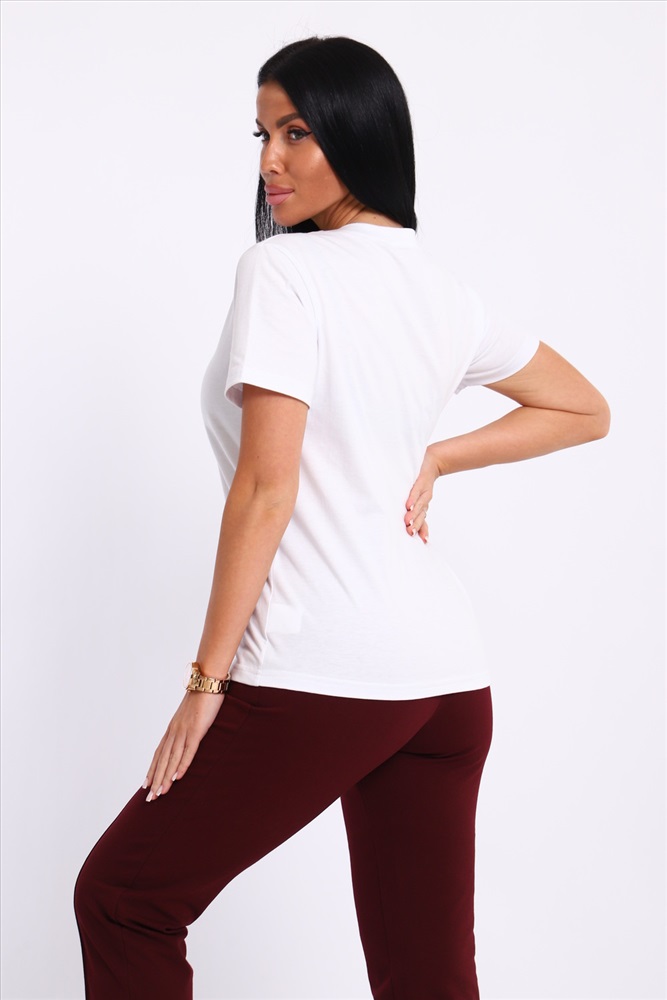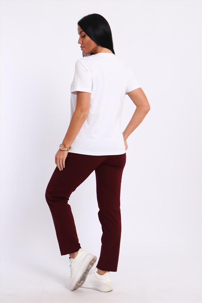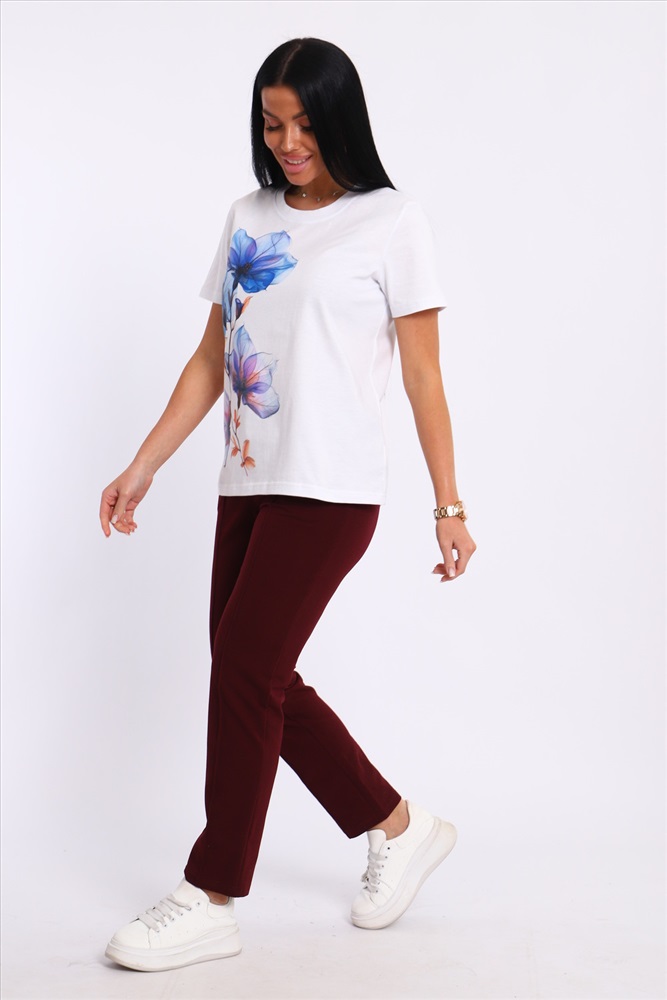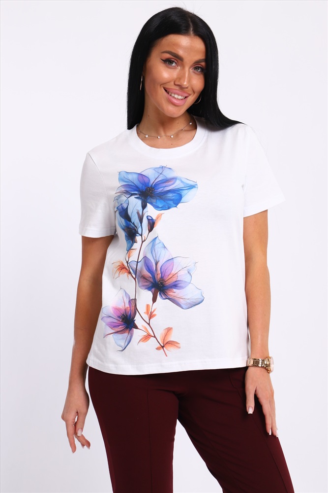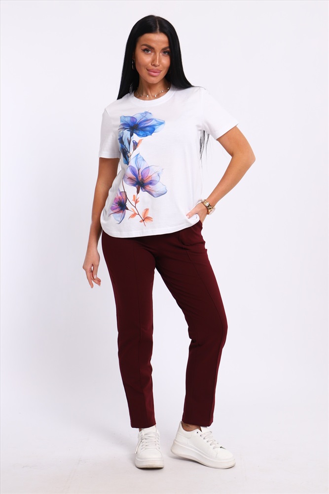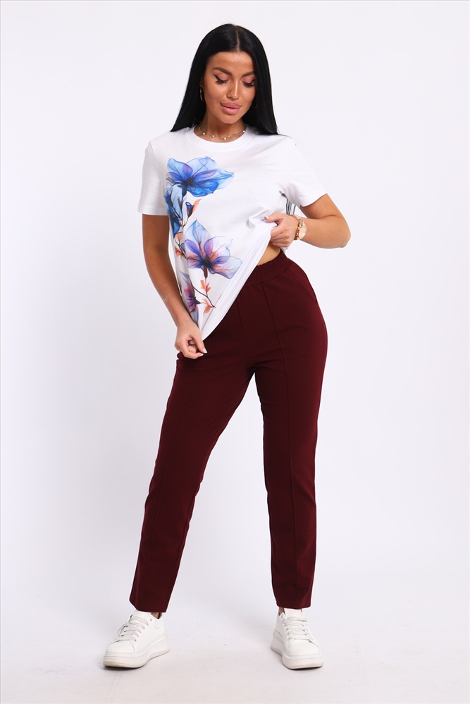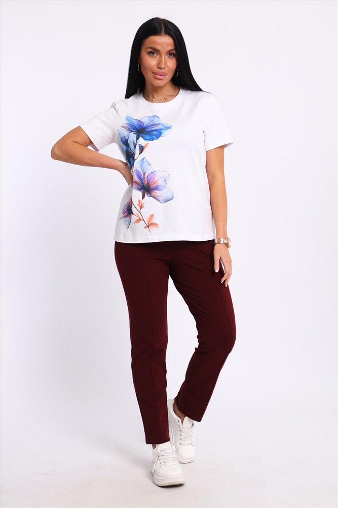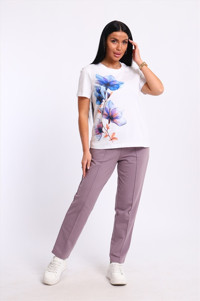 Застежка: без застежки Представляем вашему вниманию современный костюм, состоящий из брюк и футболки. Брюки классические с отстроченной стрелкой спереди, двумя карманами, пояс на резинке. Футболка свободного кроя, с принтом. Костюм обладает отменными практическими характеристиками, и на долгое время сохранит свой первоначальный вид.