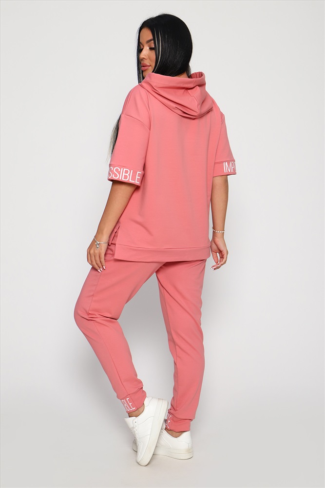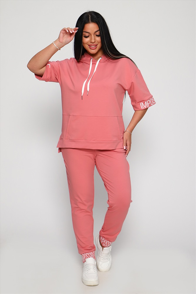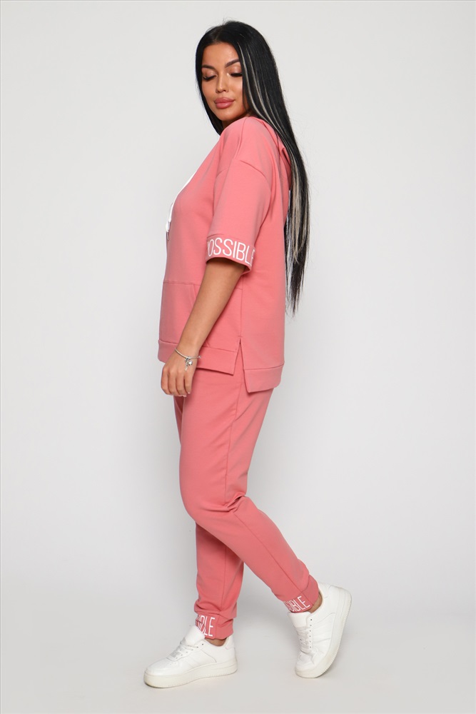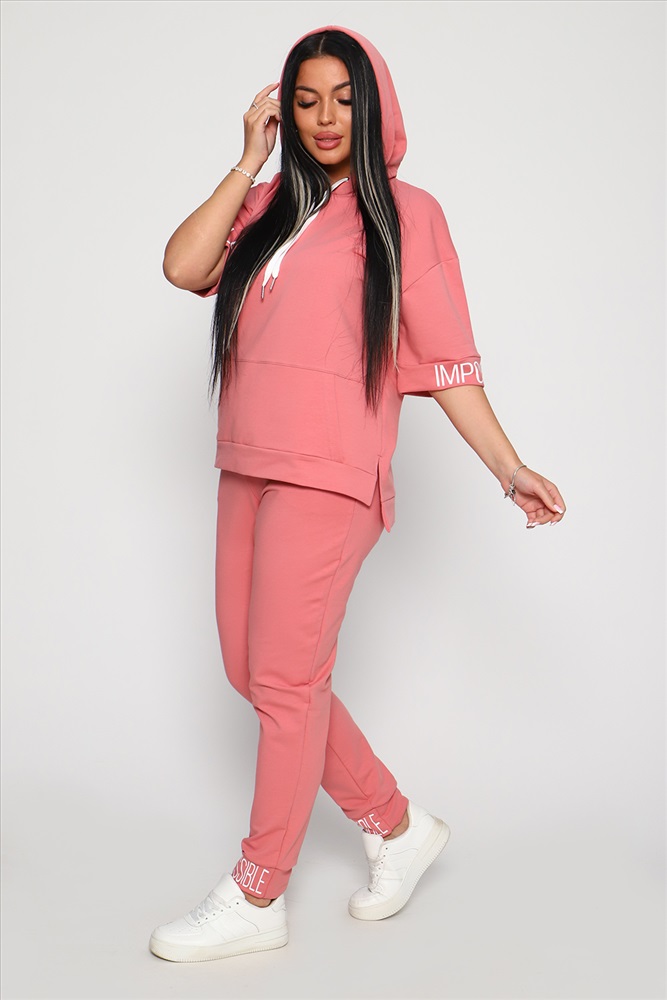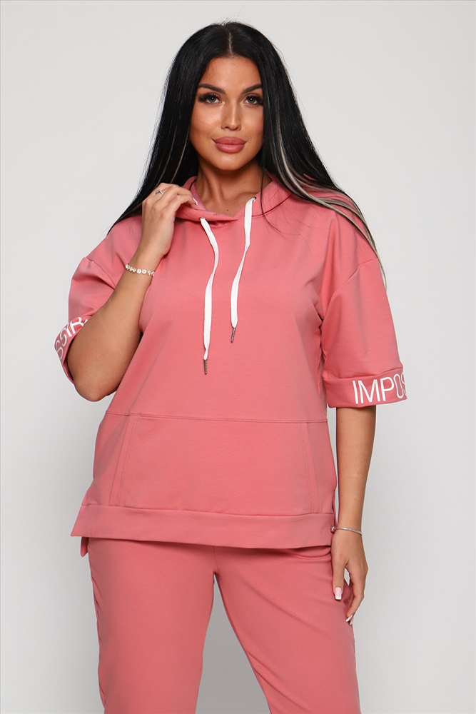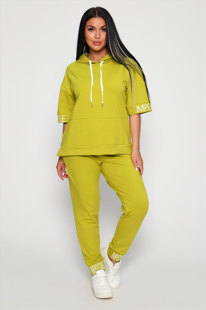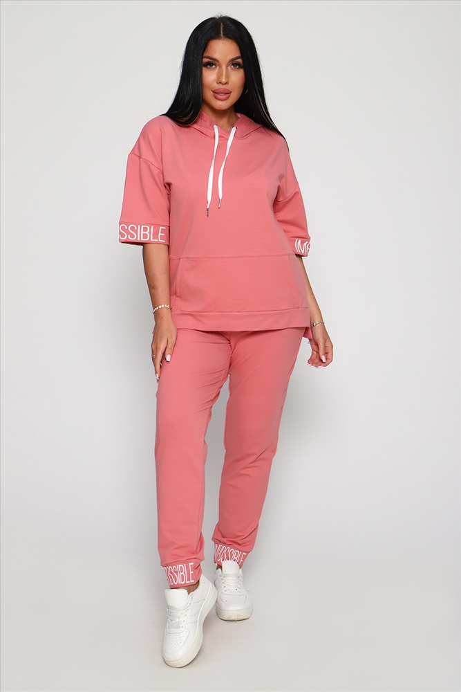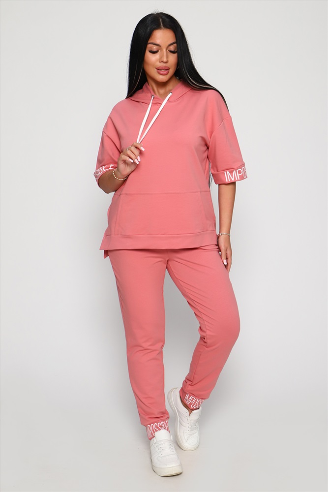 Застежка: без застежки Костюм женский их футера 2‑х нитки с лайкрой. Очень интересная модель, кофта удлинённая по бокам разрезы, рукава до локтя, на манжетах принт, карман кенгуру, брюки с карманами прямой посадки снизу на манжетах. На модели 48-50 размер.