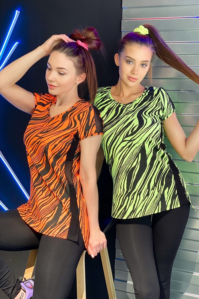 Комплект состоит из футболки и леггинсов. Леггинсы облегающие, на резинке. Футболка полуприлегающего силуэта, с V-образной горловиной, с удлиненной спинкой, с лампасами из сетки по боковым швам. В нижней части боковых швов обработаны разрезы. Рукав втачной, короткий, со вставкой из сетки. Горловина и низ рукавов обработана бейкой из основного полотна.