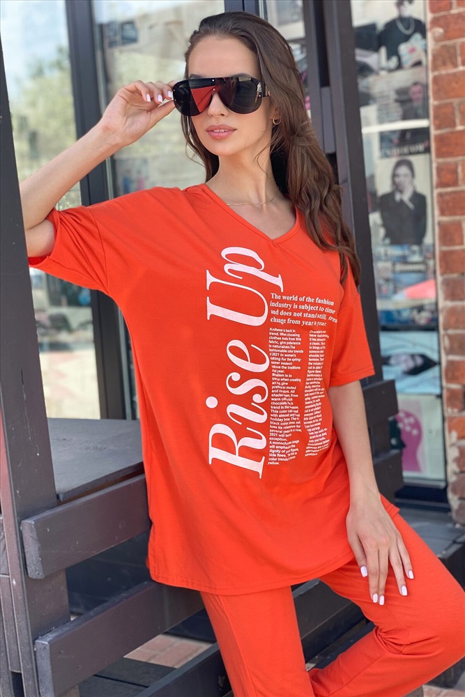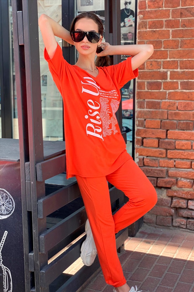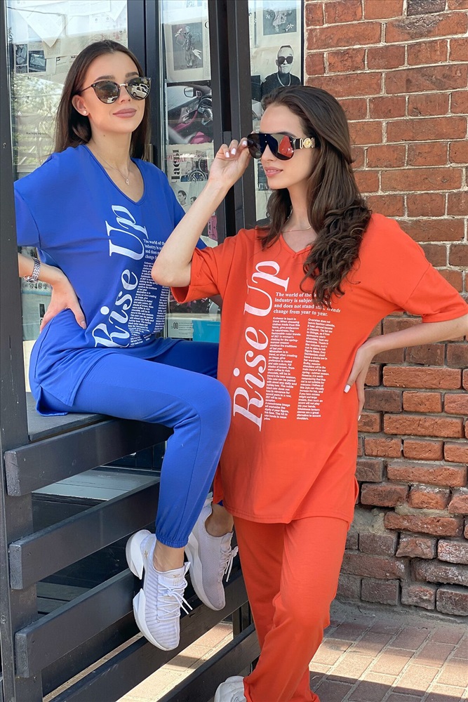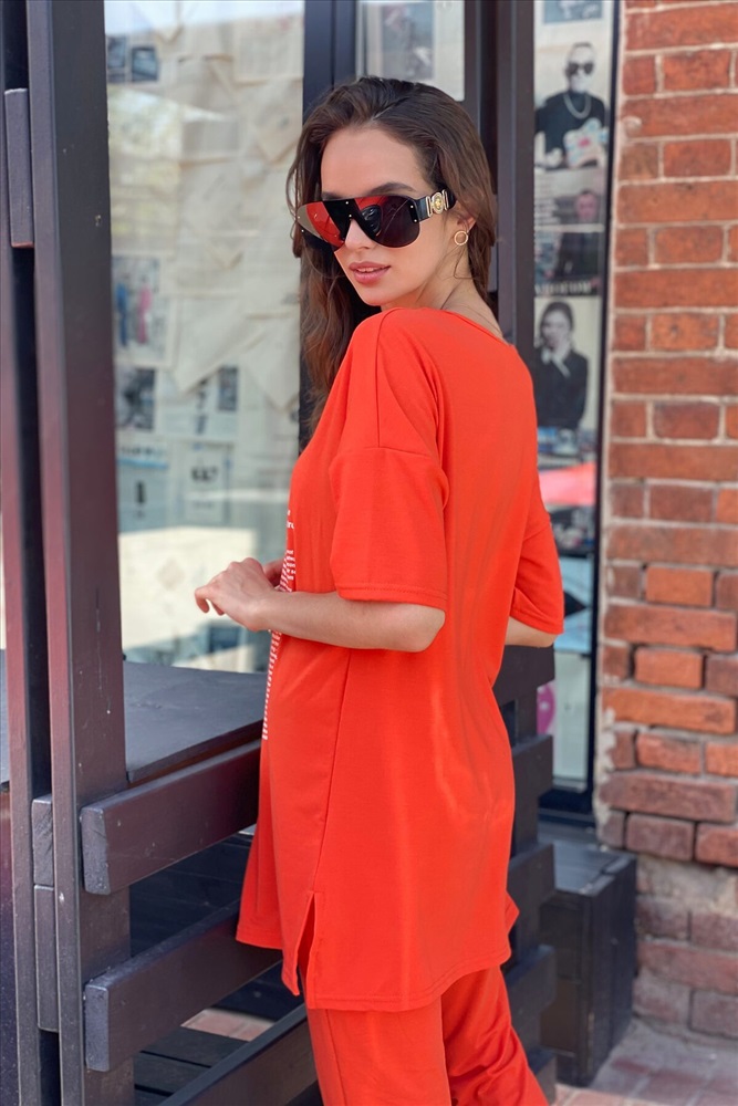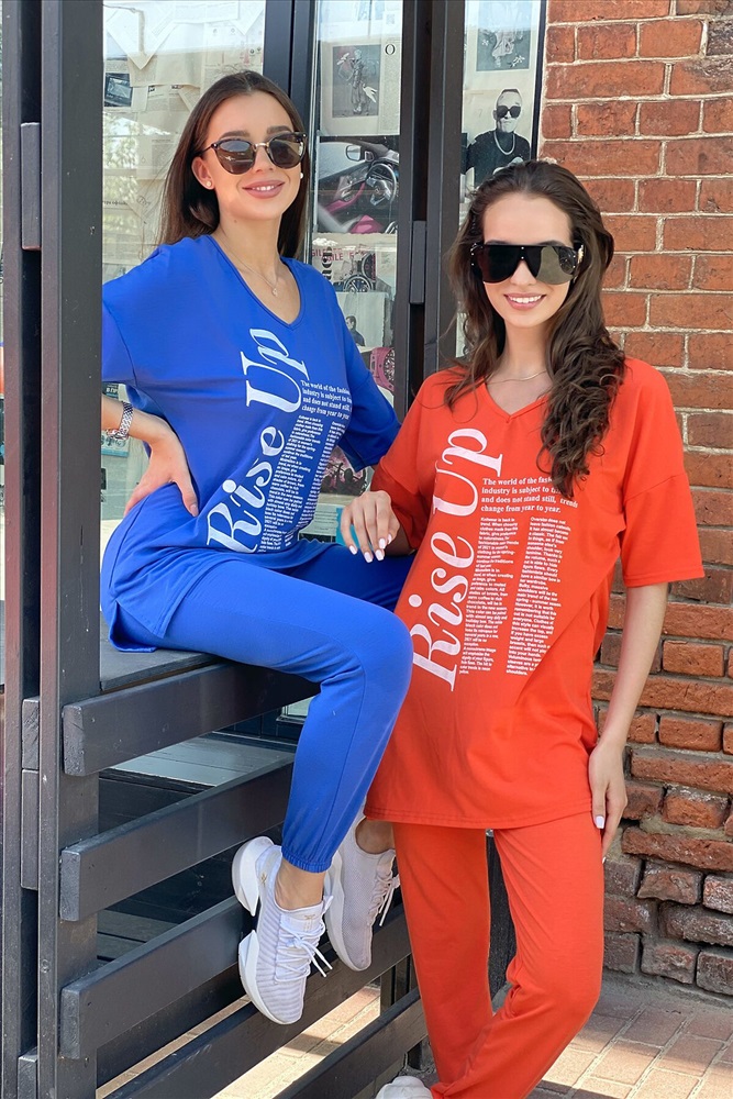 Комплект состоит из туники и брюк. Туника прямого силуэта, с V-образной горловиной, с удлиненной спинкой, с разрезами в нижней части боковых швов. Рукав короткий. Горловина обработана бейкой из основного полотна. Брюки длинные, с карманами, с кокеткой сзади, на эластичном поясе. Низ брюк на резинке.