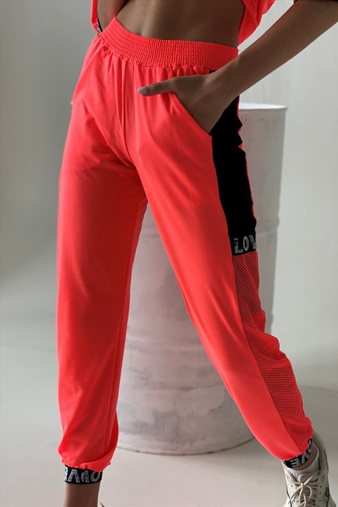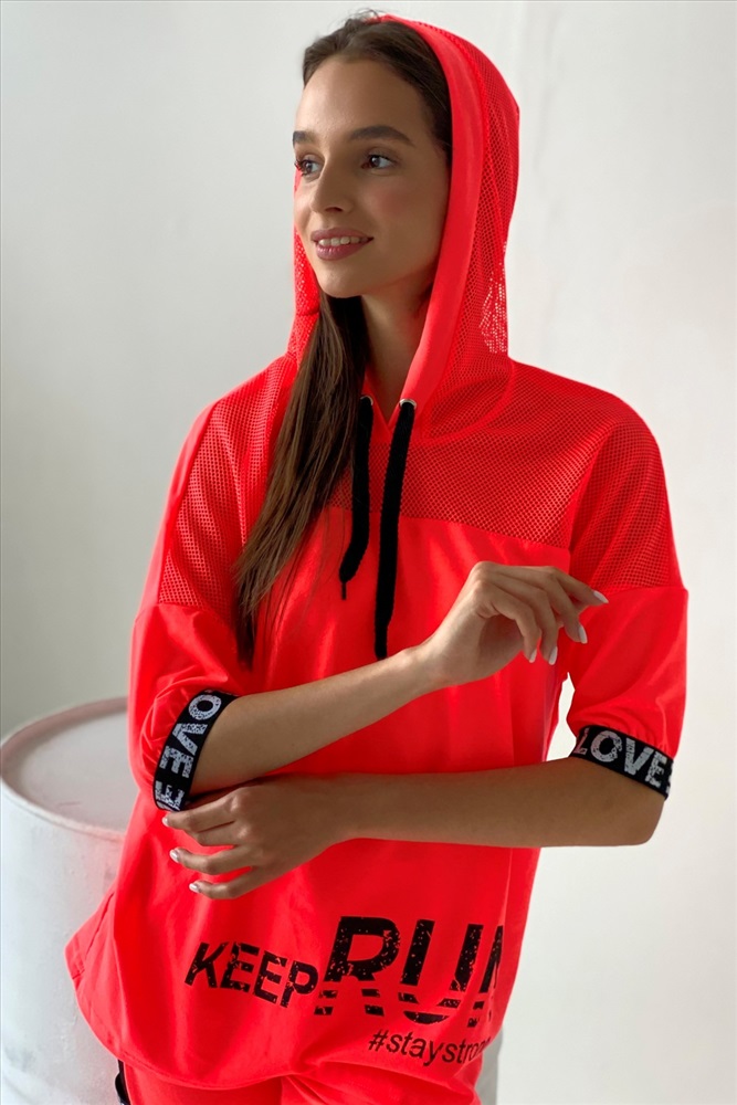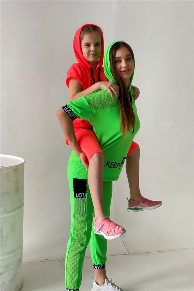 Застежка: без застежки Костюм состоит из туники и брюк. Туника прямая, свободная, с капюшоном из сетки, с удлиненной спинкой. Рукав короткий, обработанный декоративной резинкой. Кокетка полочки выполнена из сетки. Вдоль центра спинки расположена декоративная вставка из отделочного полотна и сетки. Брюки свободные, длинные, с карманами, на эластичном поясе. Низ брюк обработан декоративной резинкой. Вдоль боковых швов расположен лампас из отделочного полотна и сетки. В средней части лампаса расположен карман.