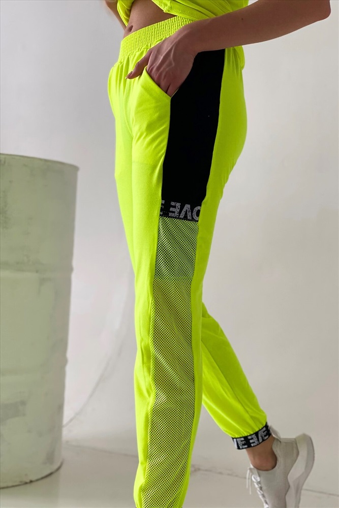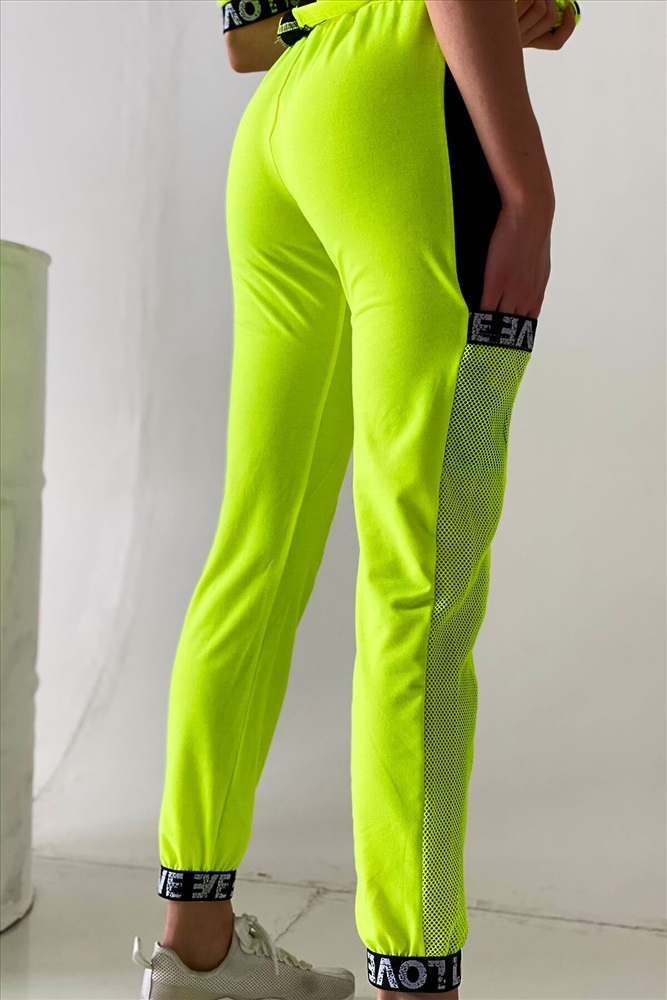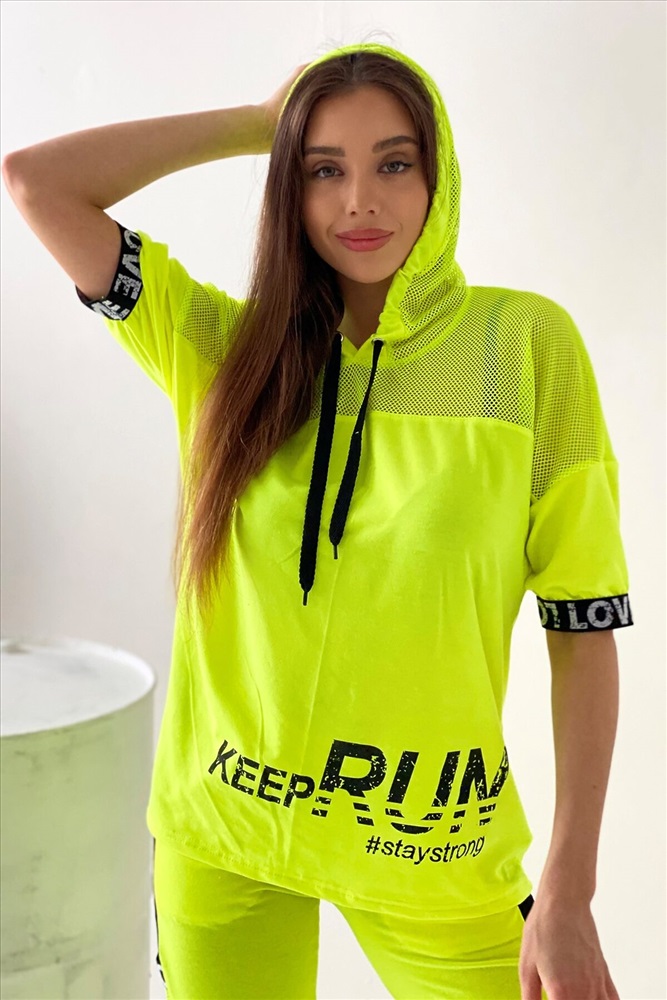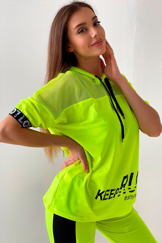 Костюм состоит из туники и брюк. Туника прямая, свободная, с капюшоном из сетки, с удлиненной спинкой. Рукав короткий, обработанный декоративной резинкой. Кокетка полочки выполнена из сетки. Вдоль центра спинки расположена декоративная вставка из отделочного полотна и сетки. Брюки свободные, длинные, с карманами, на эластичном поясе. Низ брюк обработан декоративной резинкой. Вдоль боковых швов расположен лампас из отделочного полотна и сетки. В средней части лампаса расположен карман.