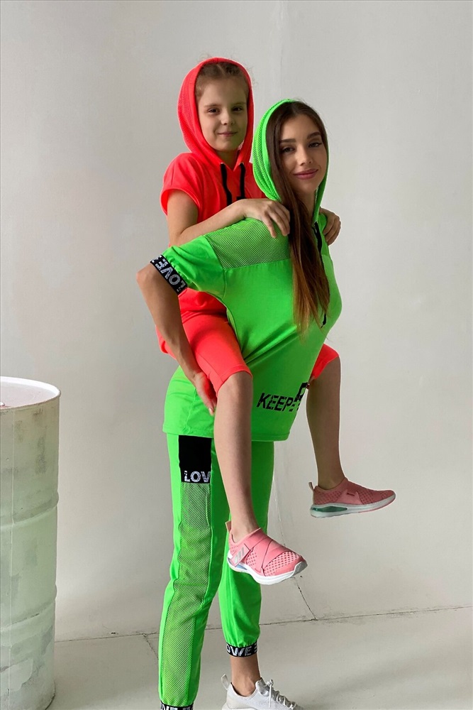 Костюм состоит из туники и брюк. Туника прямая, свободная, с капюшоном из сетки, с удлиненной спинкой. Рукав короткий, обработанный декоративной резинкой. Кокетка полочки выполнена из сетки. Вдоль центра спинки расположена декоративная вставка из отделочного полотна и сетки. Брюки свободные, длинные, с карманами, на эластичном поясе. Низ брюк обработан декоративной резинкой. Вдоль боковых швов расположен лампас из отделочного полотна и сетки. В средней части лампаса расположен карман.