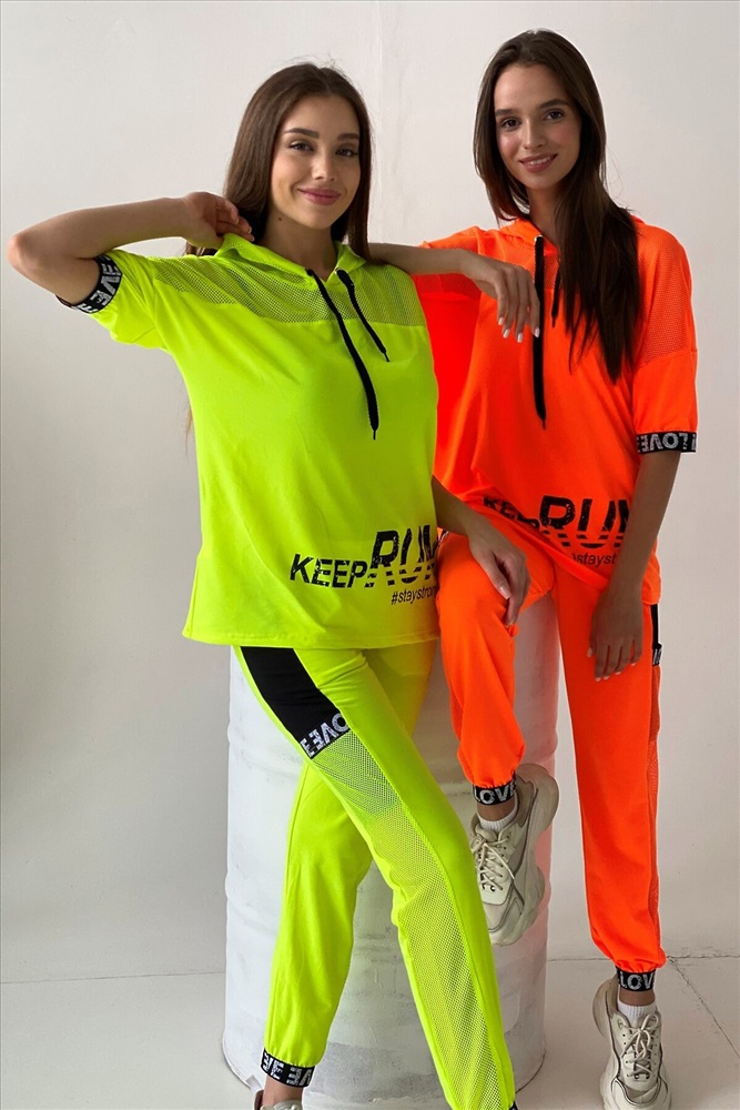 Костюм состоит из туники и брюк. Туника прямая, свободная, с капюшоном из сетки, с удлиненной спинкой. Рукав короткий, обработанный декоративной резинкой. Кокетка полочки выполнена из сетки. Вдоль центра спинки расположена декоративная вставка из отделочного полотна и сетки. Брюки свободные, длинные, с карманами, на эластичном поясе. Низ брюк обработан декоративной резинкой. Вдоль боковых швов расположен лампас из отделочного полотна и сетки. В средней части лампаса расположен карман.