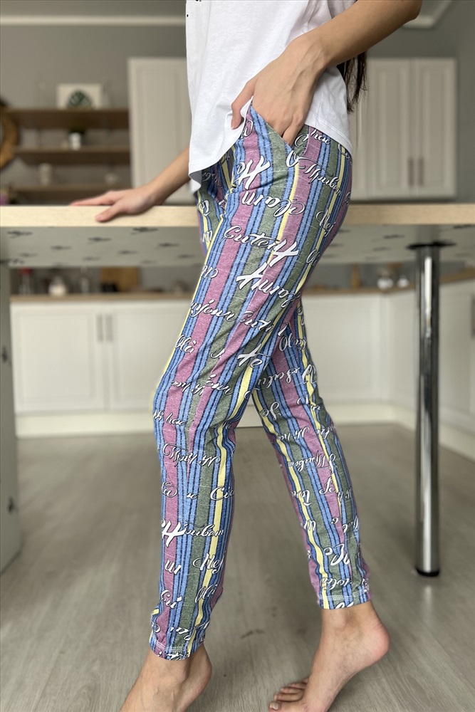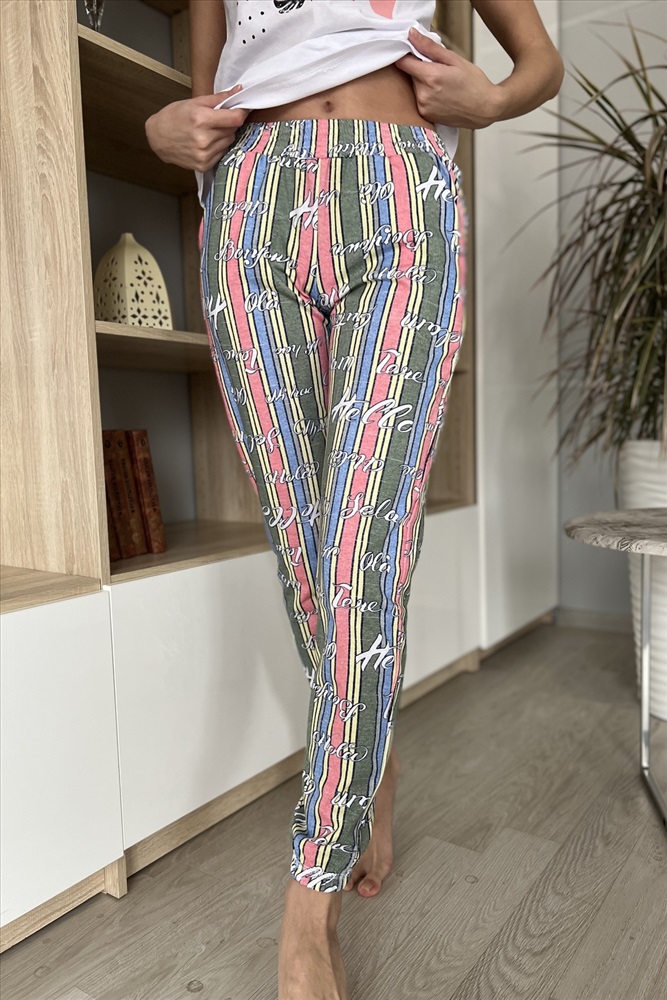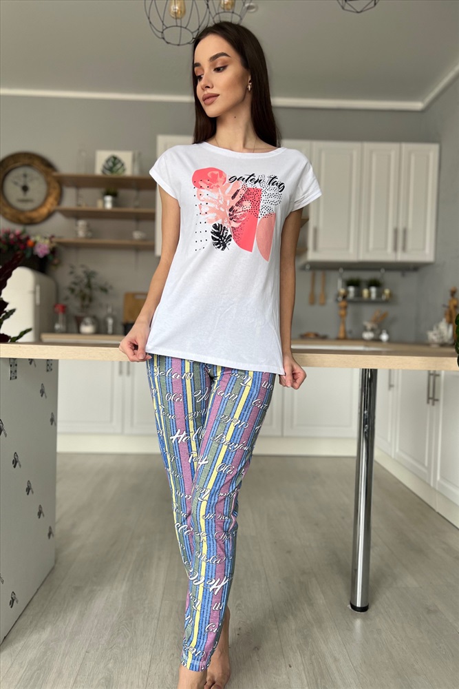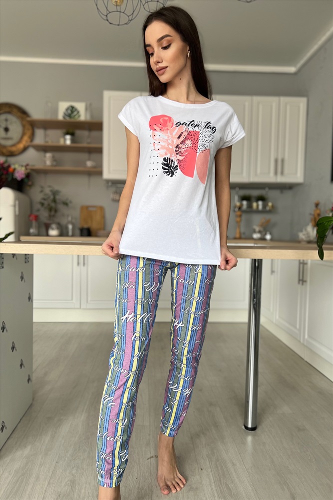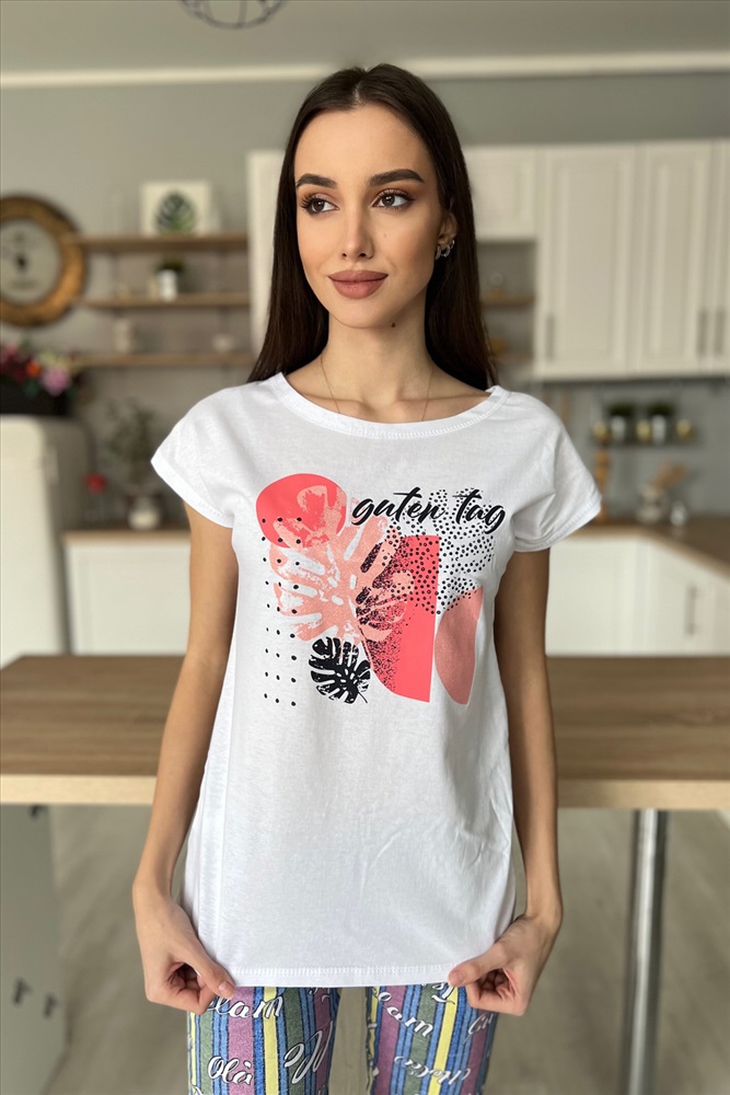 Застежка: без застежки Комплект состоит из футболки и брюк. Брюки свободные, длинные, с карманами, на эластичном поясе, с резинкой по низу. Футболка полуприлегающего силуэта, с округлой горловиной, длиной до середины бедра. Рукав втачной короткий. В верхней части спинки обработан декоративный вырез. Горловина, низ рукавов и вырез на спинке обработаны бейкой из основного полотна с отделочным кантом.
