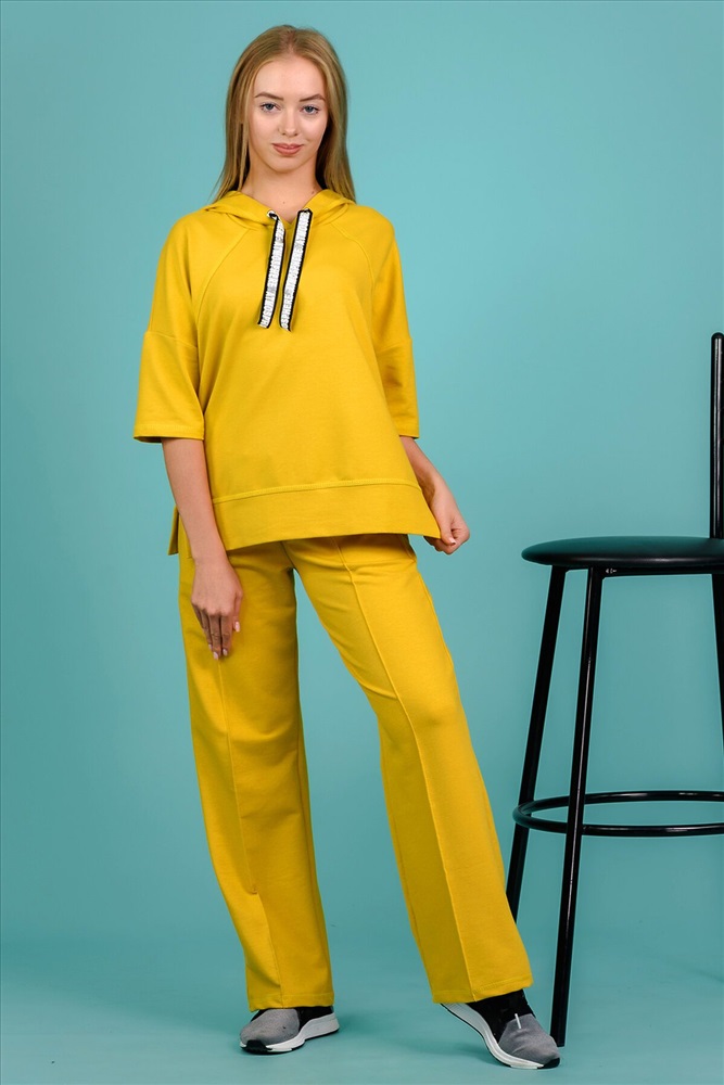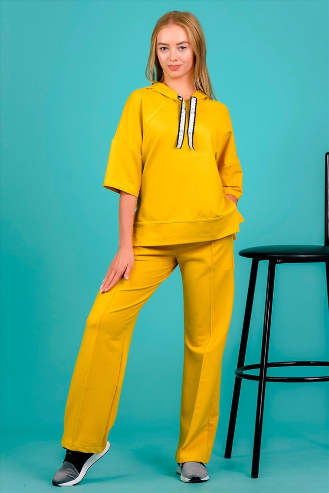 Костюм состоит из толстовки и брюк. Толстовка прямая, свободная, с капюшоном, с коротким рукавом. На полочке расположены симметричные фигурные кокетки. В нижней части боковых швов обработаны разрезы. Низ полочки и спинки завершены поясом. Брюки свободные, прямые, со стрелками, с карманами, на поясе.