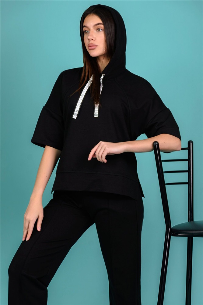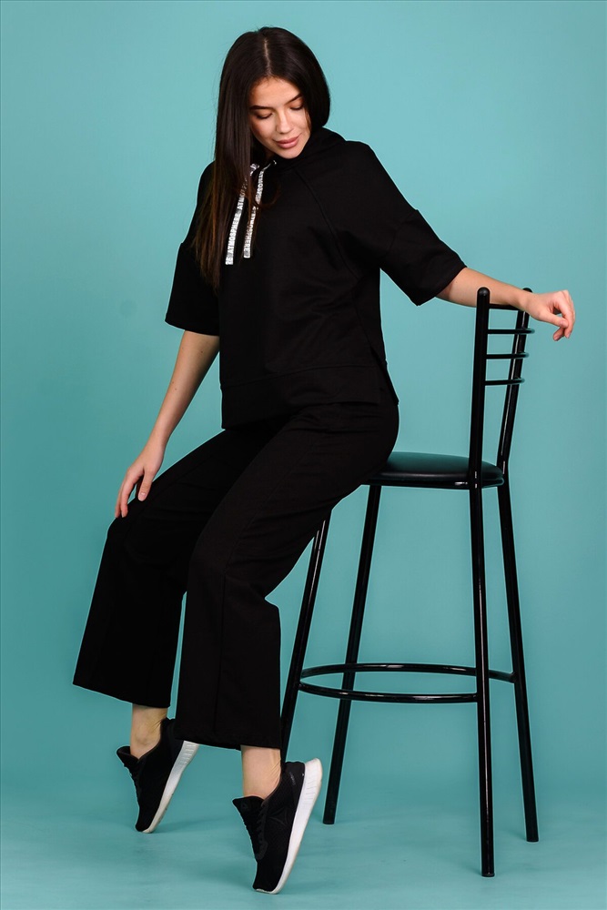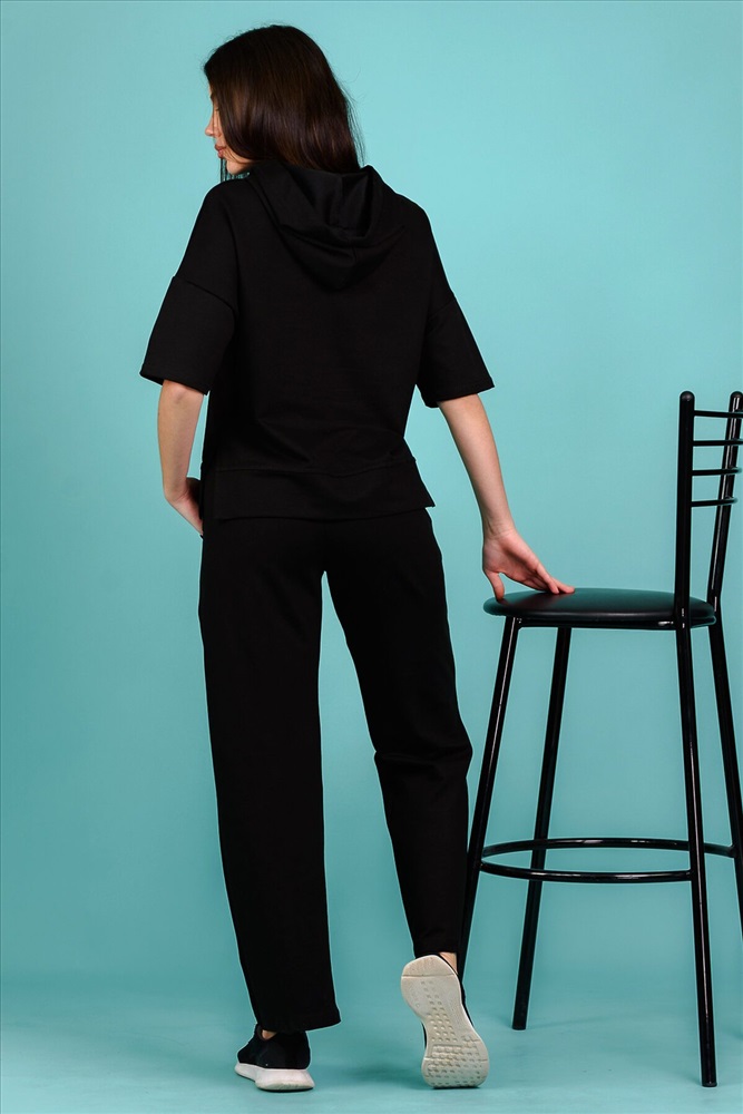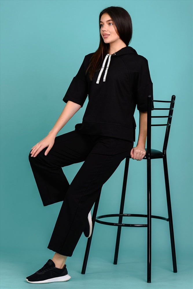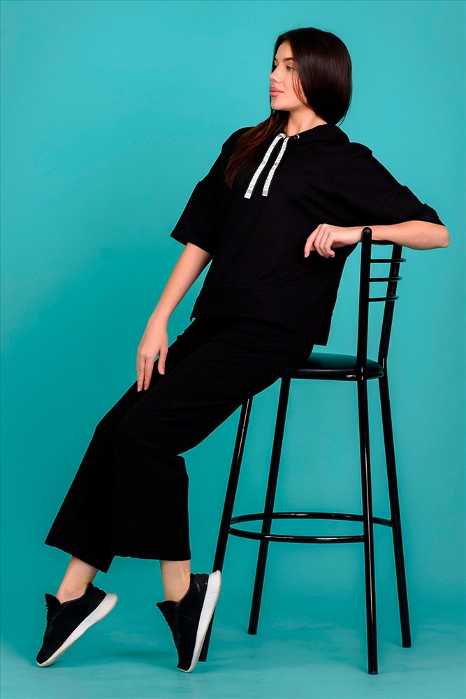 Костюм состоит из толстовки и брюк. Толстовка прямая, свободная, с капюшоном, с коротким рукавом. На полочке расположены симметричные фигурные кокетки. В нижней части боковых швов обработаны разрезы. Низ полочки и спинки завершены поясом. Брюки свободные, прямые, со стрелками, с карманами, на поясе.
